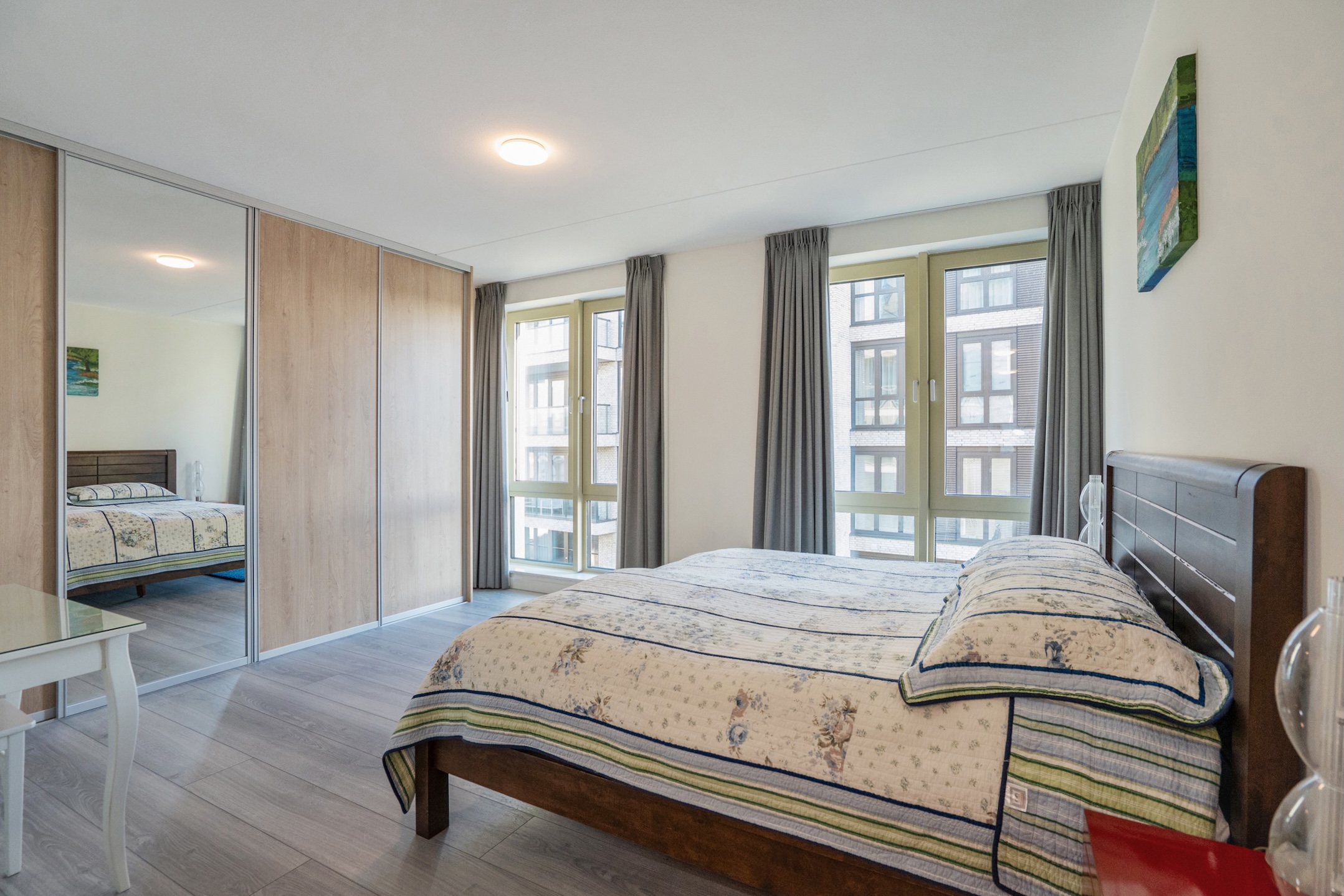 This property has 3 full-sized bedrooms. Immediately on the right side of the hallway, you will find the first 2 bright bedrooms. The described hallway leads to a spacious hall with double wardrobes arranged in a corner setup, access to a bathroom, and a generous master bedroom, which also has a large wardrobe wall and 2 large windows. Then there is the spacious bathroom, featuring a dark gray tiled floor, towel radiator, wide vanity unit with double sinks and faucets, a bathtub, a deep walk-in shower, and the 3rd wall-mounted toilet.