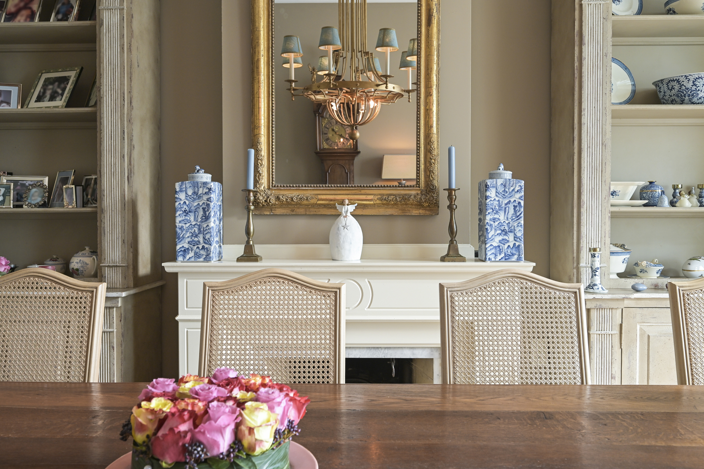 Layout: entrance, vestibule with built-in wardrobes and draft separation, hallway with storage space under the stairs, modern toilet with washbasin, and access to the cellar. Delightful, spacious living/dining room with suite separation featuring high sliding doors and built-in cupboards. Both rooms feature high ornate ceilings, beautiful oak parquet floors, and marble fireplaces with (gas) fires. The back room is connected to the full-width eat-in kitchen by a transparent partition, featuring built-in appliances, an island, and a gas fireplace. Double French doors lead to the delightfully private rear garden with a back entrance.