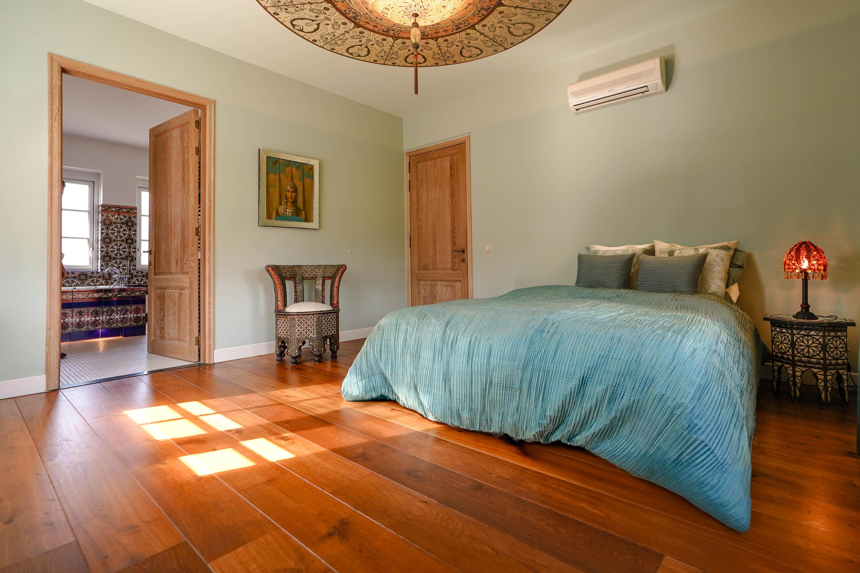 Architectural details make this villa truly distinctive: four arched windows, a curved glass central bay, hand-formed brickwork, and a robust oak front door with custom wrought iron hardware. The interior is filled with carefully selected materials, highlighted by a sculpted oak staircase from Luc Steels, solid wooden flooring, and an open flow between living spaces. Light is drawn from skylights and broad glazed facades, creating an uplifting atmosphere throughout the home.