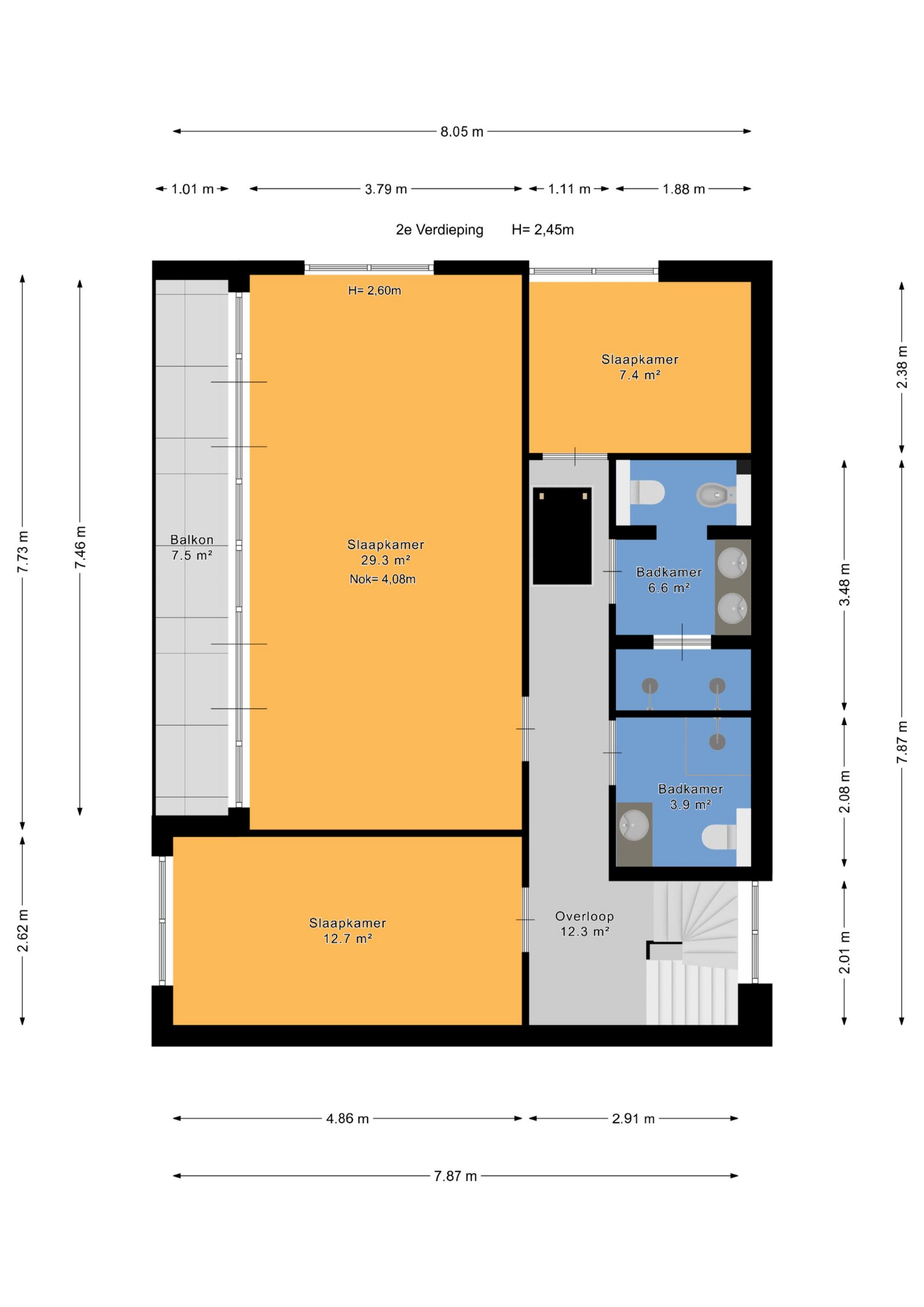 The second floor features three bedrooms (previously four), a spacious, sunny balcony, and two modern bathrooms. The master bedroom also has a loft-like feel with exposed rafters. From the hallway, there is access to an attic housing a heat recovery system, and a fixed staircase leads to the sunny rooftop terrace with panoramic views of The Hague.
