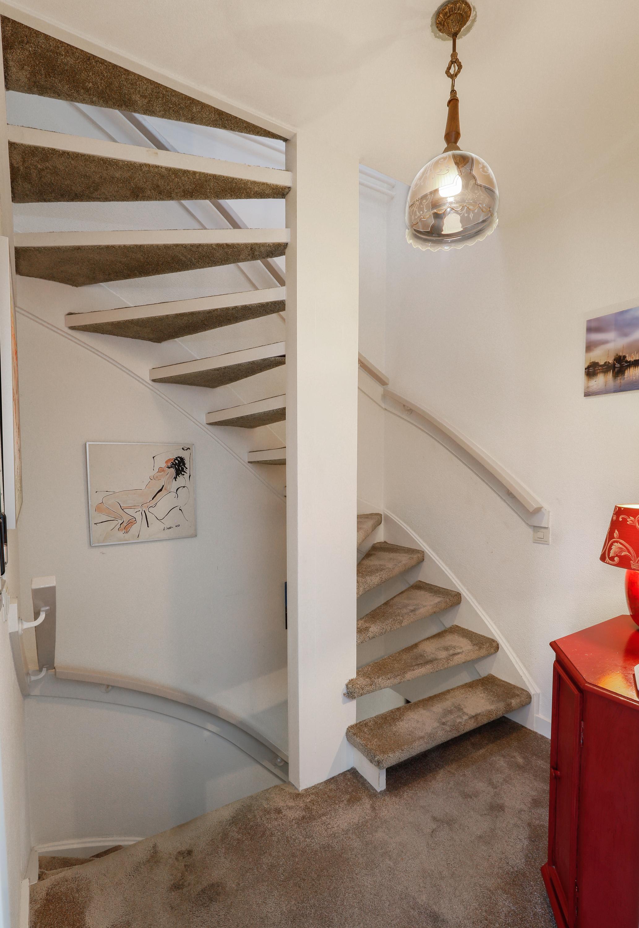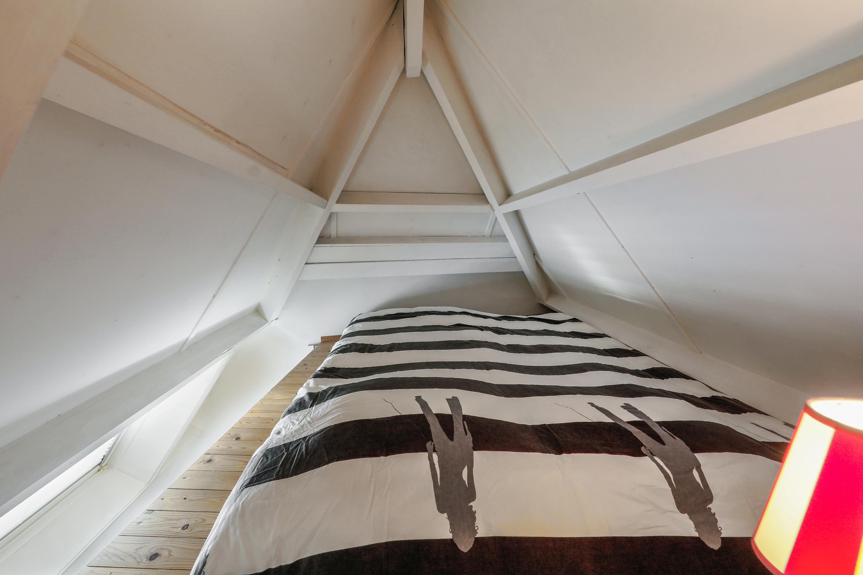 The upper floor features two bedrooms. The main bedroom is located at the front under the roof and has a charming atmosphere thanks to the high ceiling and dormer window. The second bedroom is also spacious and versatile.
