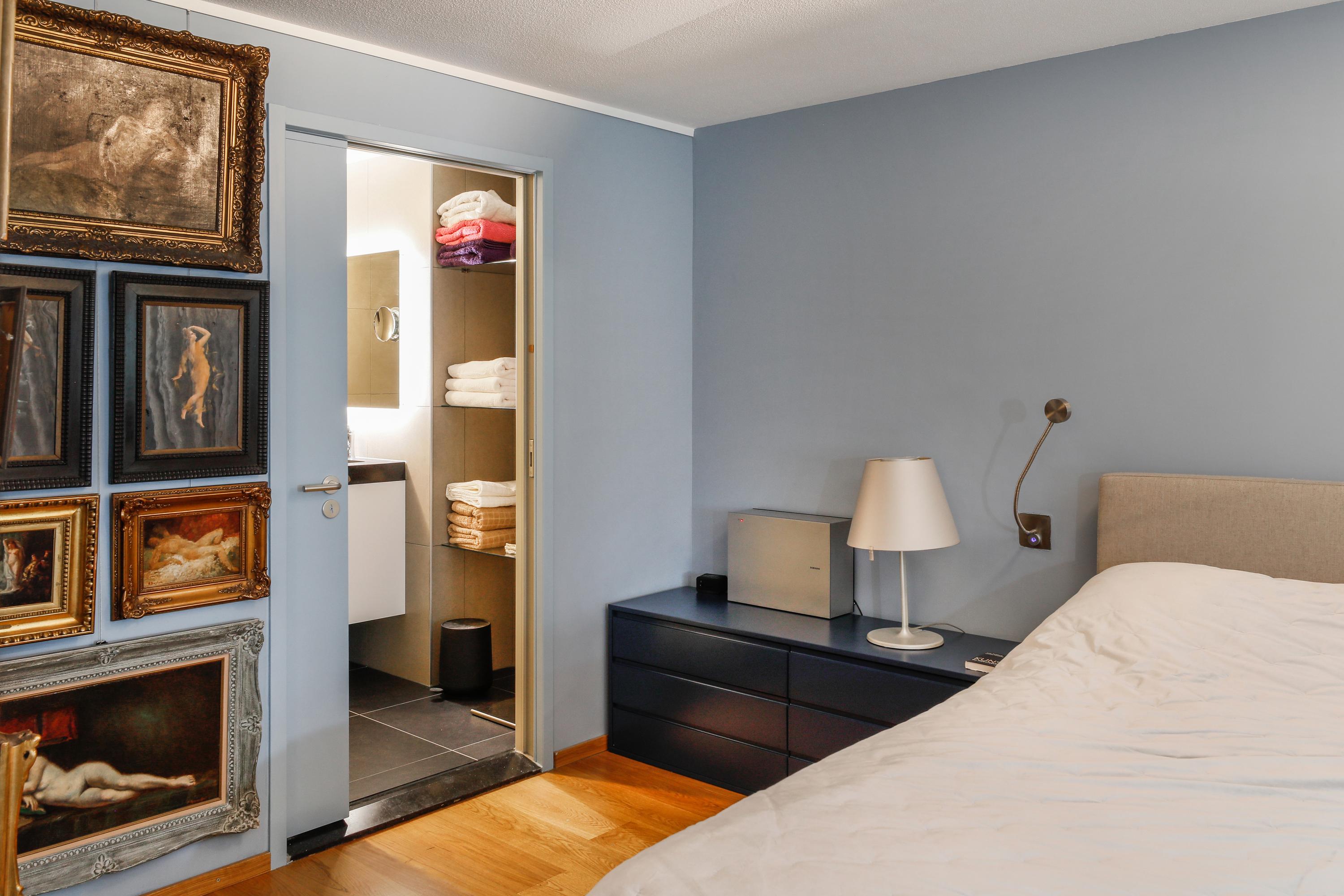 The bedroom is designed so that you'll have everything you need right at your fingertips. Naturally, there's plenty of space for the bed and bedside tables. Through the sliding door into the living room and further through the tall windows in the living room, you have a beautiful view of the courtyard. The bathroom and walk-in dressing room are en suite to this bedroom. There's also plenty of room for a sofa and TV. The walk-in dressing room was created from an originally planned mezzanine. A truly wonderful and very rewarding space. The dressing room is fully equipped for organized and practical storage of all your clothes.