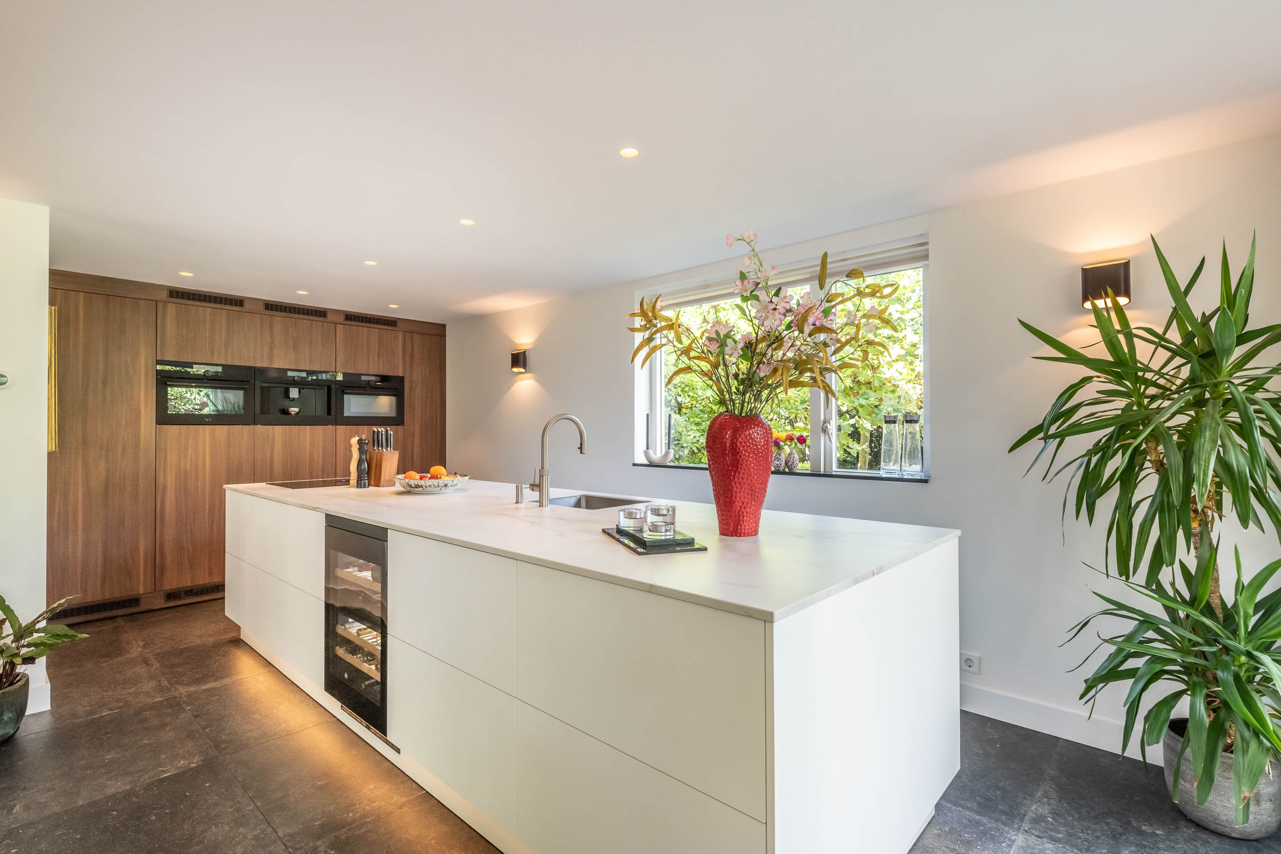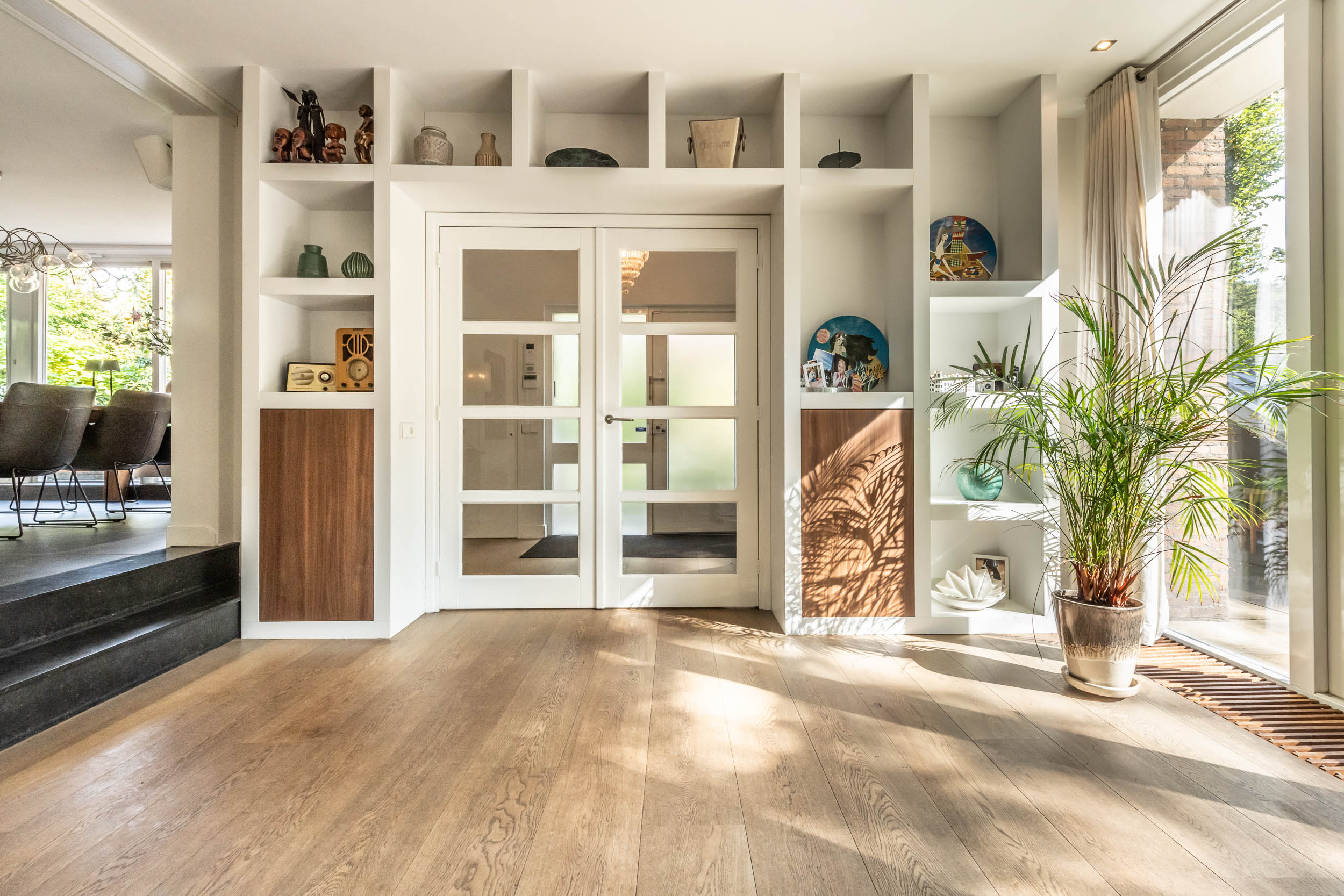 Entrance hall, spacious hallway with toilet and urinal, bright and spacious living room with fireplace, oak flooring and doors to the front terrace. A double door connects to the second living room/TV room with large windows and a view of the back garden. Luxurious, tailor-made kitchen-diner (’t Spant in Heemstede, 2022) featuring underfloor heating, a sink/kitchen island and various built-in appliances: wine climate cabinet, ovens, Quooker with sparkling water feature, coffee machine, Bora electric hob with flex zones and dishwasher. Door to the side garden.