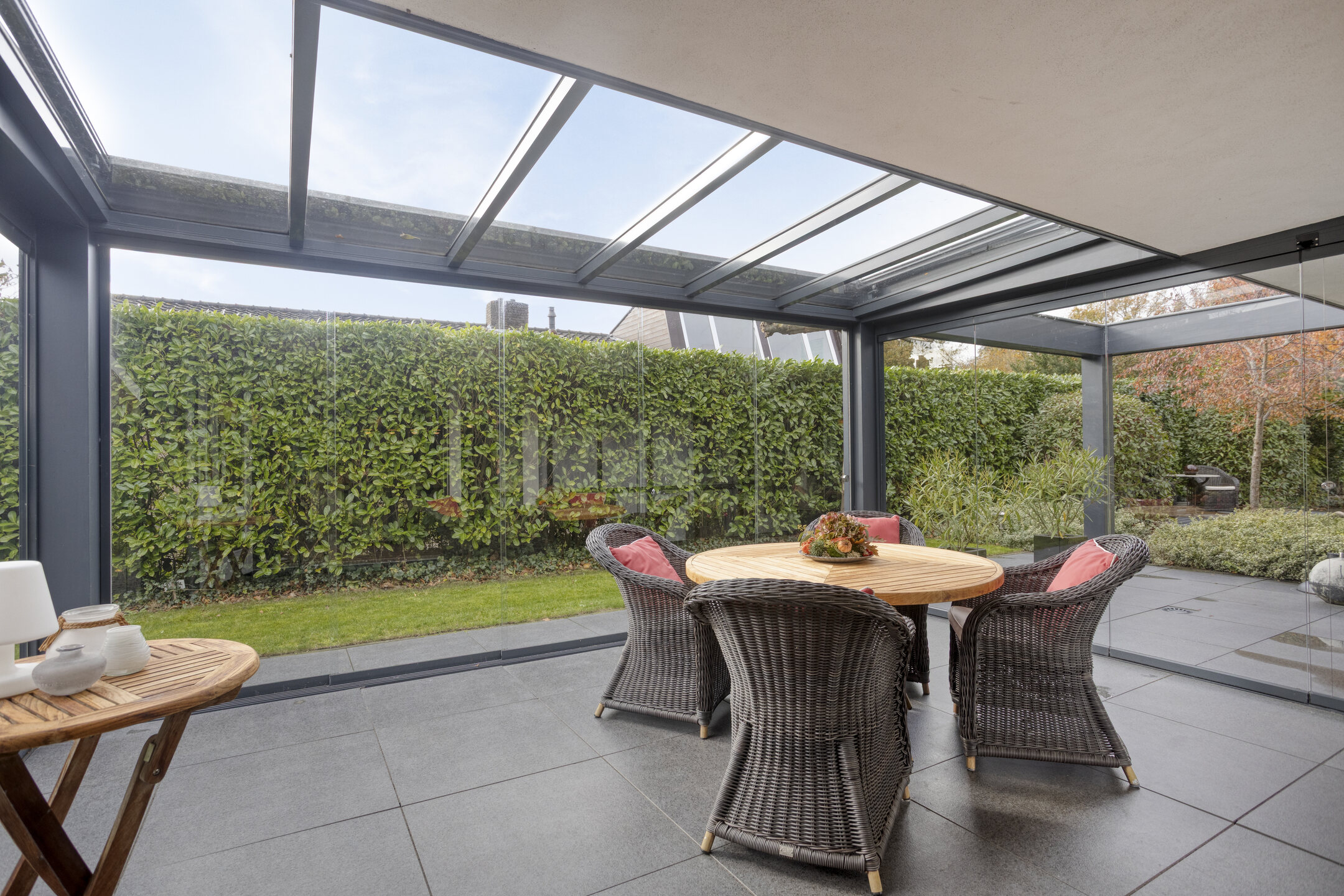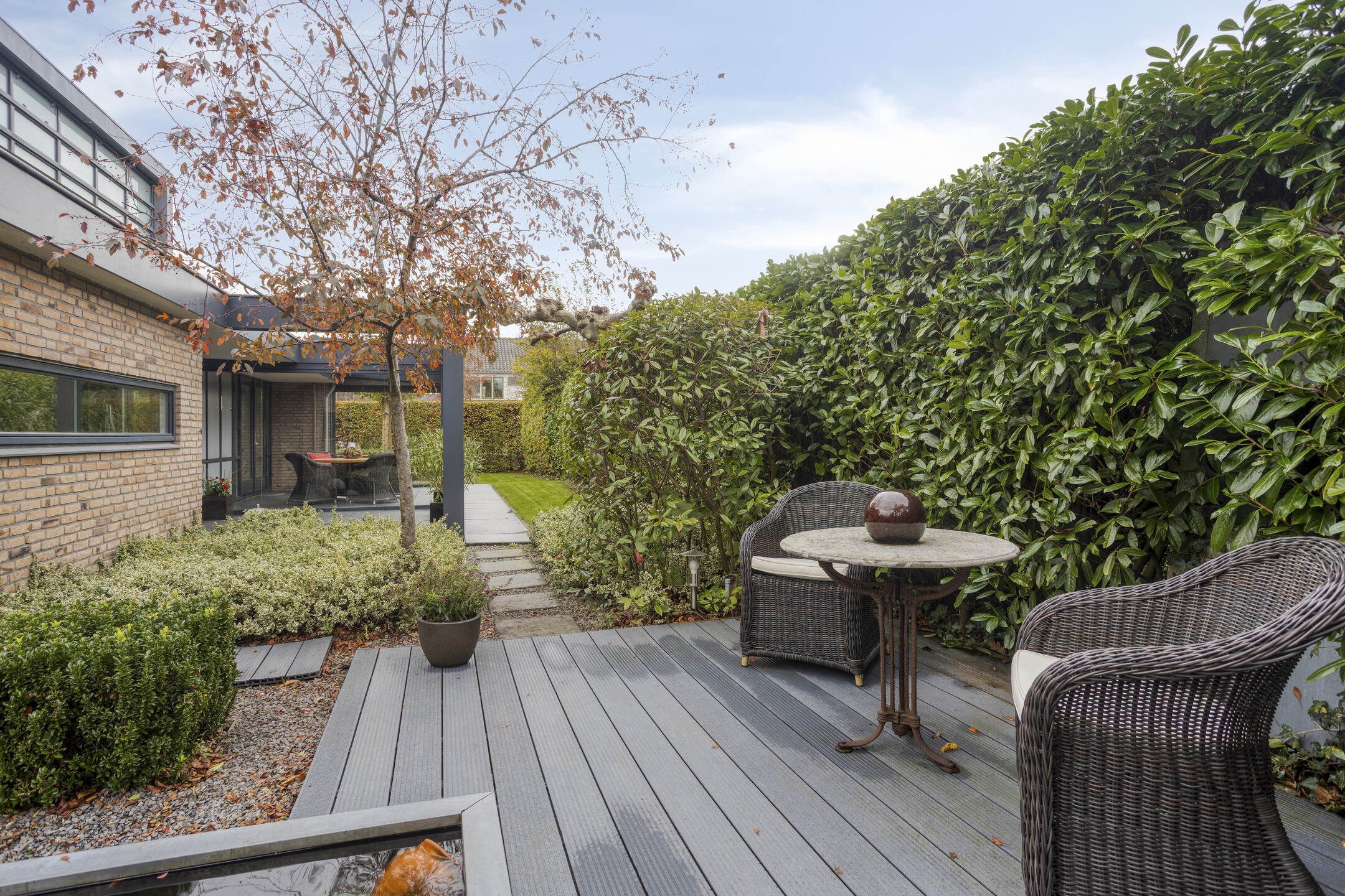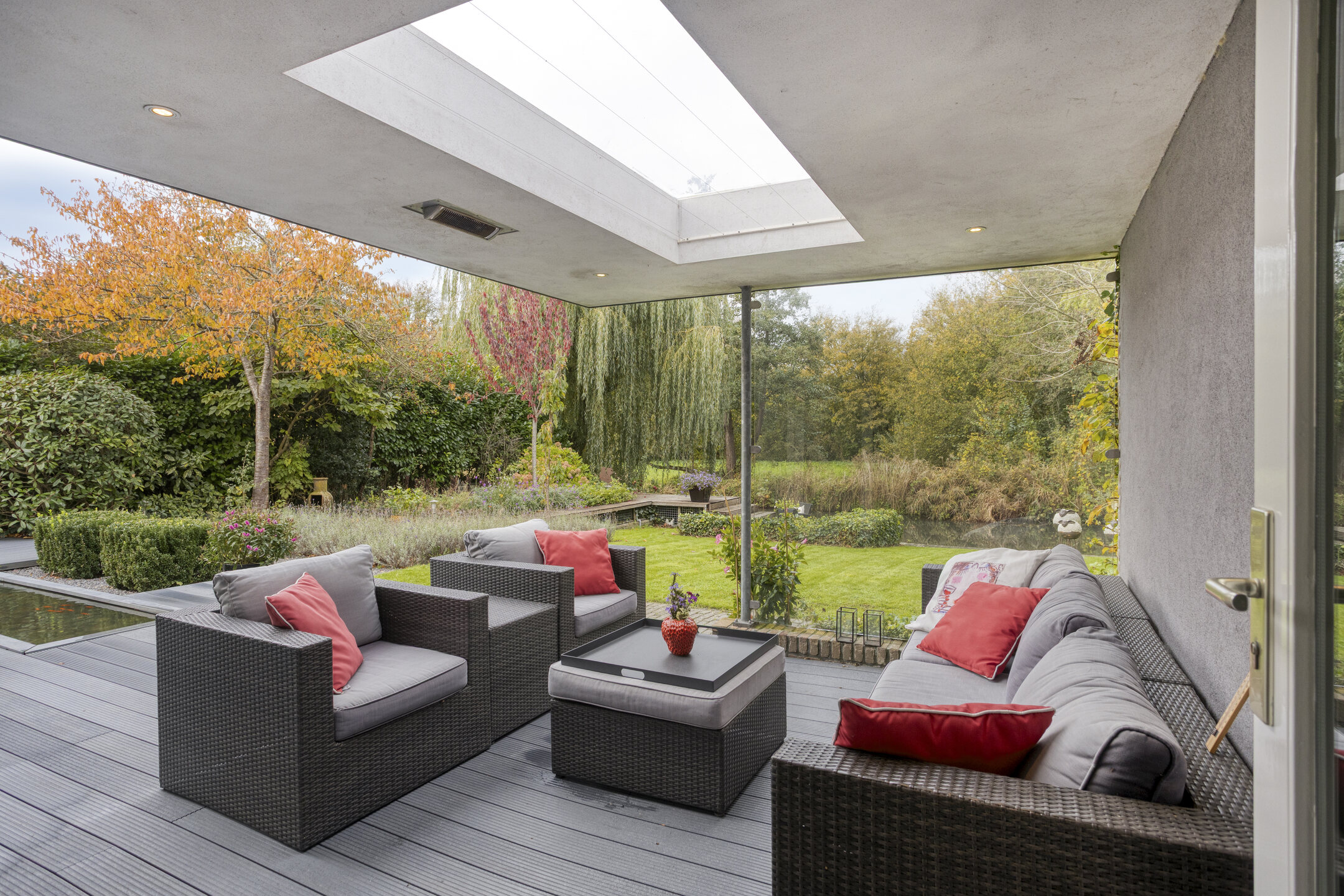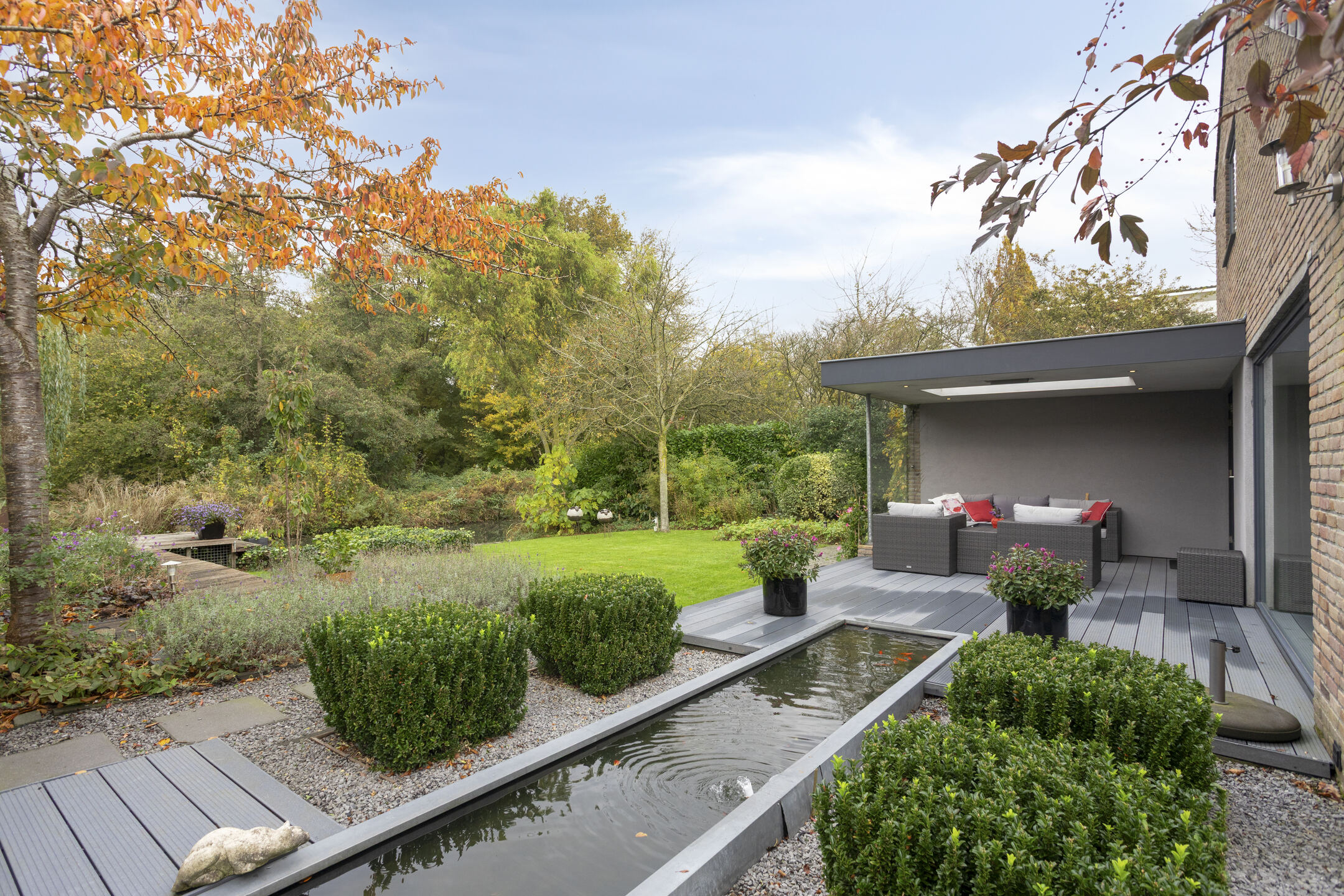 The garden is a true work of art — designed by a landscape architect and meticulously maintained. On the south side, you’ll find a delightful conservatory that can be fully opened up, allowing you to enjoy it all year round. It is equipped with an electric sunshade. Further into the garden lies a reflecting pond that leads to a charming veranda with roof covering and LED outdoor lighting.