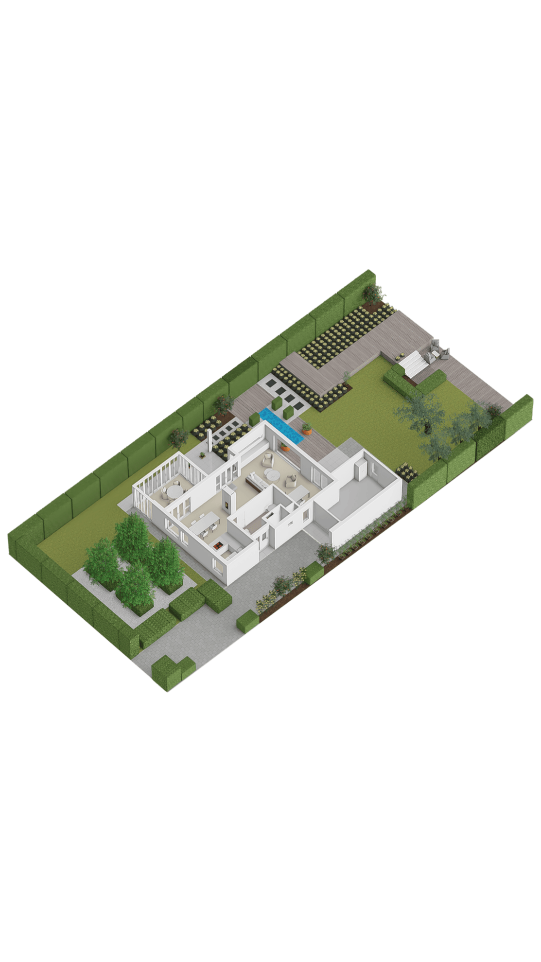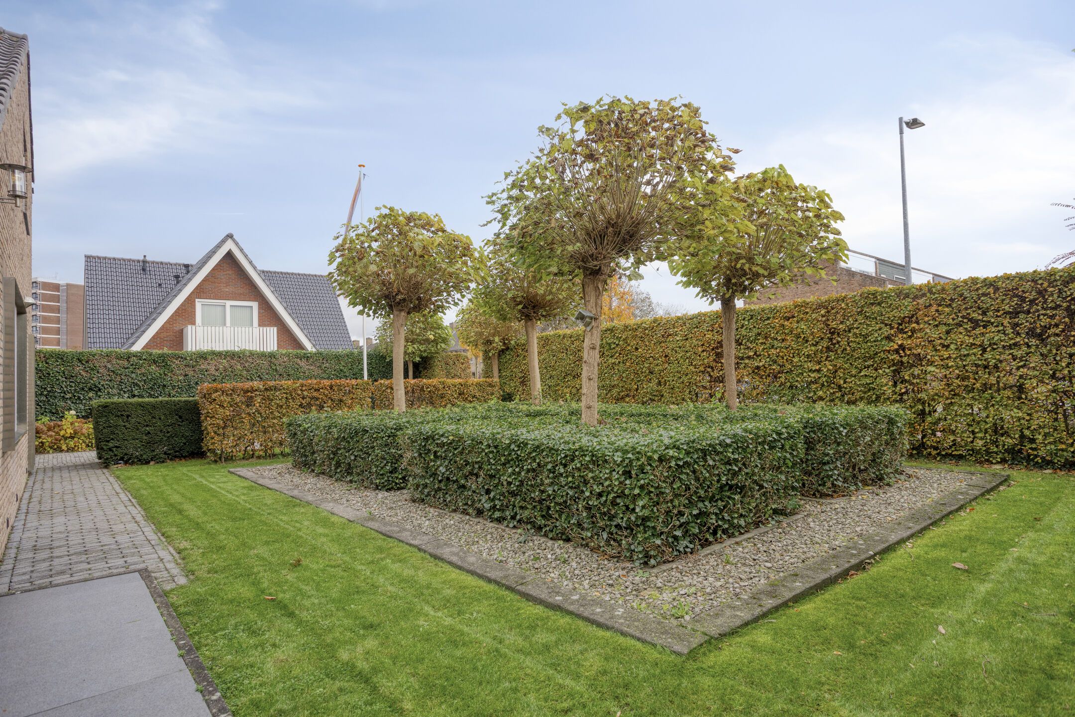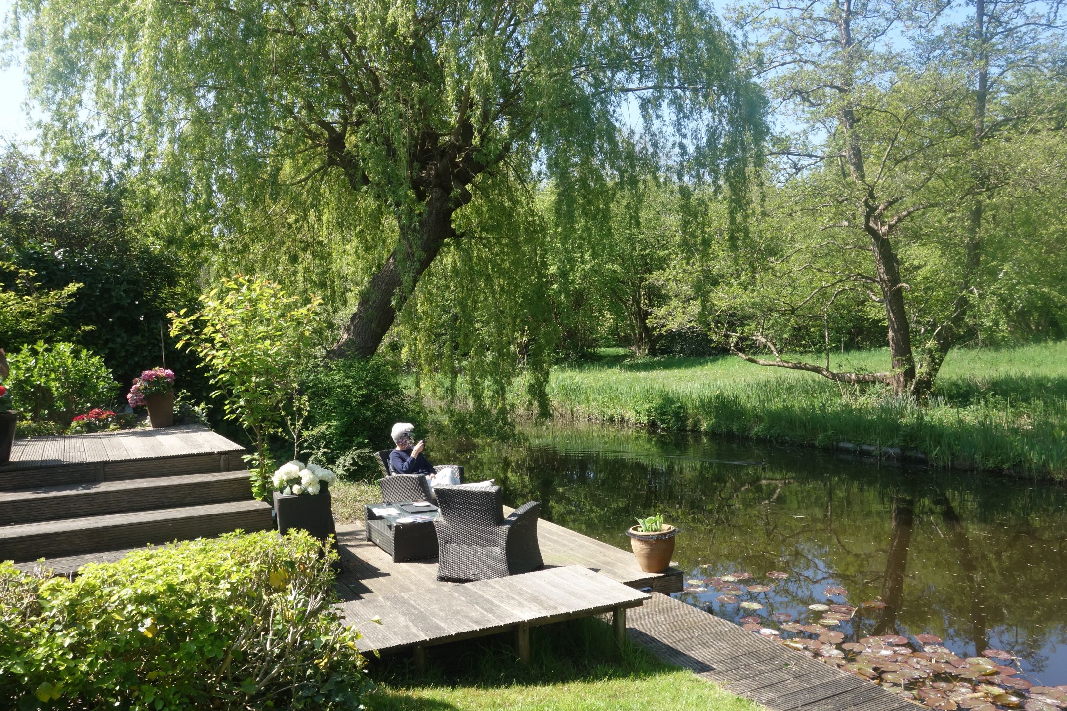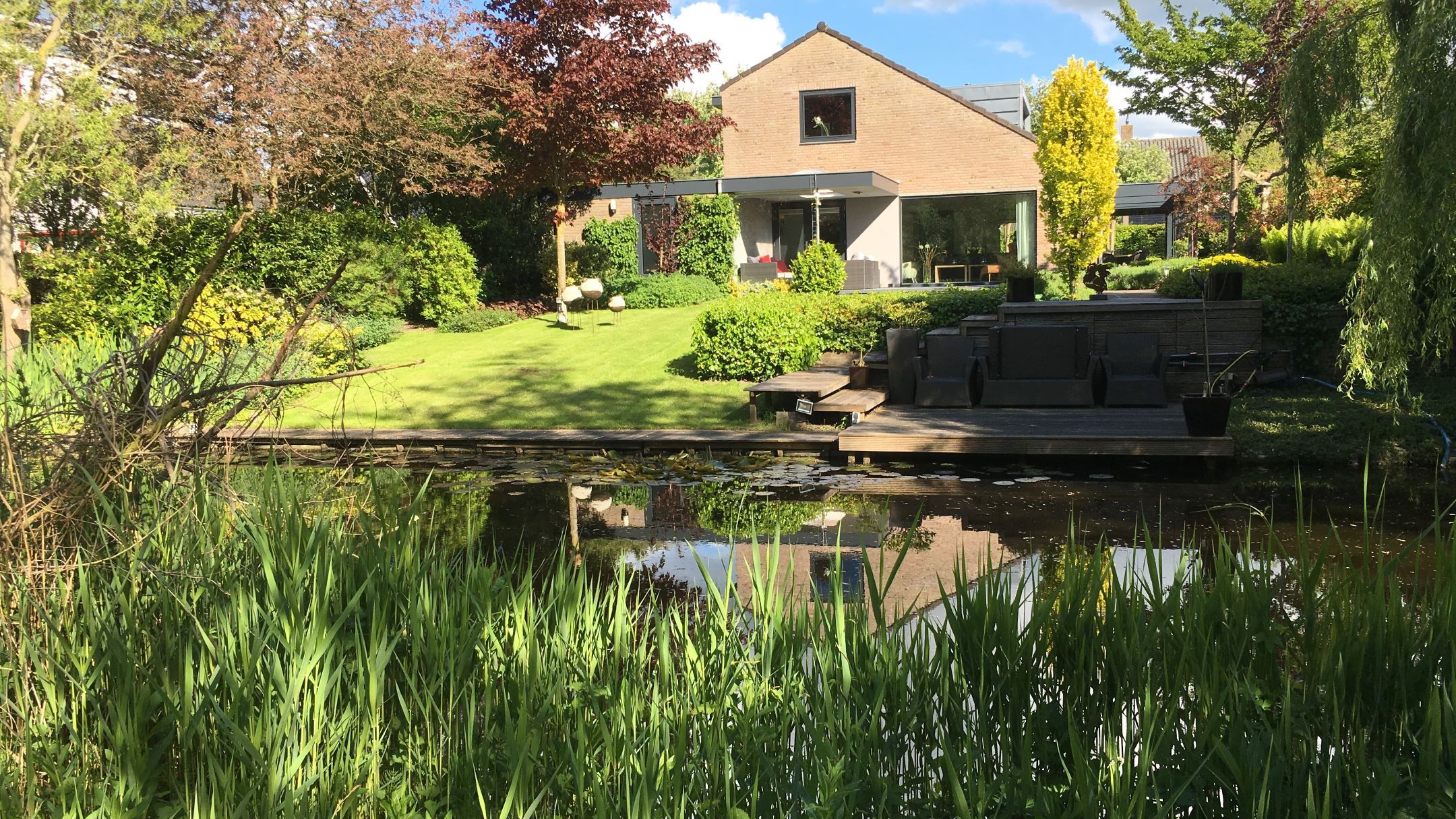 The garden is a true work of art — designed by a landscape architect and meticulously maintained. On the south side, you’ll find a delightful conservatory that can be fully opened up, allowing you to enjoy it all year round. It is equipped with an electric sunshade. Further into the garden lies a reflecting pond that leads to a charming veranda with roof covering and LED outdoor lighting.