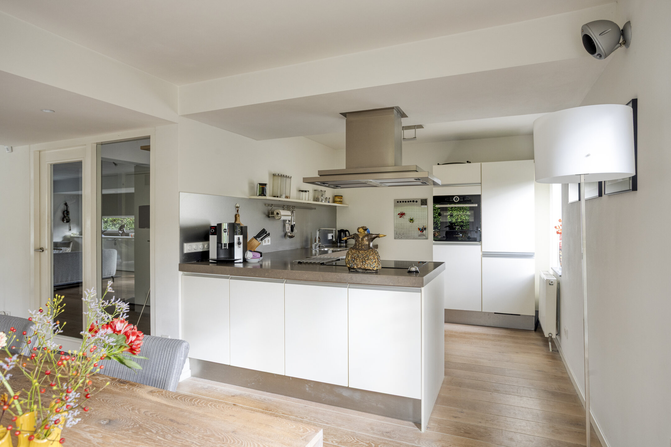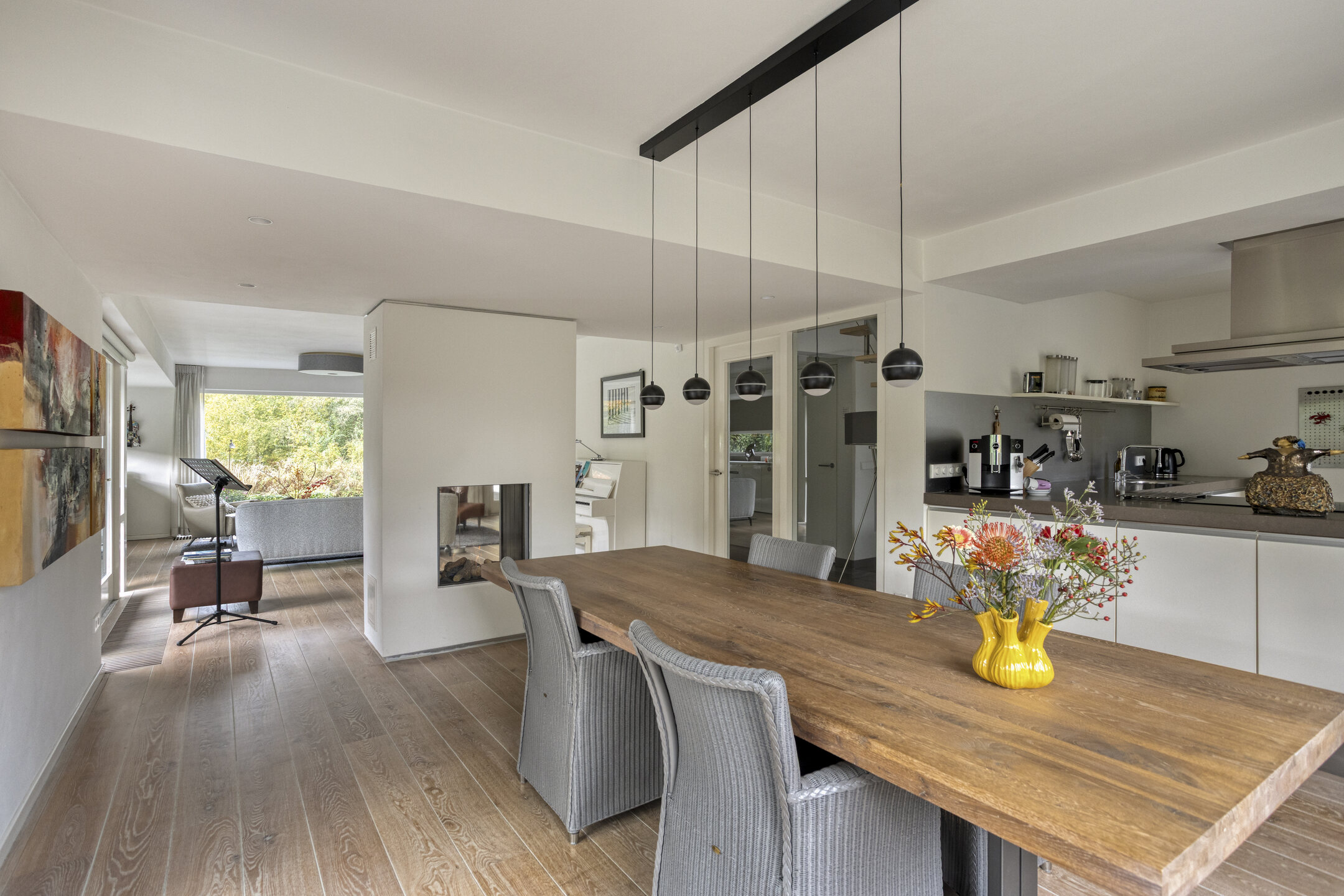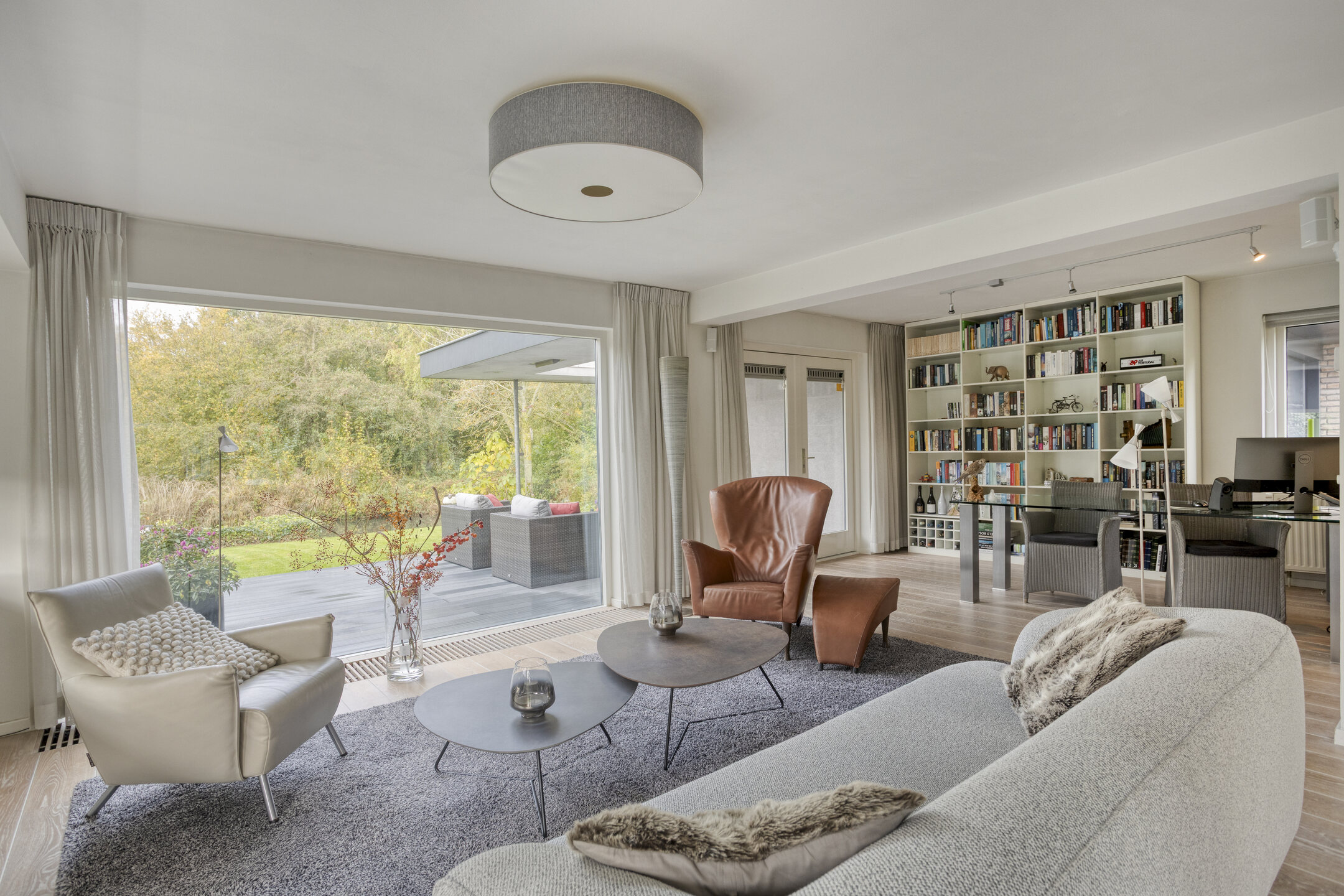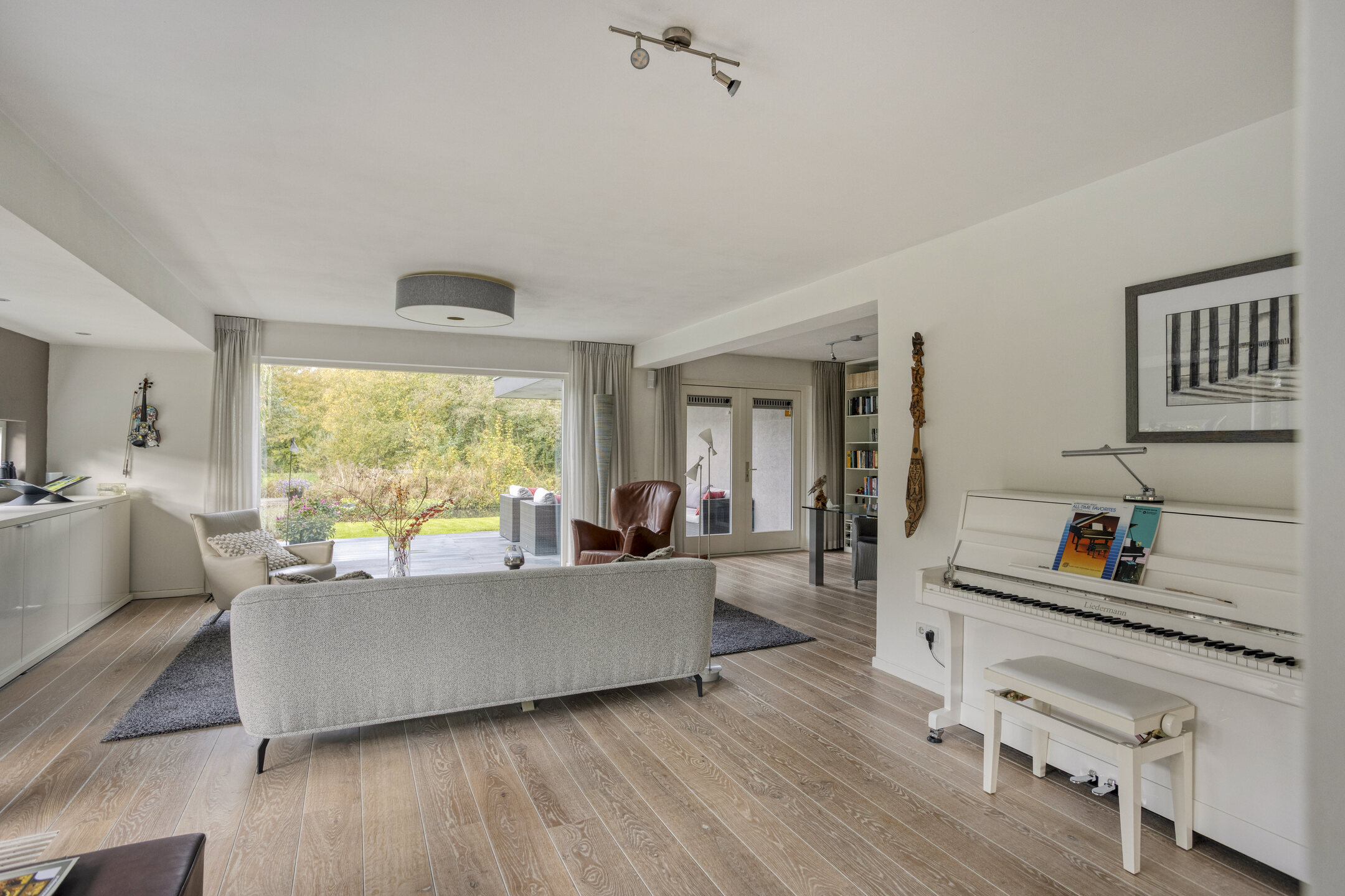 The garden-facing living room is located at the rear and is wonderfully bright thanks to the large glass façade. Here, you can relax in a comfortable sitting area while enjoying panoramic views of the beautifully landscaped waterfront garden and the Egmonderhout nature reserve.