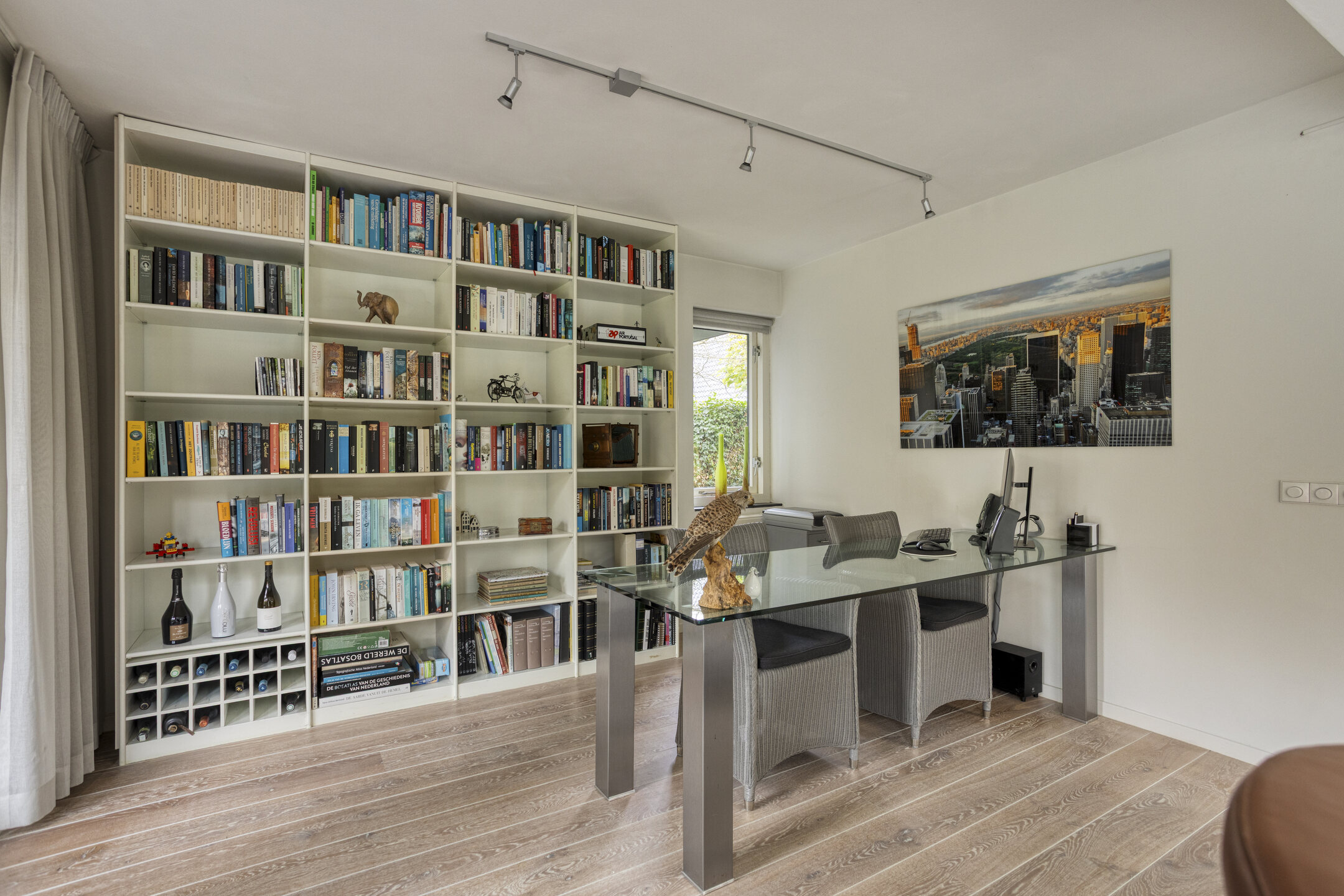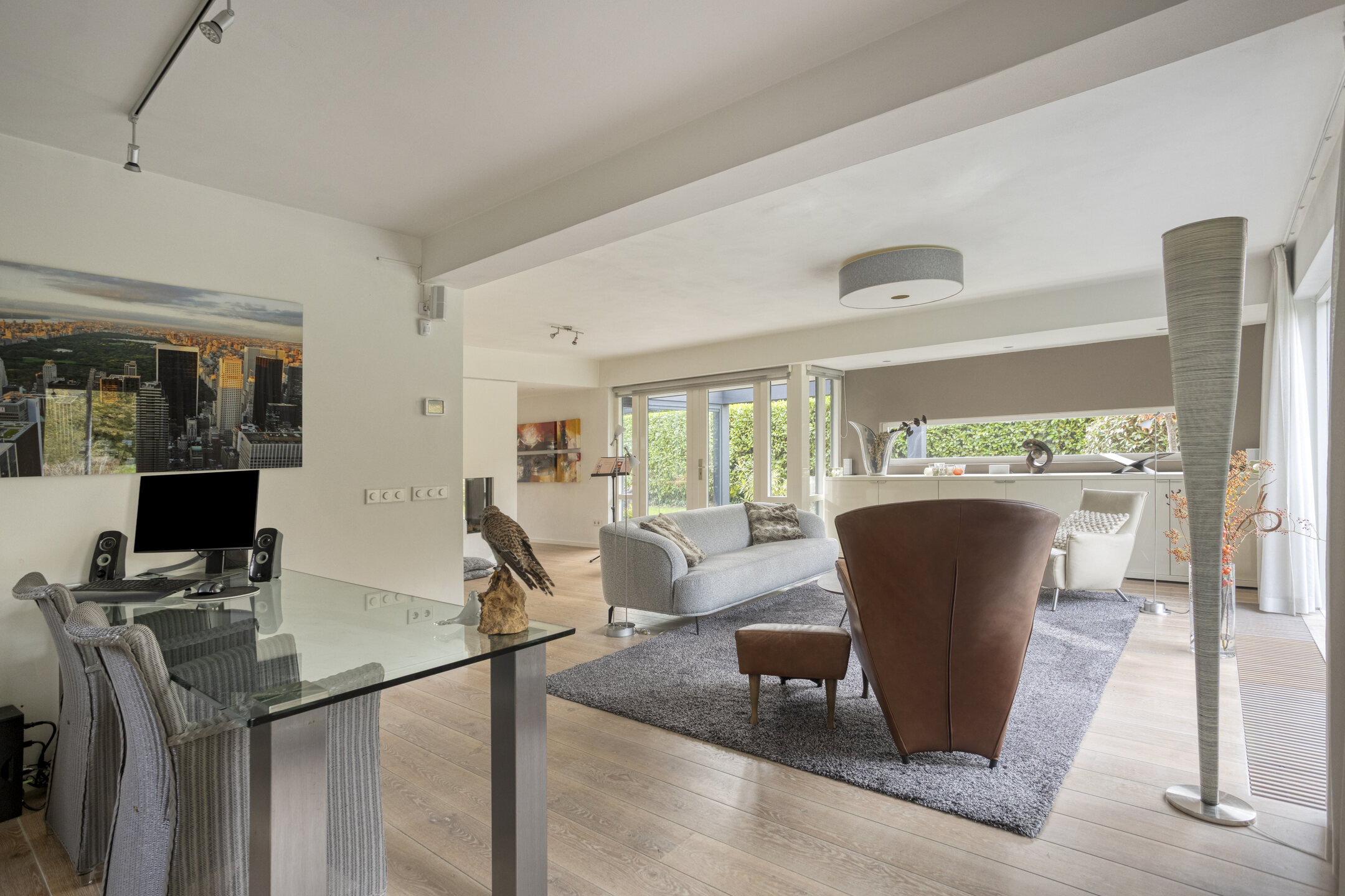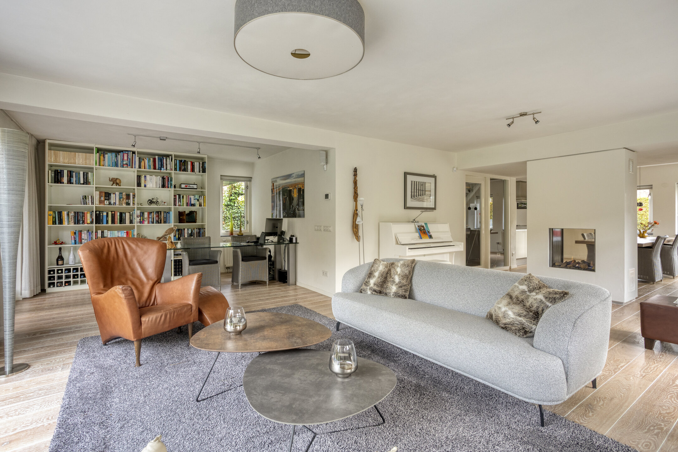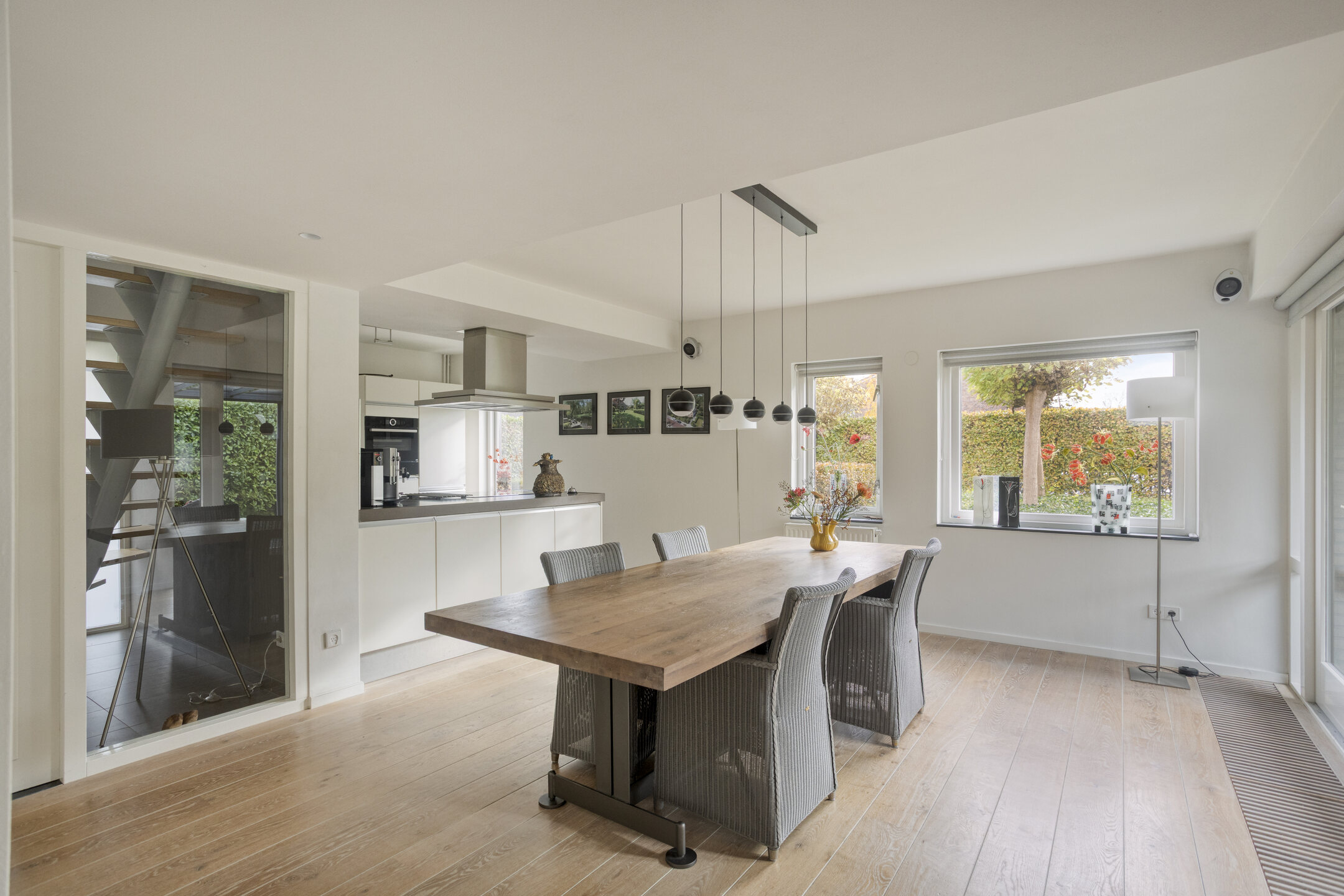 The garden-facing living room is located at the rear and is wonderfully bright thanks to the large glass façade. Here, you can relax in a comfortable sitting area while enjoying panoramic views of the beautifully landscaped waterfront garden and the Egmonderhout nature reserve.