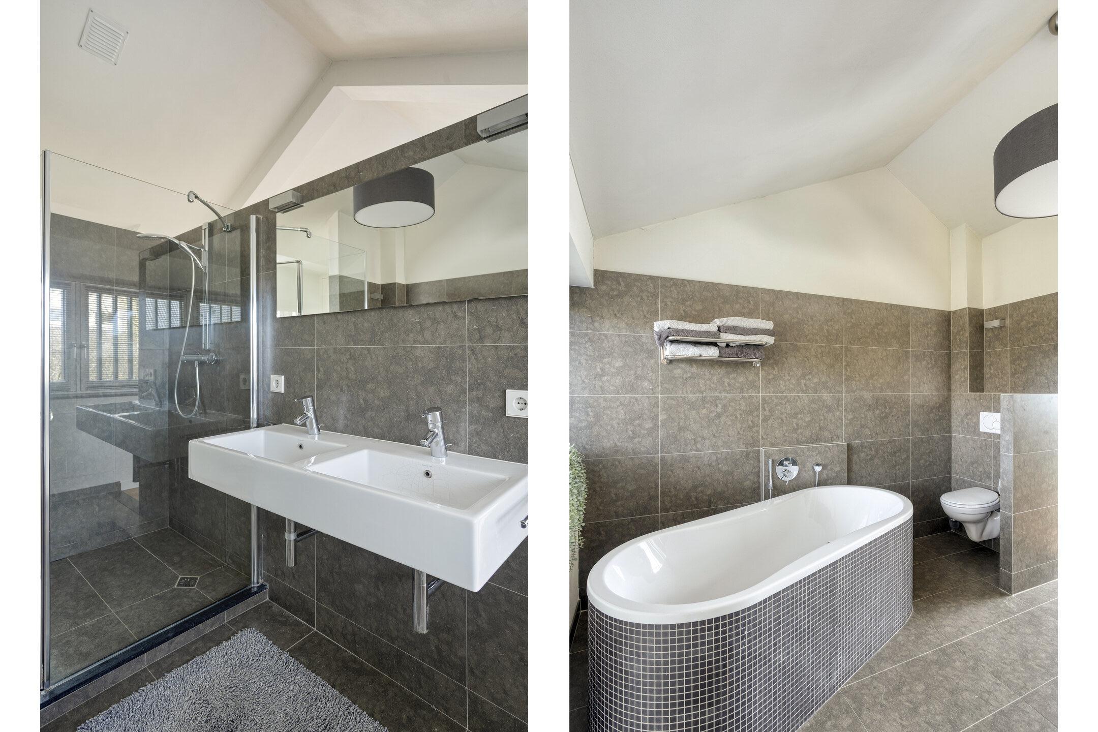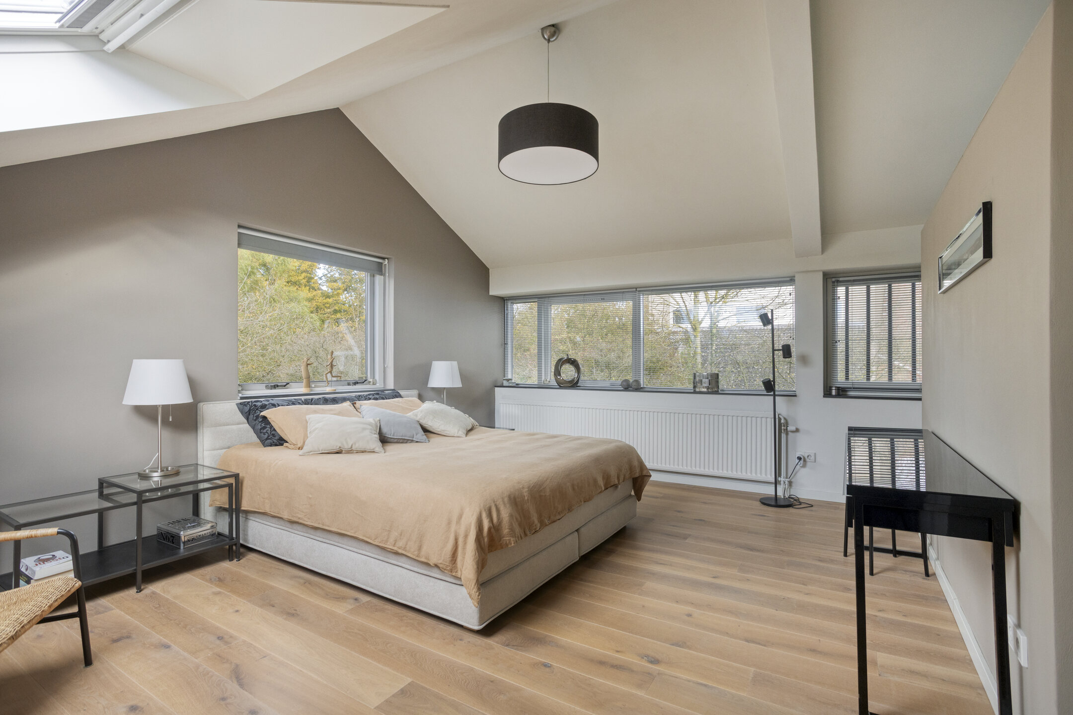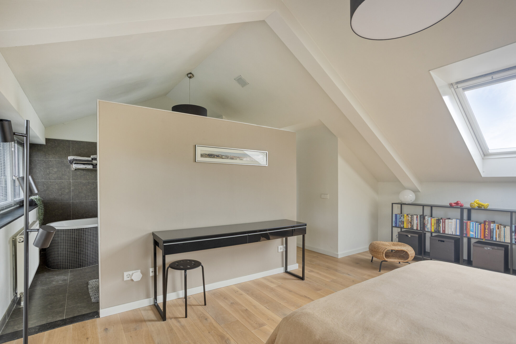 At the rear, you’ll find the impressive master bedroom — bright, spacious, and equipped with a large walk-in closet and a luxurious open-plan bathroom featuring a double washbasin, walk-in shower, and freestanding bathtub. This bedroom also enjoys a stunning view over the garden and includes additional storage in the eaves.