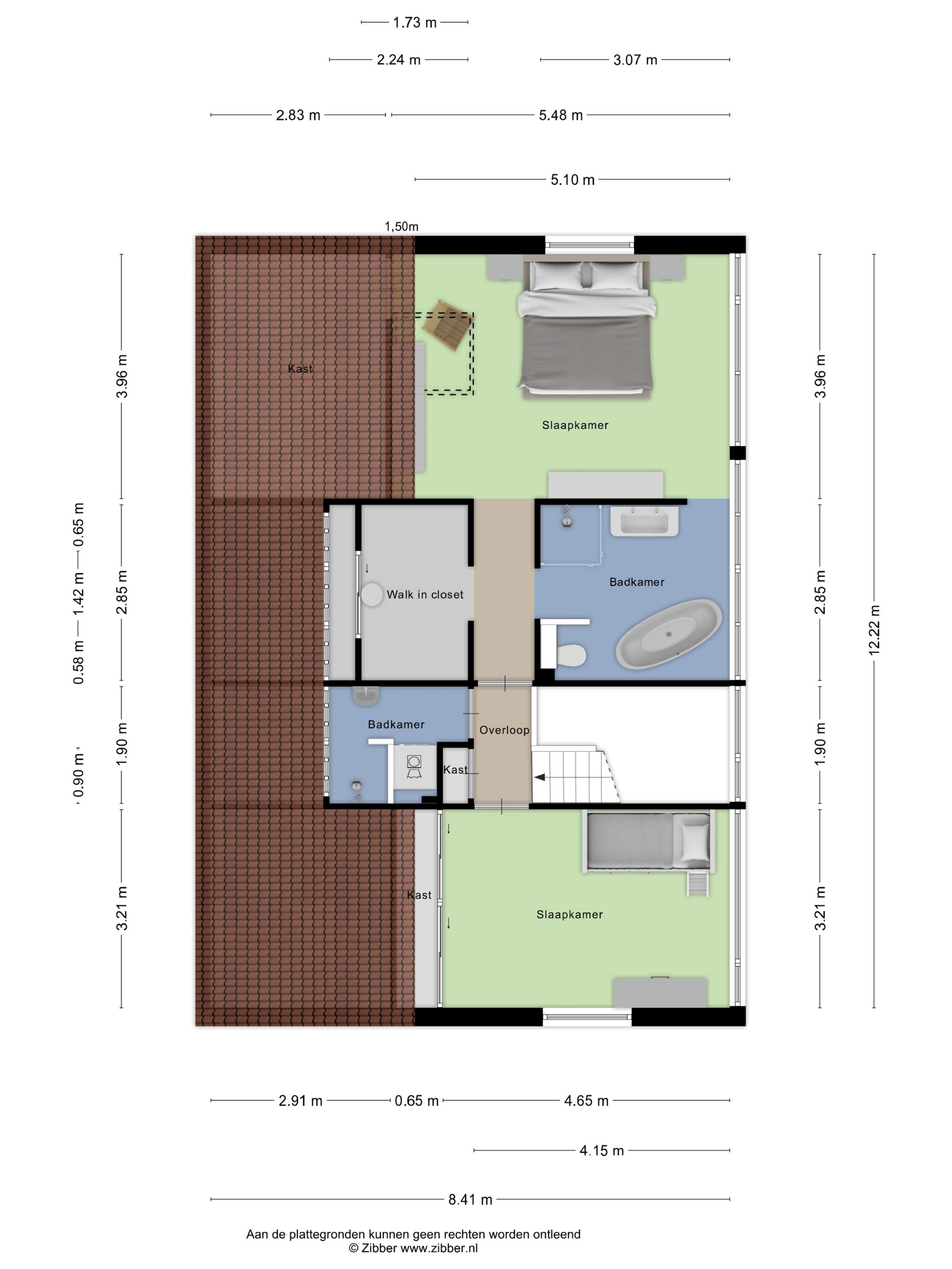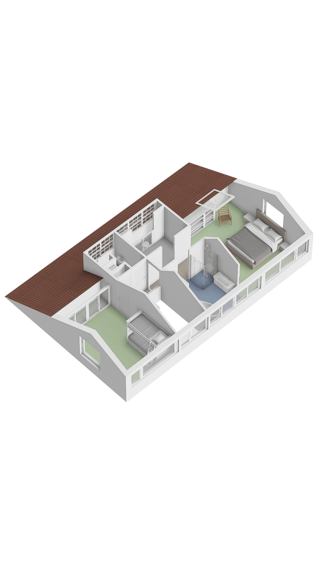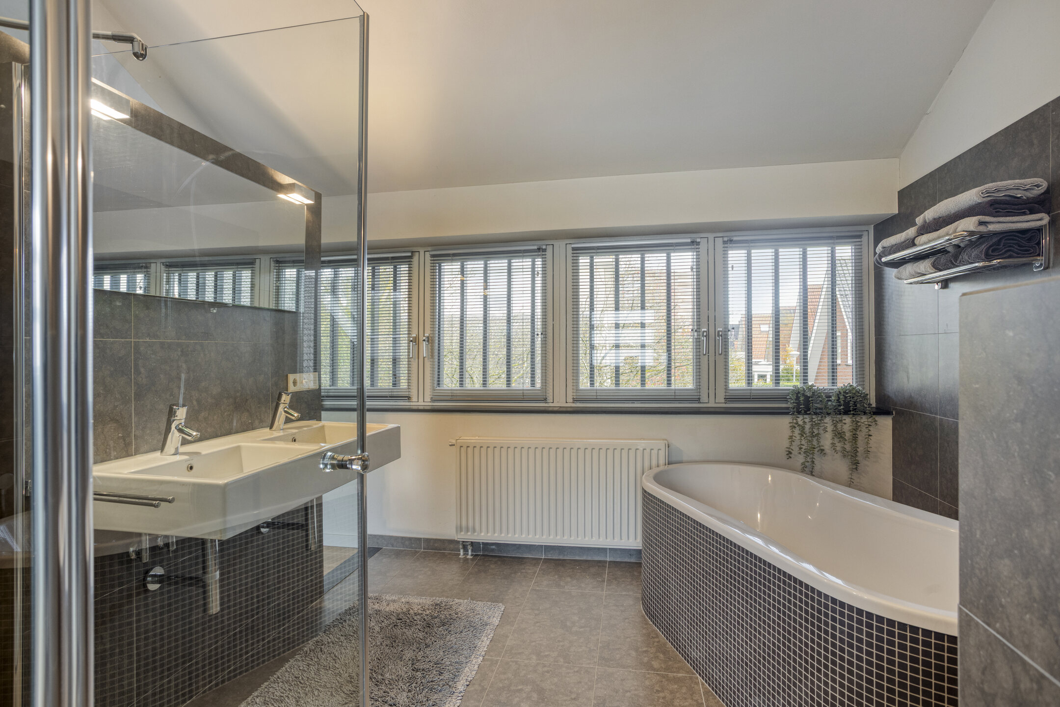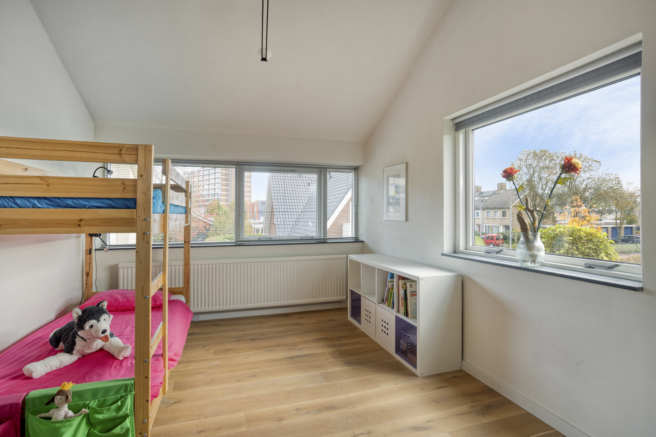 At the rear, you’ll find the impressive master bedroom — bright, spacious, and equipped with a large walk-in closet and a luxurious open-plan bathroom featuring a double washbasin, walk-in shower, and freestanding bathtub. This bedroom also enjoys a stunning view over the garden and includes additional storage in the eaves.