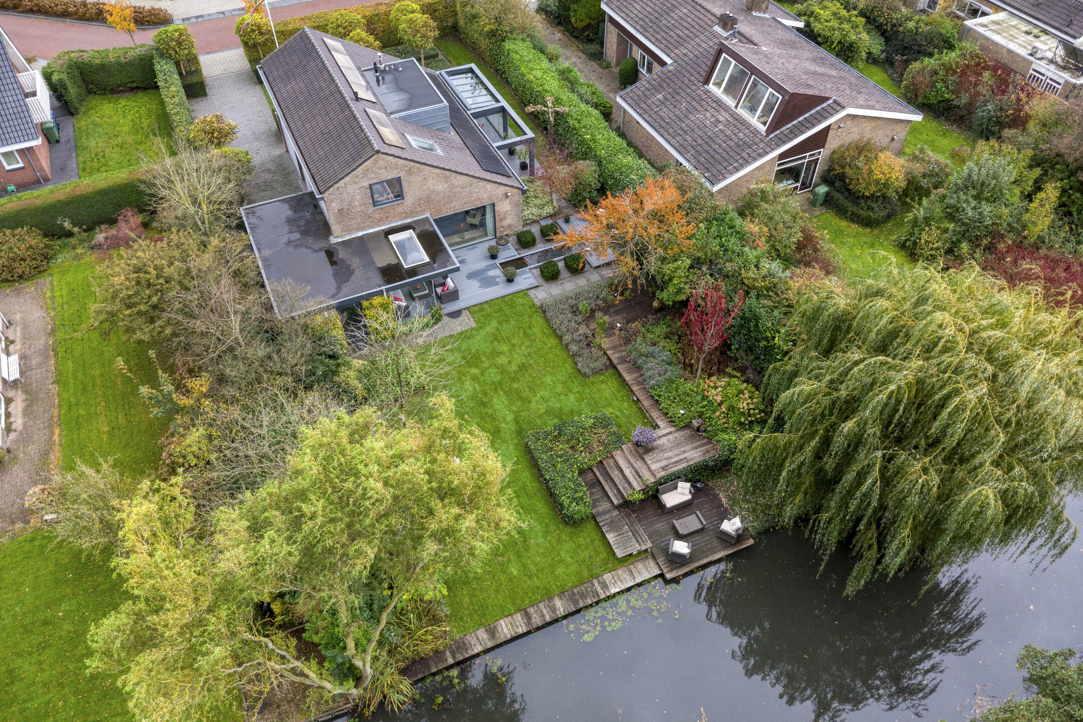 Some homes simply have it all. This detached residence, originally built in 1970 and completely redesigned and renovated in 2005 under the architecture of Kerssens De Ruiter Architects (KDRA), is one of those rare finds. It offers a sleek level of finish, outstanding maintenance, 17 solar panels with energy label A, a conservatory, and a beautifully landscaped garden bordering the water — directly adjacent to the Egmonderhout Nature Park.