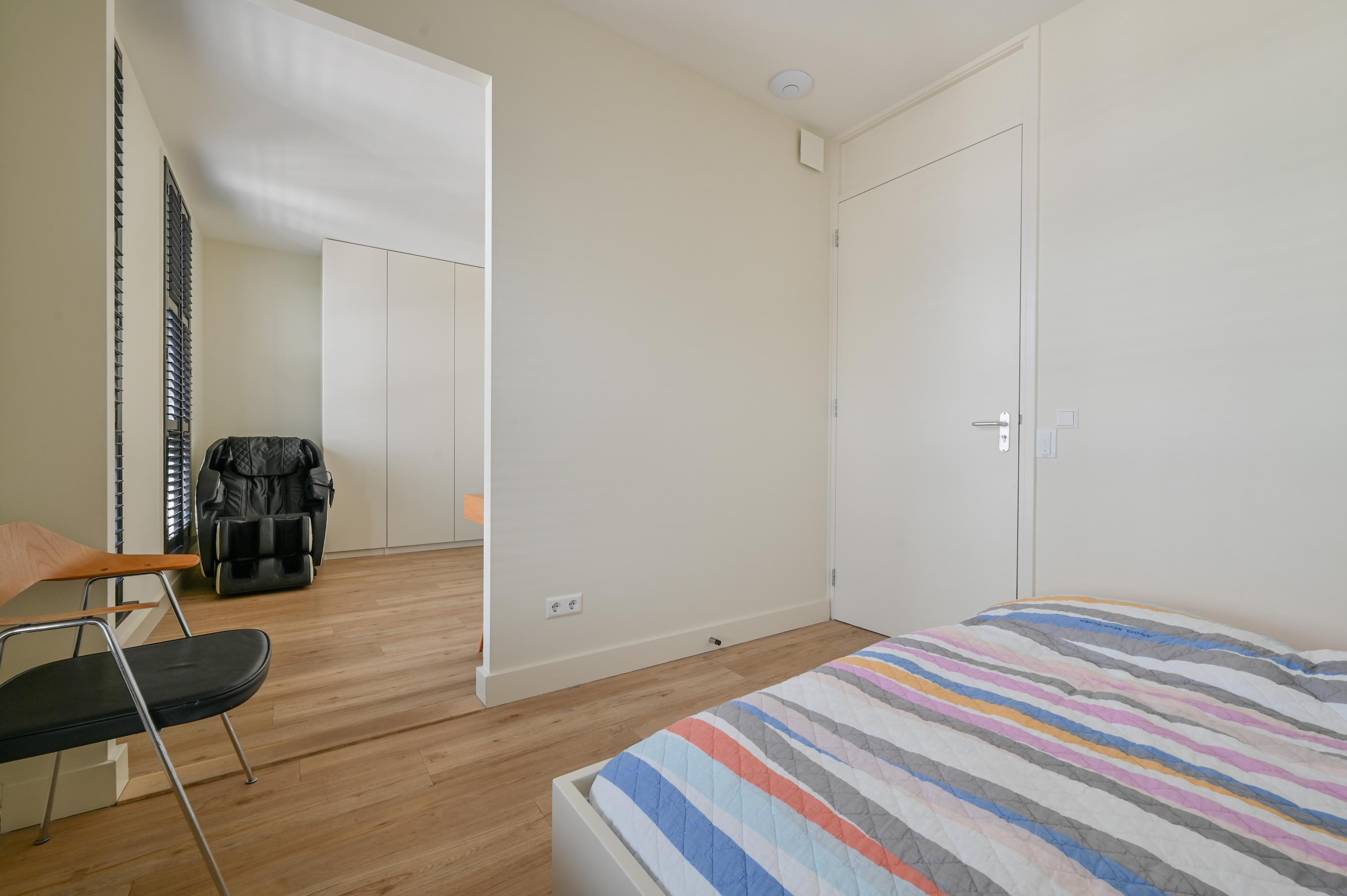 Via the driveway, you reach the front door and the spacious entrance hall, which features a wardrobe, toilet, and staircase to the upper floor. The living room is located at the front of the house and offers breathtaking views over the Amstel. Large windows allow an abundance of natural light to flood in, while the motorized curtains can be operated via an app. Luxaflex Silhouette blinds (motorized, with memory function) are also installed here. The stylish black tiled floor with underfloor heating, built-in dimmable Modular spotlights, and large custom-designed cabinets complete the space.