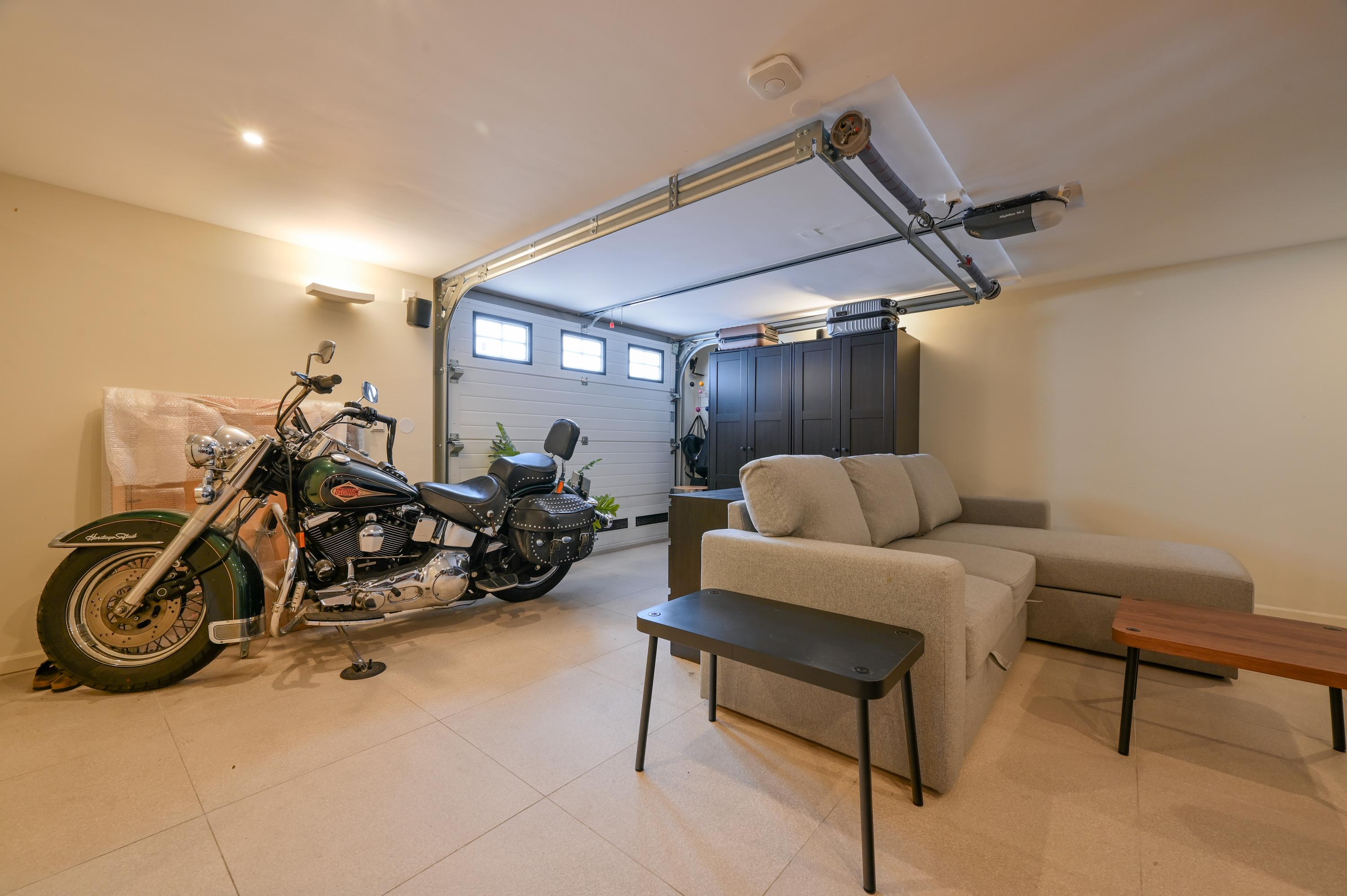 Beneath the terrace, there is a garage accessible via a fixed staircase, currently used as a studio complete with a kitchenette, toilet, electric underfloor heating, and air conditioning. The garage is also accessible via an electric door at the rear of the property.