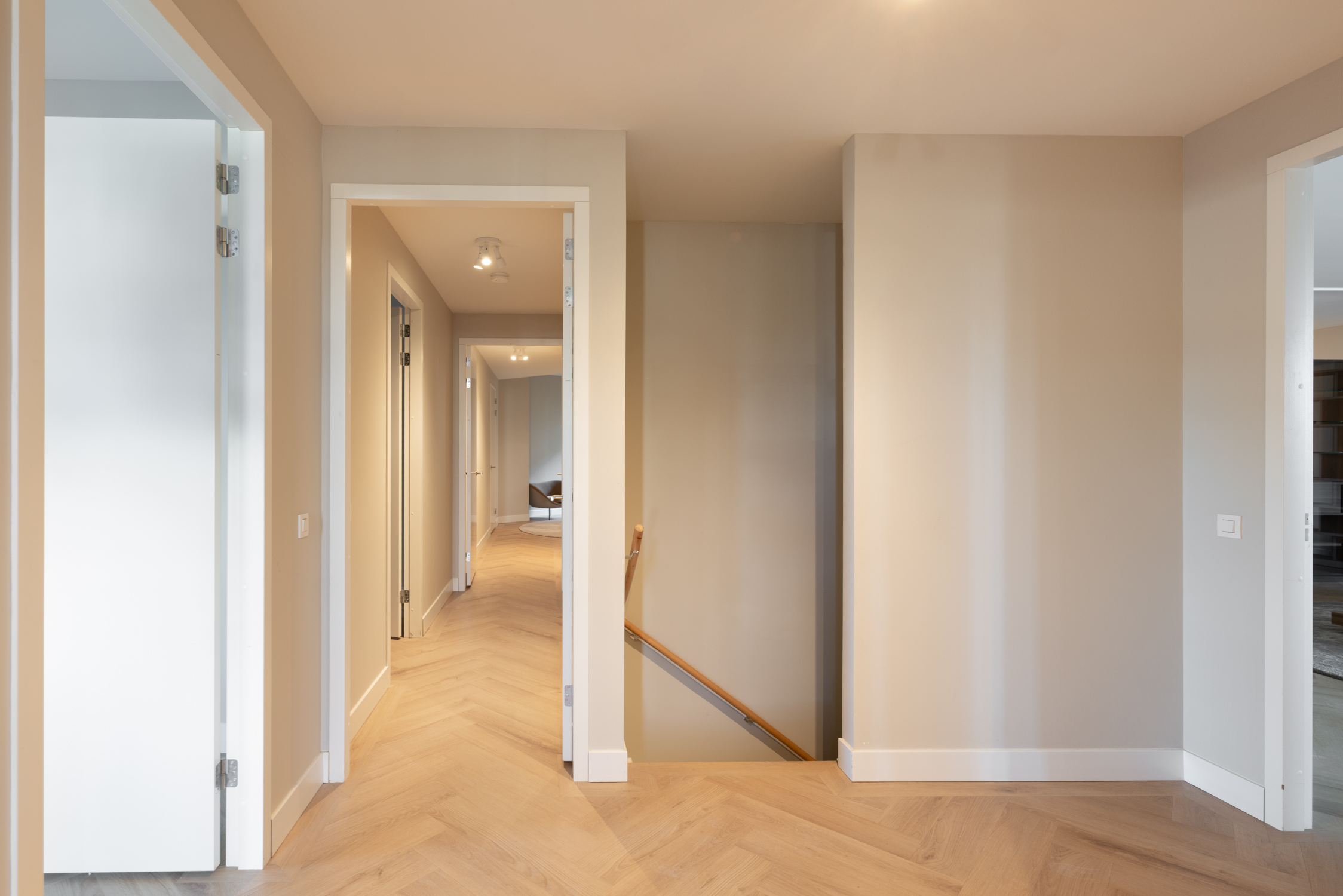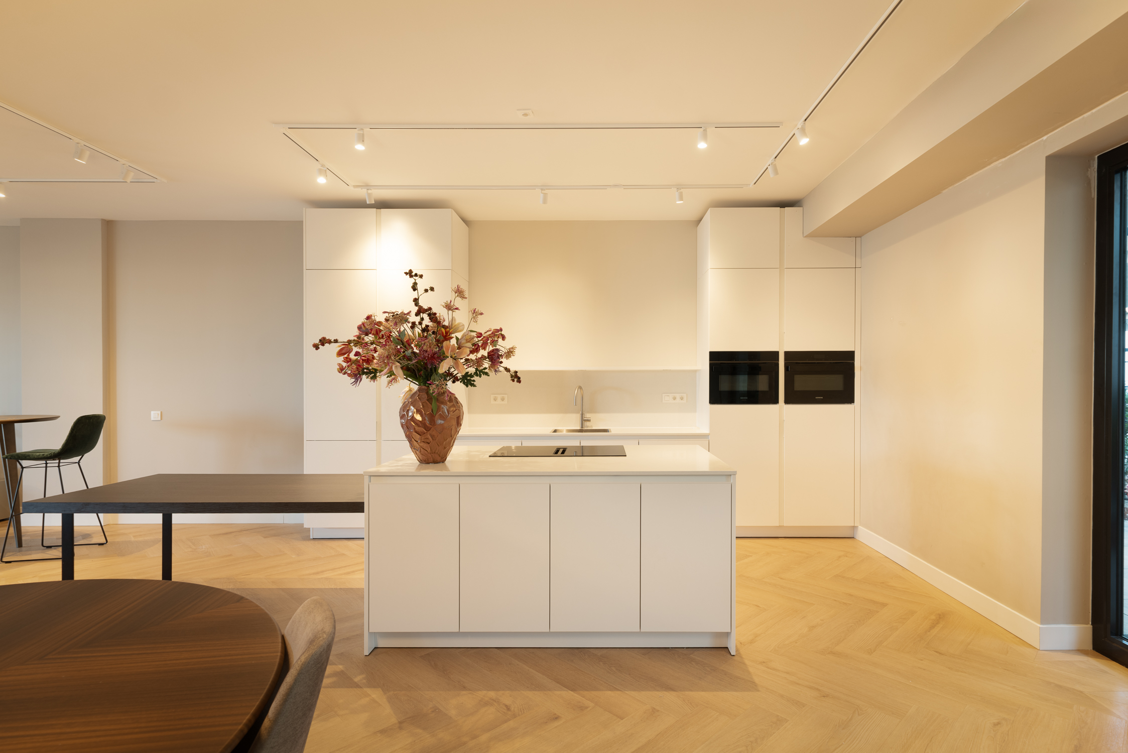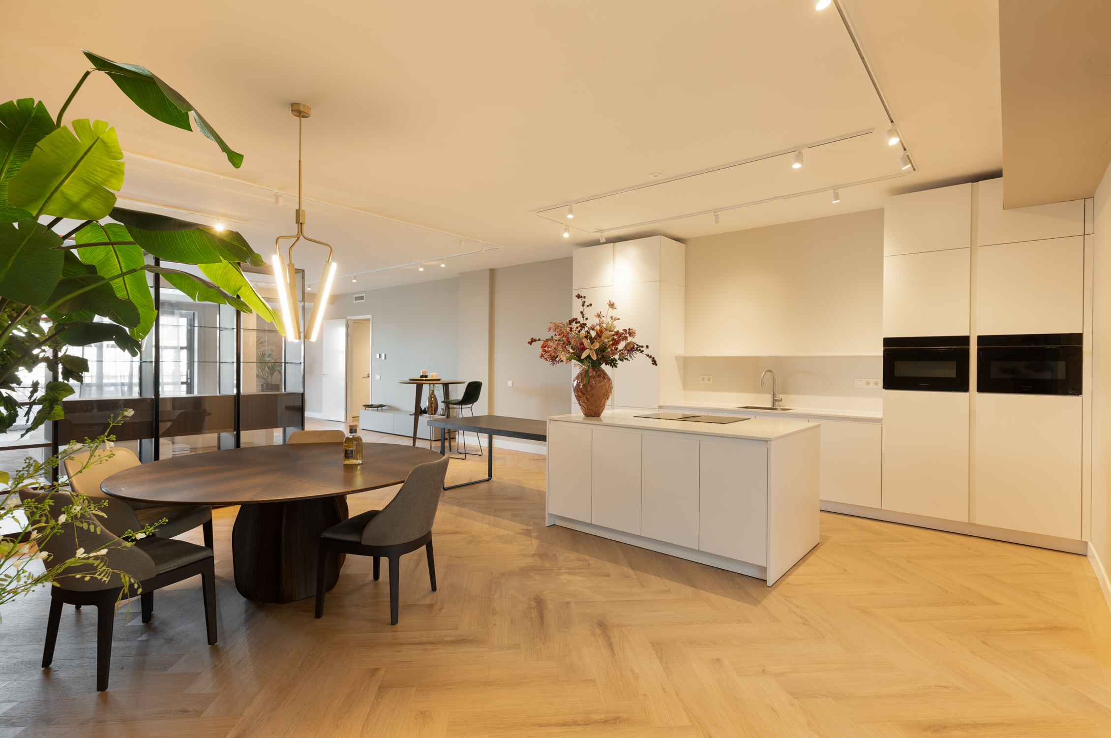 The expansive living space of nearly 90 m² combines a stylish lounge area, dining room, and modern open kitchen. Everything is sleekly plastered and features a stunning PVC herringbone floor, luxurious window coverings, bespoke lighting, and high-end interior design. Large windows provide an abundance of natural light and create a seamless connection to the garden.