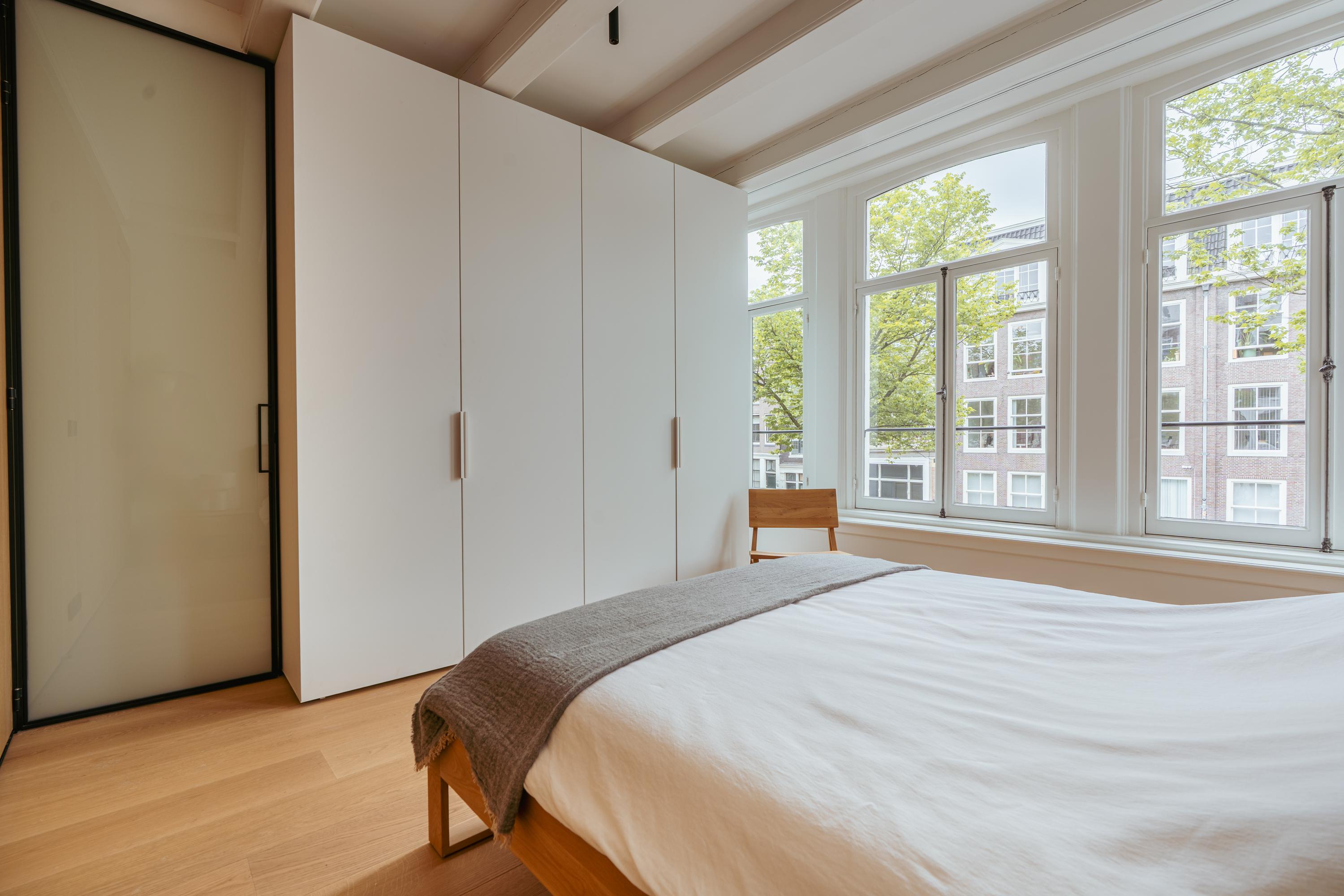 A tidy landing with built-in storage leads to two bedrooms. This floor features a beautiful wooden floor and premium finishes. At the front is a spacious bedroom with a custom-made built-in wardrobe that seamlessly integrates into the design. Large windows flood the space with natural light and offer a stunning view of the canal and historic facades. The second bedroom at the rear also includes built-in wardrobes. Centrally located on this floor is the modern bathroom, complete with a walk-in shower, sleek vanity, and stylish toilet — all finished to a high and timeless standard. Elegant steel-framed doors close off the bedrooms, combining functionality and design in harmony with the home’s aesthetic.