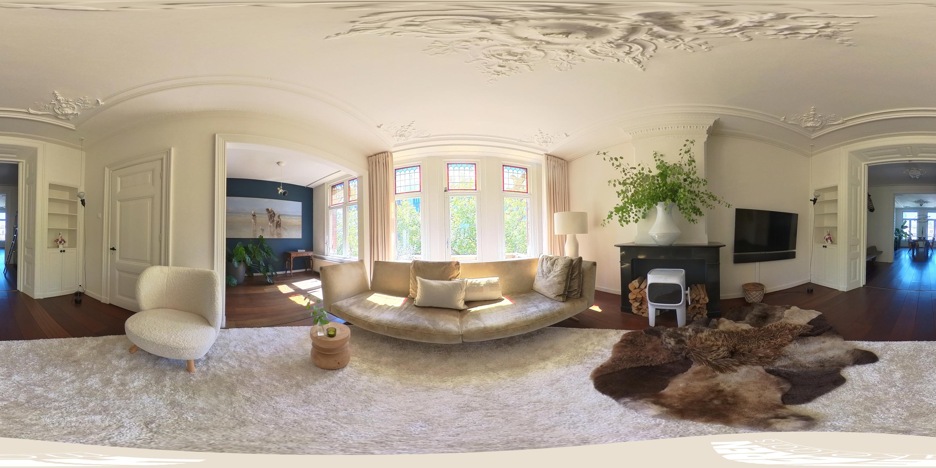 This level features a spacious landing with original exposed wooden beams—perfect as a music room, workspace, or gaming area. The fourth bedroom and a convenient storage room are located at the front. There’s also an additional washbasin on this floor. A staircase leads to the roof, where you can enjoy views of Carré Theatre and even the Rijksmuseum. This characteristic building, designed by architect A.C. Boerma, is constructed of brick accented with limestone blocks and bands. The facade boasts three elegant wooden bay windows adorned with authentic ornaments and fantasy figures. Throughout the home, you’ll find beautiful hardwood flooring, high ornamental ceilings, and original stained-glass transom windows. We invite you, like the current residents, to fall in love with this truly exceptional and spacious home.