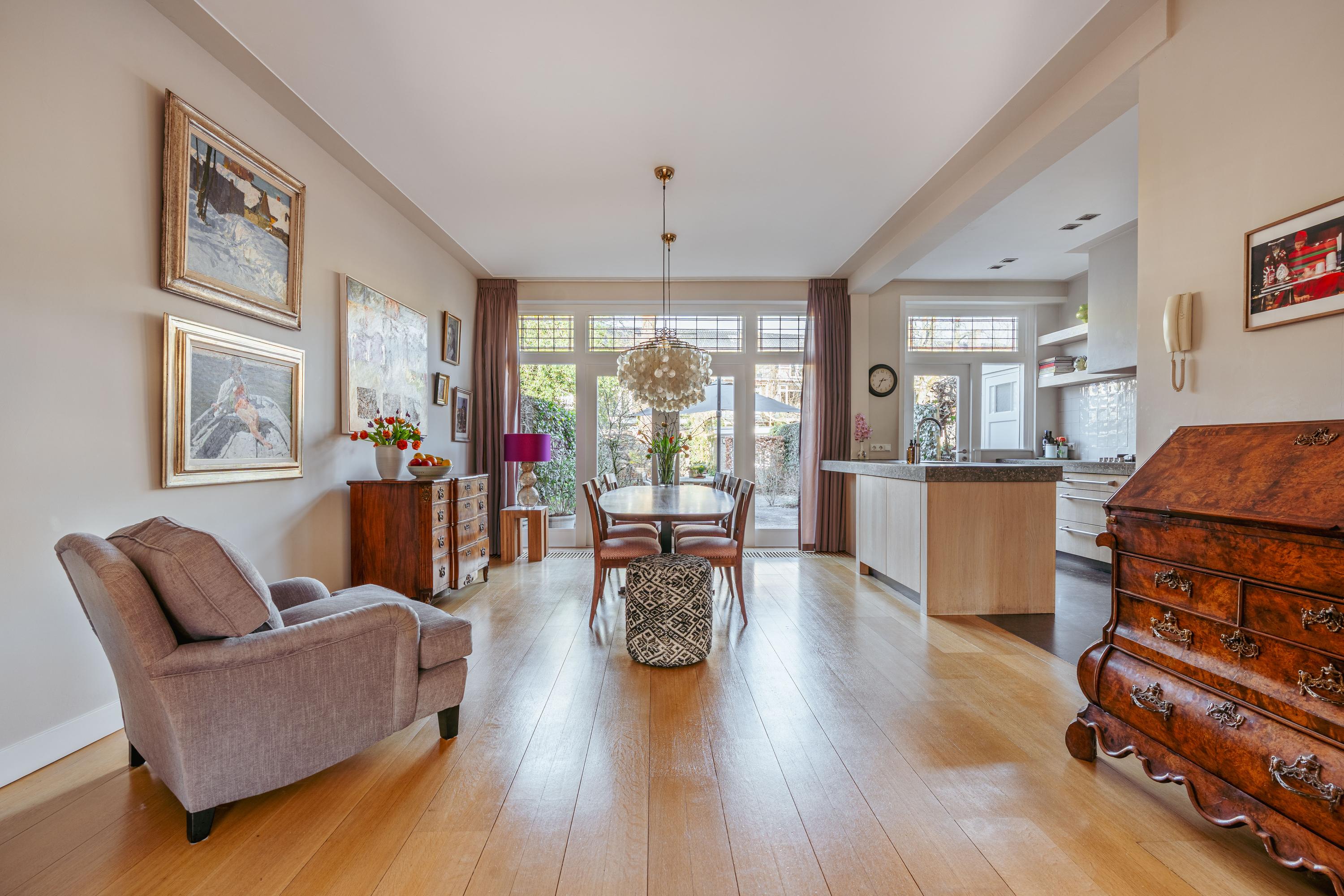 Entrance with a vestibule, followed by a spacious hallway with a cloakroom, staircase, and a separate toilet with washbasin. At the front, the inviting living room features a fireplace and a bay window, providing beautiful natural light. There is ample space for a generous seating area and, if desired, a reading or workspace. Through double French doors, you access the elevated front terrace, a pleasant spot to enjoy the sun. At the rear, behind sliding doors, is the generous dining room with an adjoining open-plan kitchen with cooking island. The kitchen is equipped with a five-burner gas stove, extractor hood, oven, combi-oven, refrigerator, dishwasher, Quooker, and offers extensive storage space. Double doors provide access to the deep and sunny rear garden, offering a high degree of privacy and featuring a detached storage unit, ideal for bicycles and garden tools. Notably, this property—one of the few on Diepenbrockstraat—also benefits from rear access, secured by a wooden gate with a code lock.