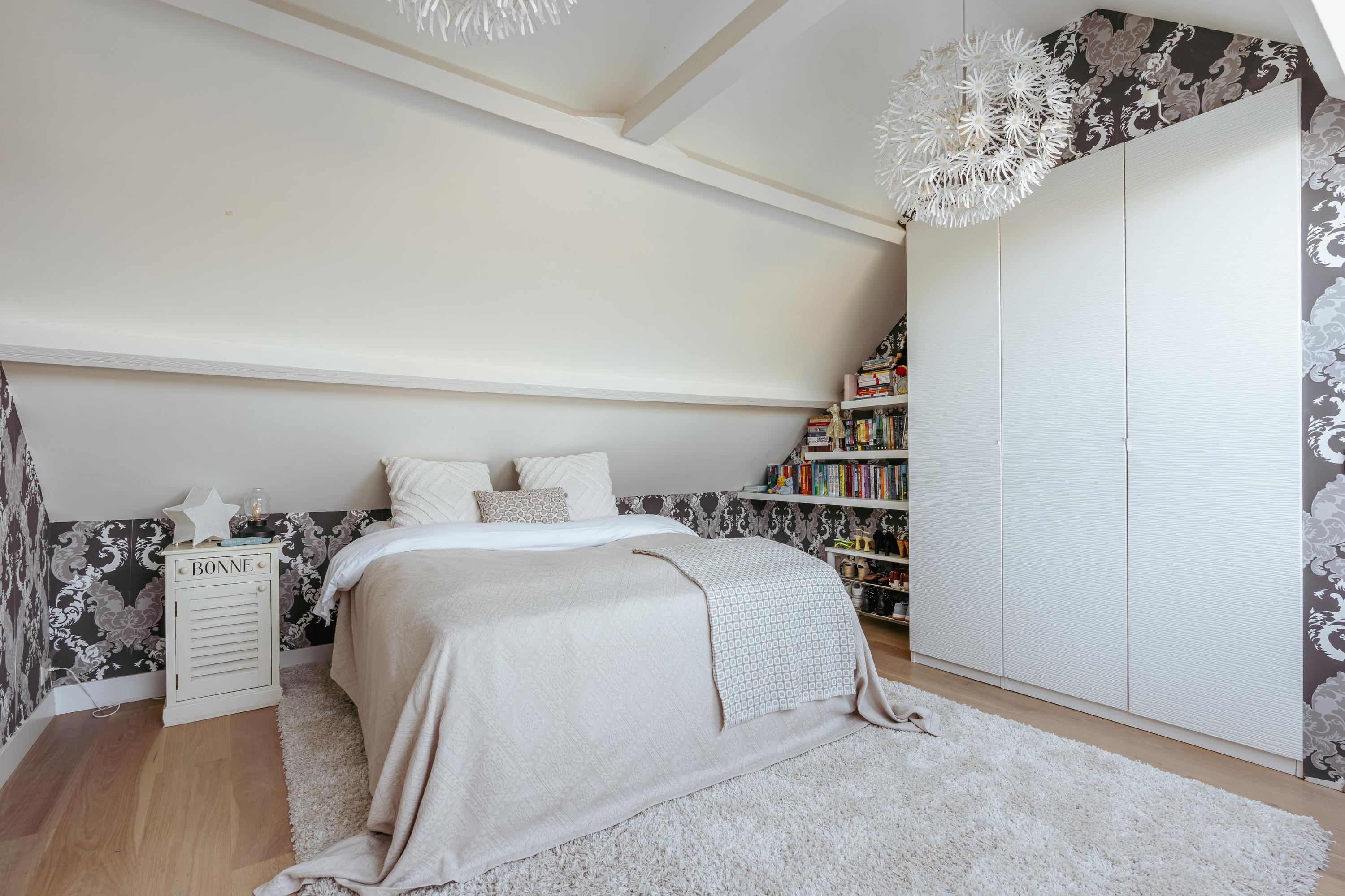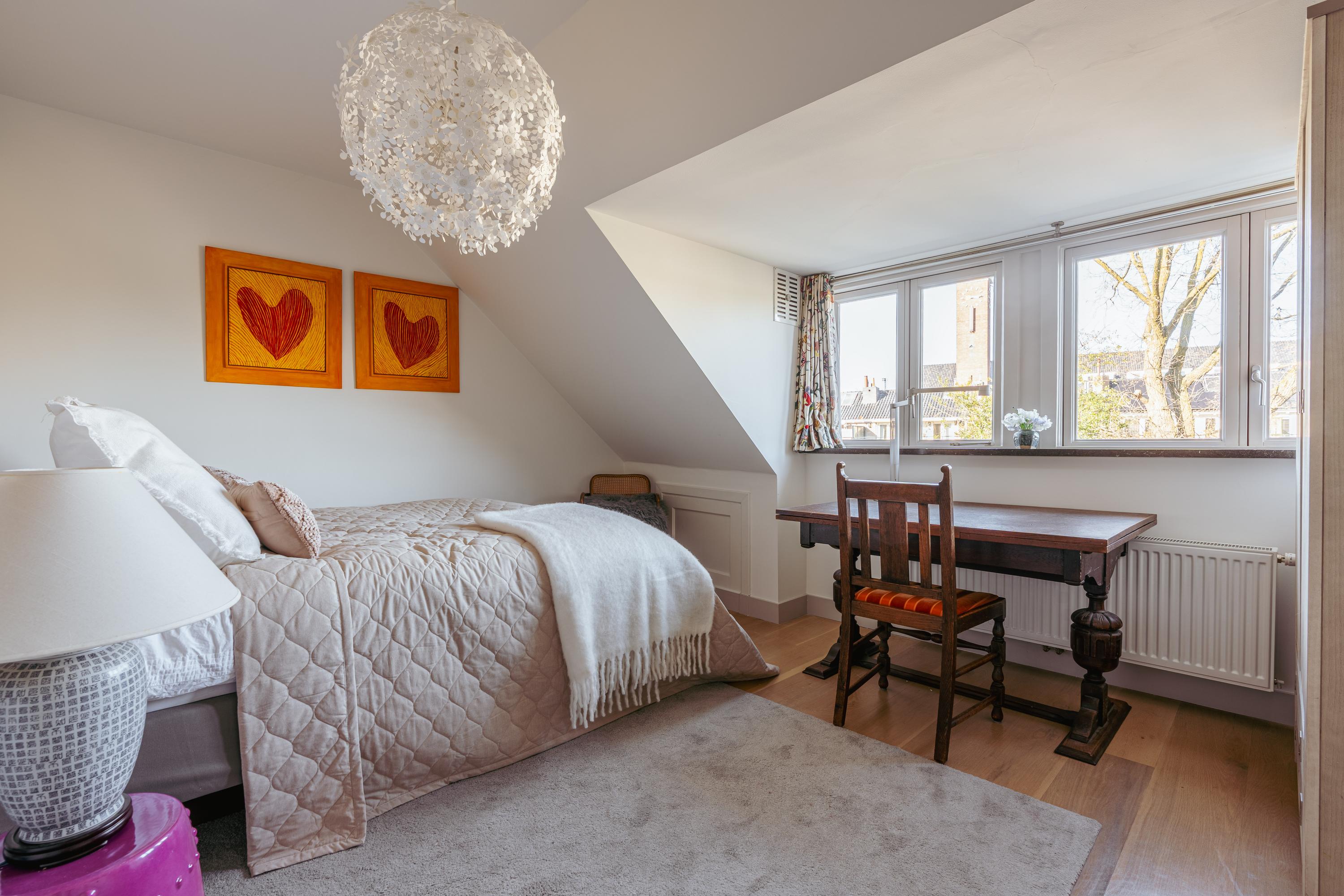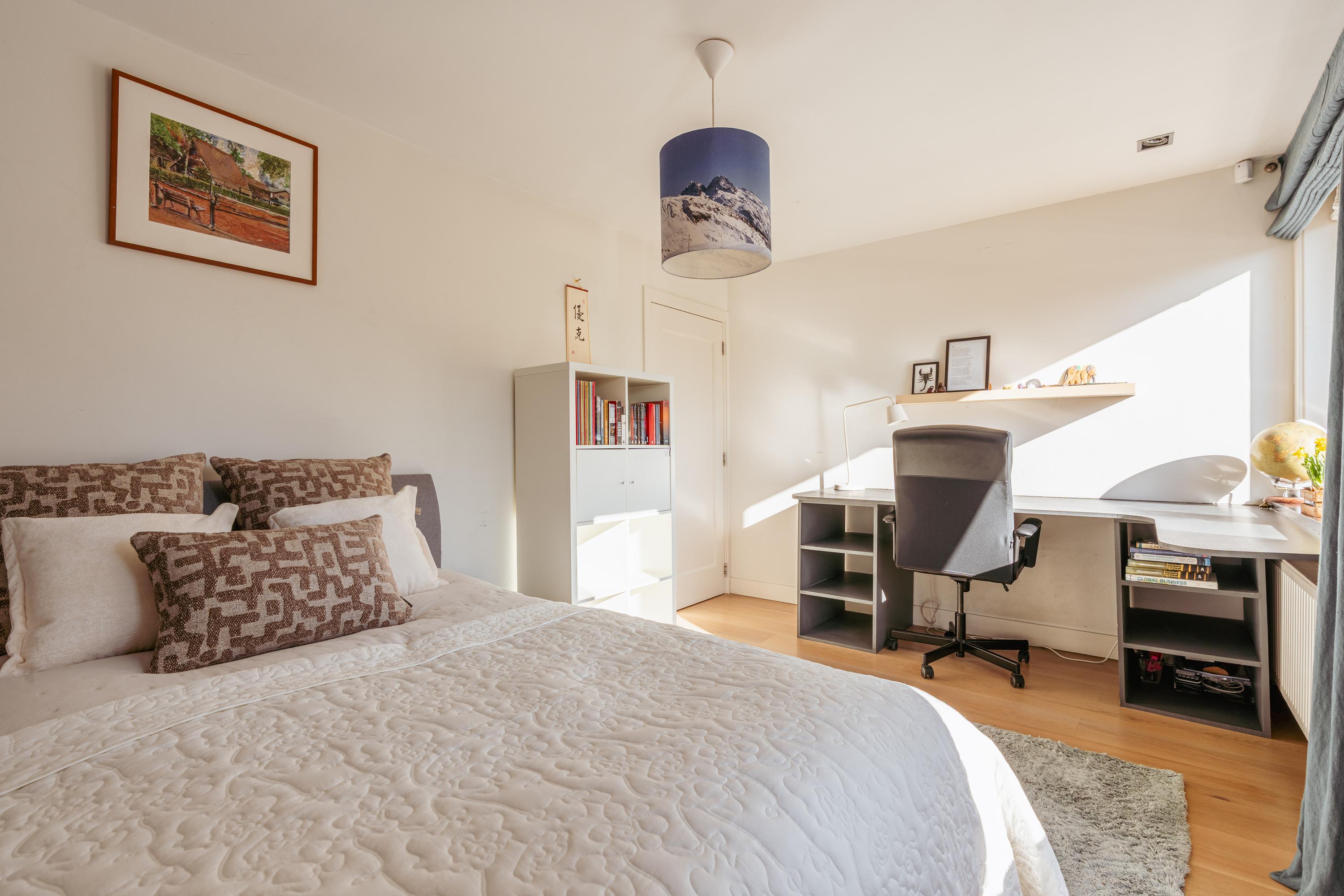 Landing with access to the fifth bedroom of this family home. The top floor boasts an impressive ceiling height and multiple windows, creating a bright and spacious atmosphere. The en-suite bathroom is fitted with a walk-in shower, washbasin with vanity unit, and toilet. A practical storage room is also accessible from the landing. This floor is highly suitable as a home office, guest room, or studio.