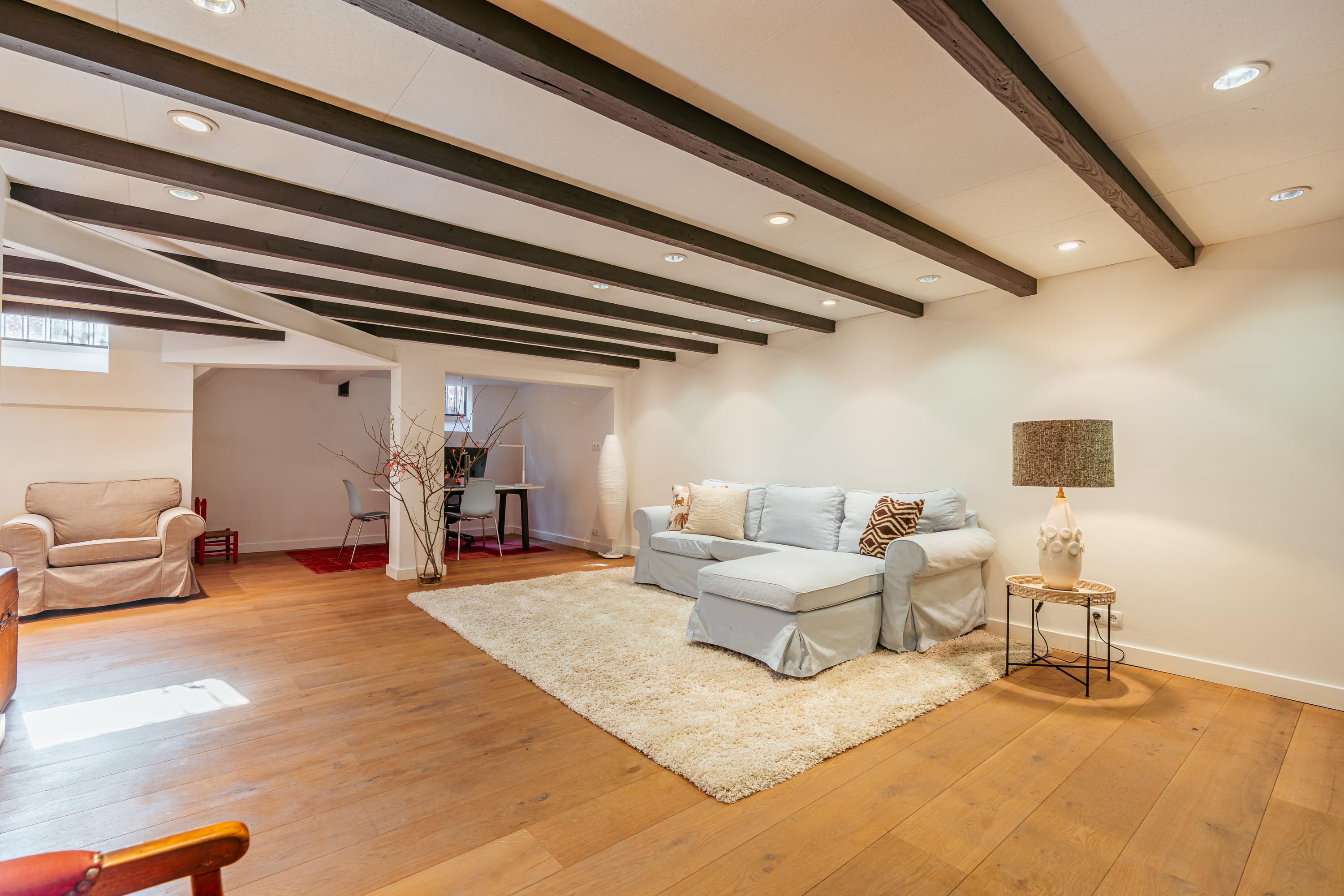 Accessible via the staircase in the hallway on the ground floor, the basement extends beneath a large portion of the house. This space offers an ideal setting for relaxation with family or friends. The basement is well-finished and comprises a large open area as well as additional storage space. It can easily be adapted to suit various purposes, such as a wine cellar, cinema or games room, or a combination of these with extra storage.
