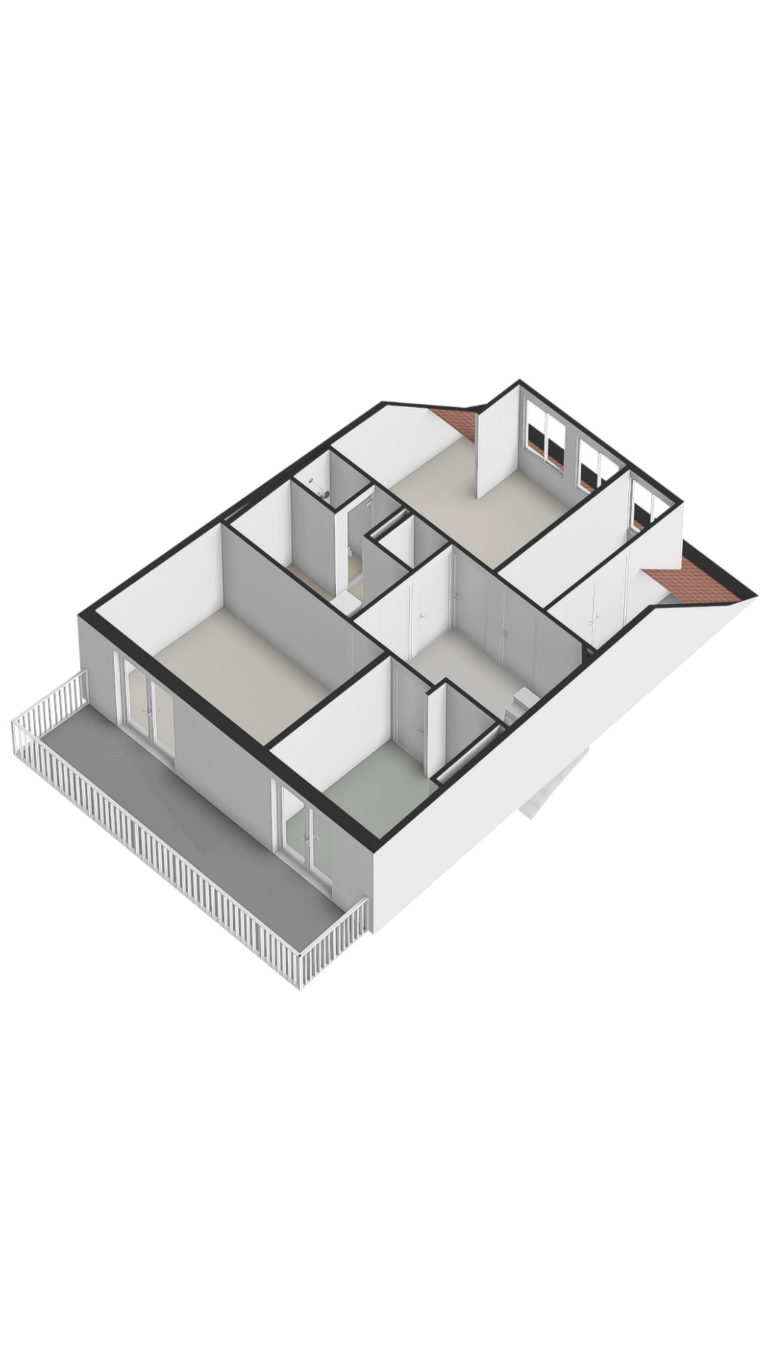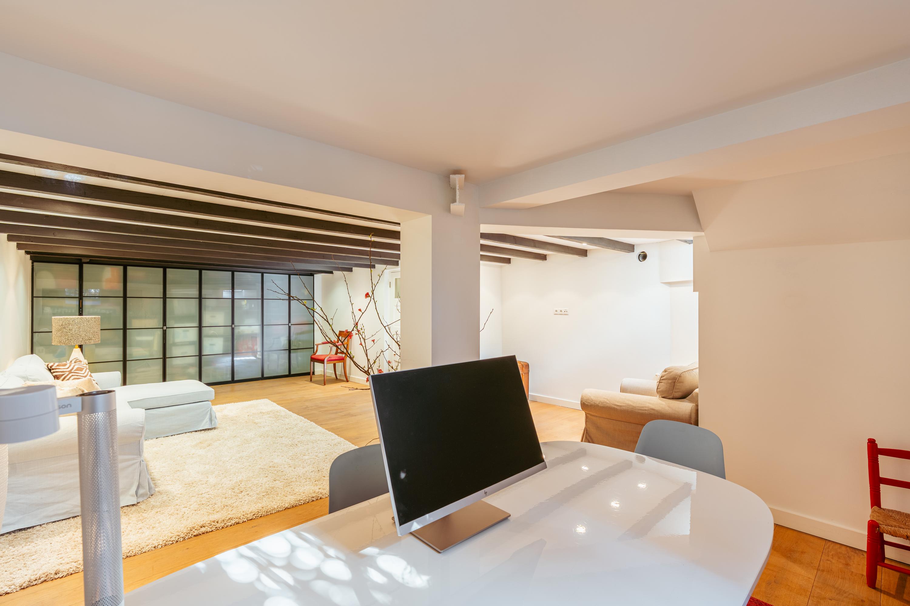 Landing with access to the third bedroom at the rear. There is also a dressing room with practical and beautifully finished built-in wardrobes, which can easily be converted into an additional bedroom or workspace. At the front is the fourth bedroom, with access to a particularly deep and wide balcony of approximately 13 m². This property is uniquely positioned on the street, enjoying no direct overlooking from neighbouring properties, ensuring additional privacy.