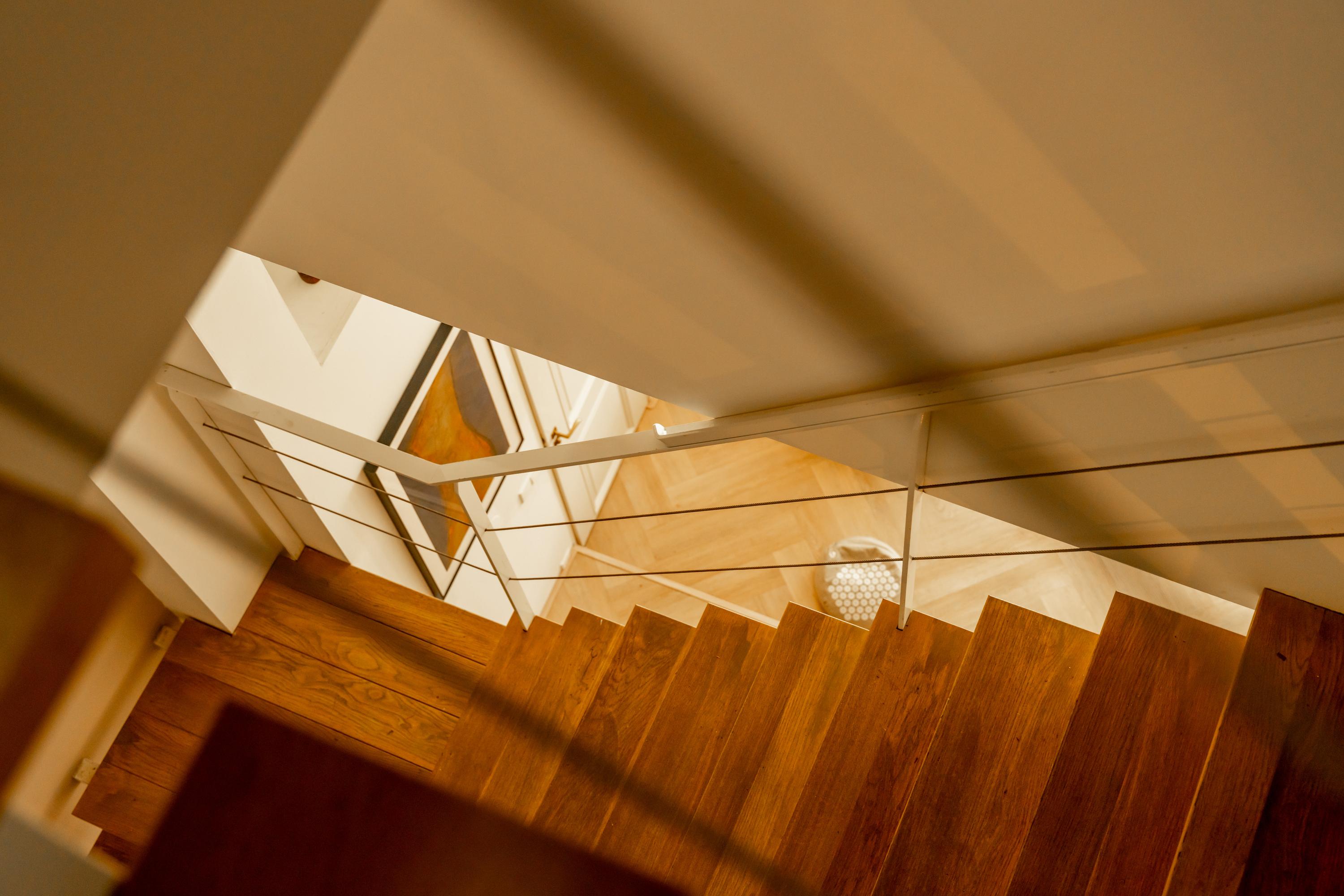 An architectural staircase brings you to the first floor. Here: a spacious bedroom with private bathroom (shower, bath, double sinks, toilet). At the front, an atmospheric second living room with canal views — or a full bedroom — a space that breathes, carries and inspires. From this floor you can also step onto the patio: a hidden peaceful spot in the middle of the city.