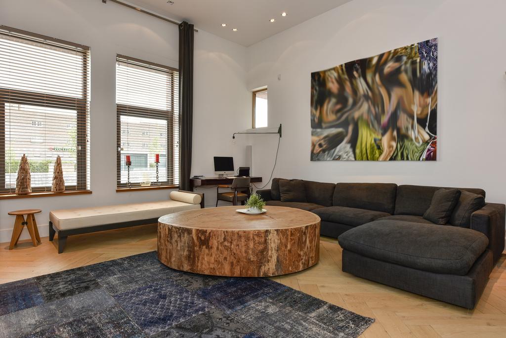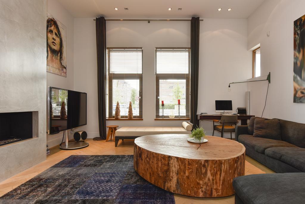 The living room is on the street side of the building and this means it has a gorgeous view out over the waters of the Boerenwetering. This area has a ceiling height of 3.90 metres and is fitted with a gas fireplace. There is a lovely view through from this space to the kitchen and garden, as well as to the freestanding bath.
