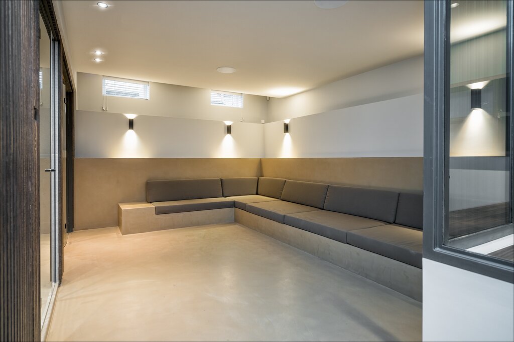 Aan de achterzijde bevind zich een relax ruimte. Deze kan ook gebruikt worden als extra gastenruimte of fitnessruimte. Het souterrain beschikt tevens over een wijnkelder.