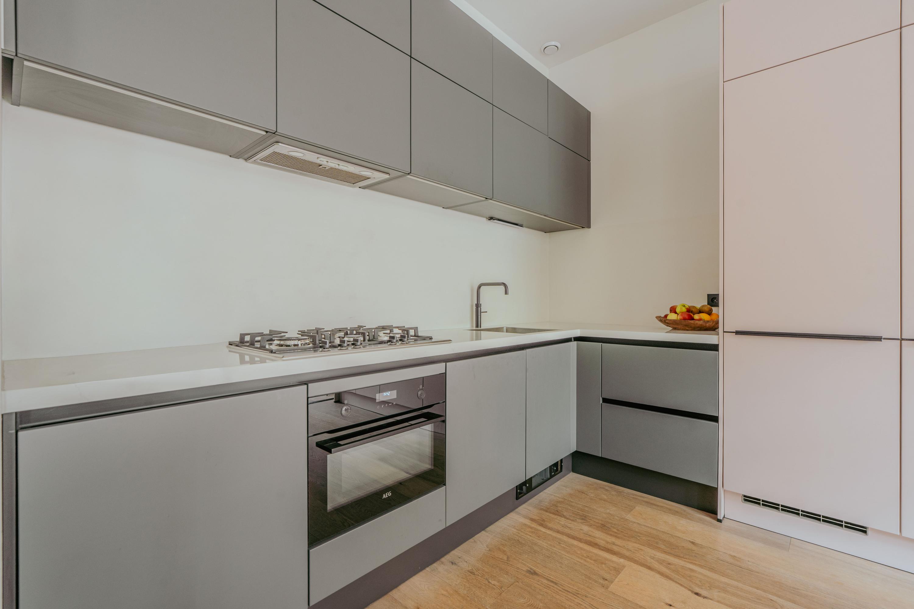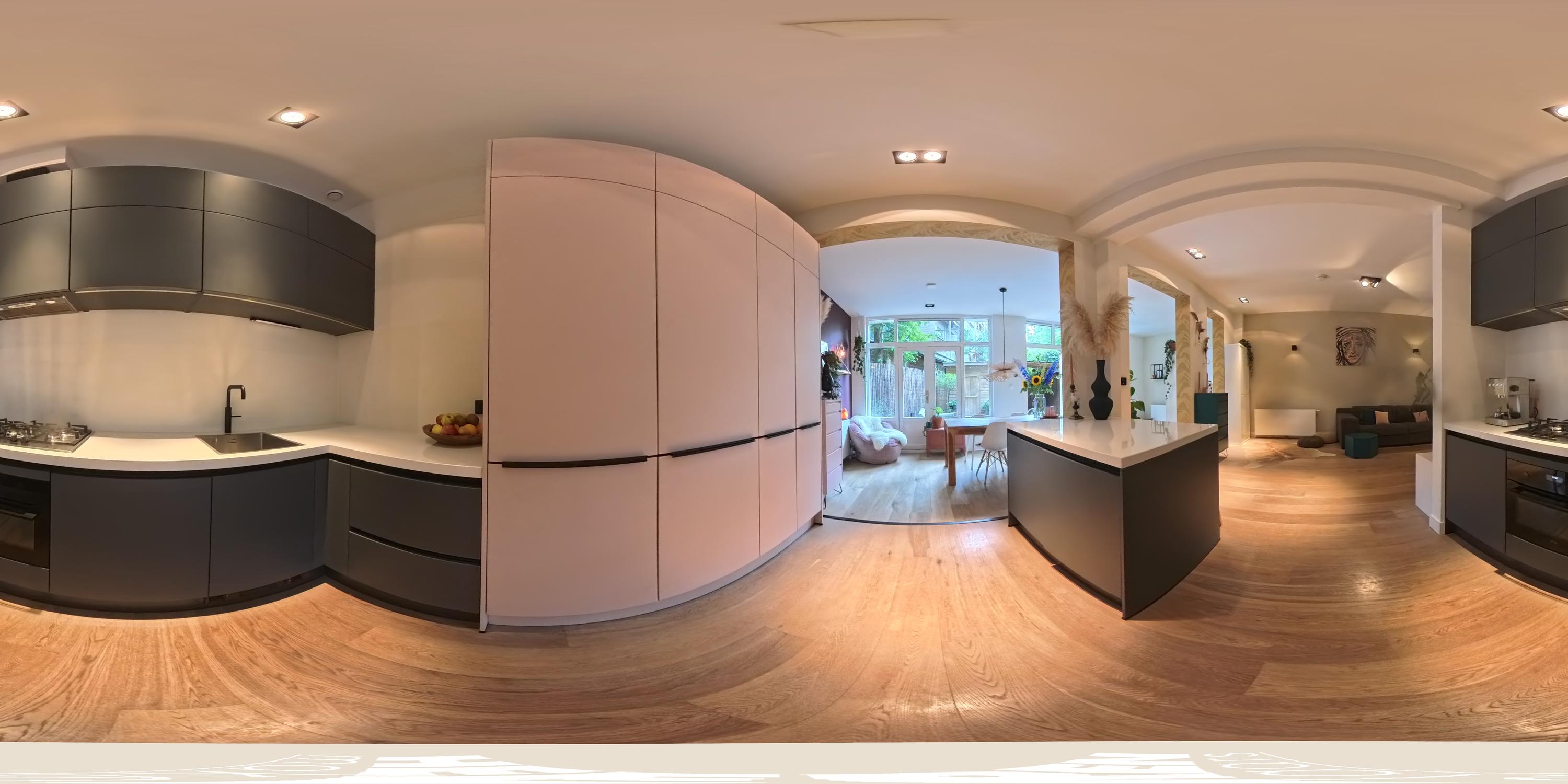 The layout presents a generous living space and an open kitchen equipped with a kitchen island, modern appliances including a 5 burner gas hob, combi oven, dishwasher, fridge freezer, additional freezer and Quooker. There are three bedrooms and a centrally located bathroom featuring a bathtub, double washbasin unit and walk in shower. High ceilings of approximately 3 meters throughout most rooms enhance the sense of space and openness.
