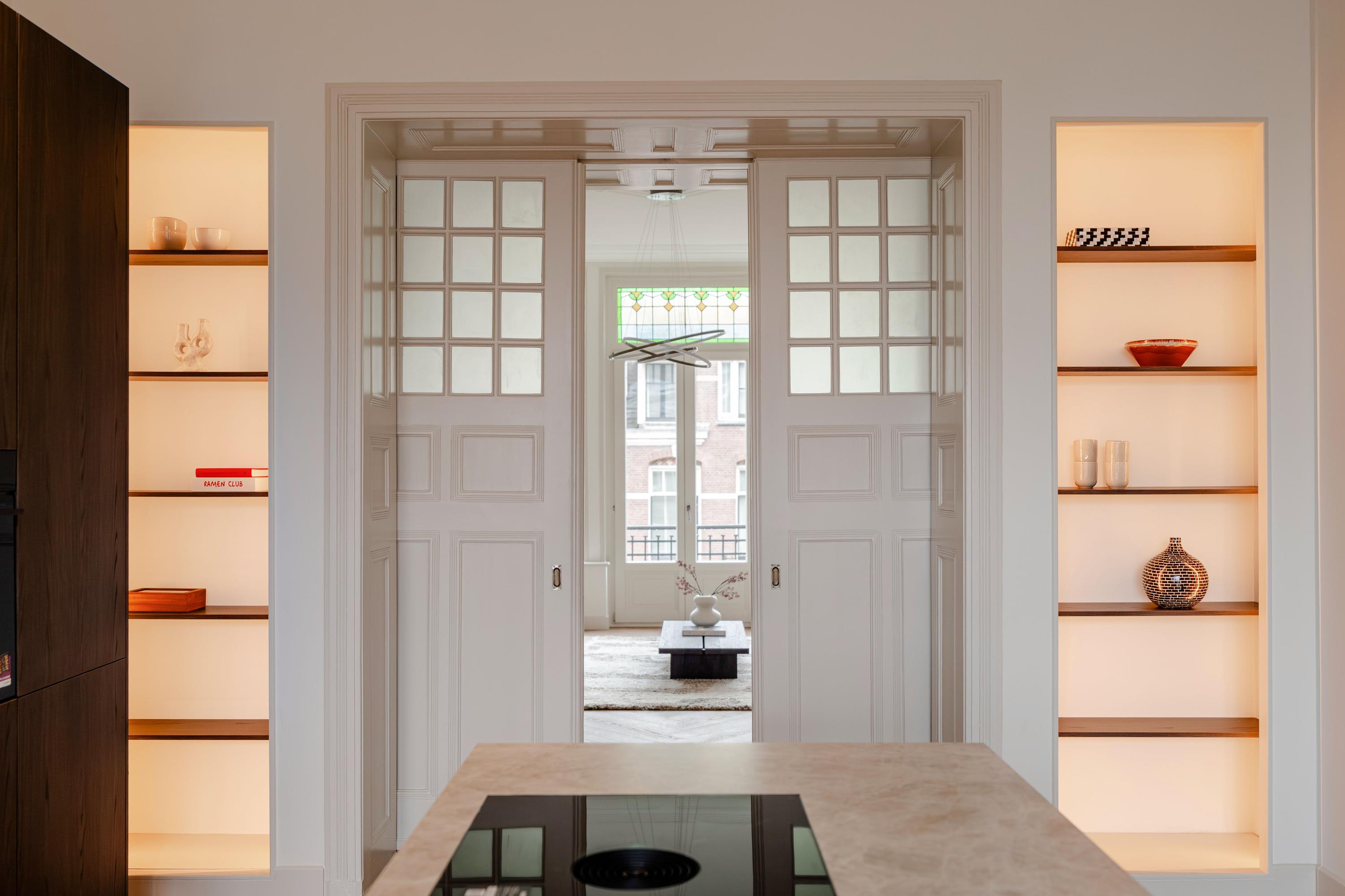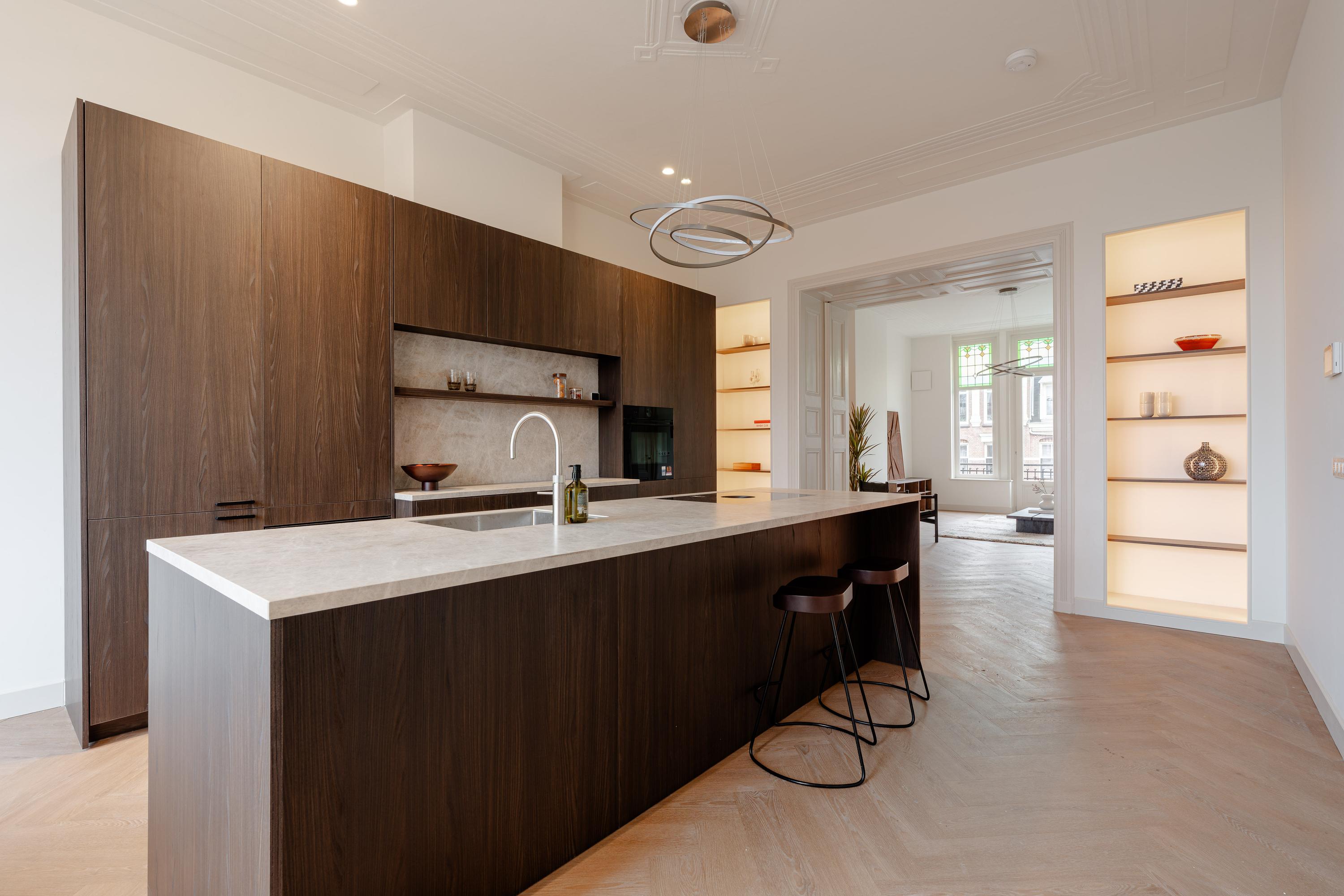 This luxurious apartment is located on the second floor and is characterised by an open and well-considered layout, with large windows at both the front and rear providing pleasant natural light throughout the day. The entire apartment has been finished to a high standard, with a refined and stylish design throughout. The spacious living room is situated at the front of the apartment and features an impressive ceiling height of approximately 3.28 metres. From the living room, there is direct access to the front-facing balcony. Elegant sliding doors allow the living room to be separated from the kitchen and dining area, offering flexibility in how the spaces are arranged and used. Custom-built cabinets have been integrated into the wall between the living room and the kitchen, providing ample space for books and decorative objects while adding a stylish architectural element to the interior. The luxurious kitchen forms the heart of the apartment and is equipped with a generous cooking and sink island featuring an induction hob, sink and Quooker. The kitchen further includes a refrigerator, freezer, combi oven, climate cabinet and ample storage space. The island also serves as an inviting bar area, ideal for casual dining or entertaining. The hallway, located at the front of the apartment, provides access to the first bedroom and the first bathroom. This bathroom is fitted with a walk-in shower and a double washbasin with vanity unit. The separate toilet and the laundry/storage room are also accessible from this hallway. The second bedroom is situated at the quiet rear of the apartment and features a fixed built-in wardrobe and an en-suite bathroom with a walk-in shower and washbasin with vanity unit. The meter cupboard is externally located.