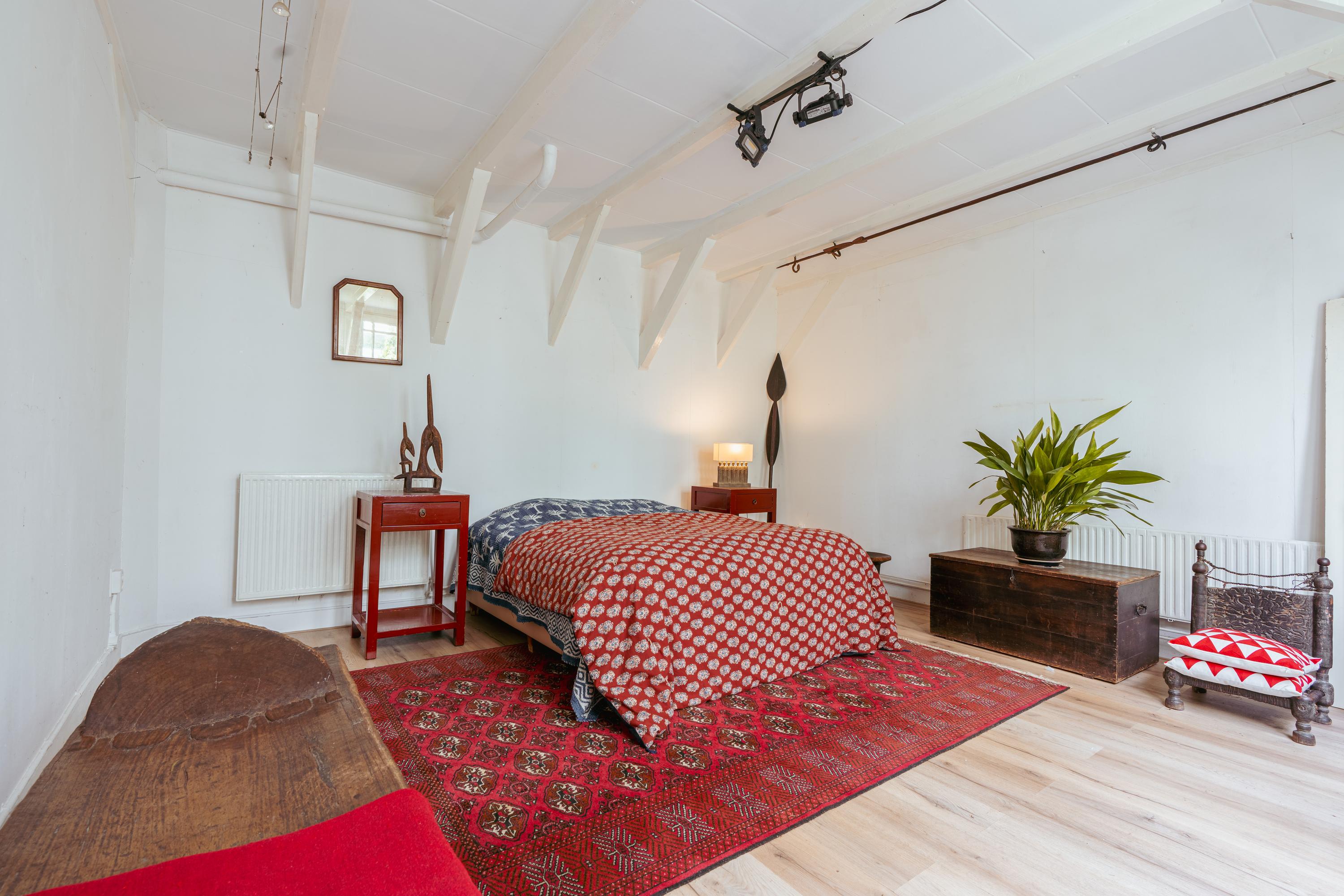 At the front of the basement is the spacious bedroom. This room is quietly located and offers sufficient space for a large bed and a wall of wardrobes. The bedroom also has direct access to the bathroom.