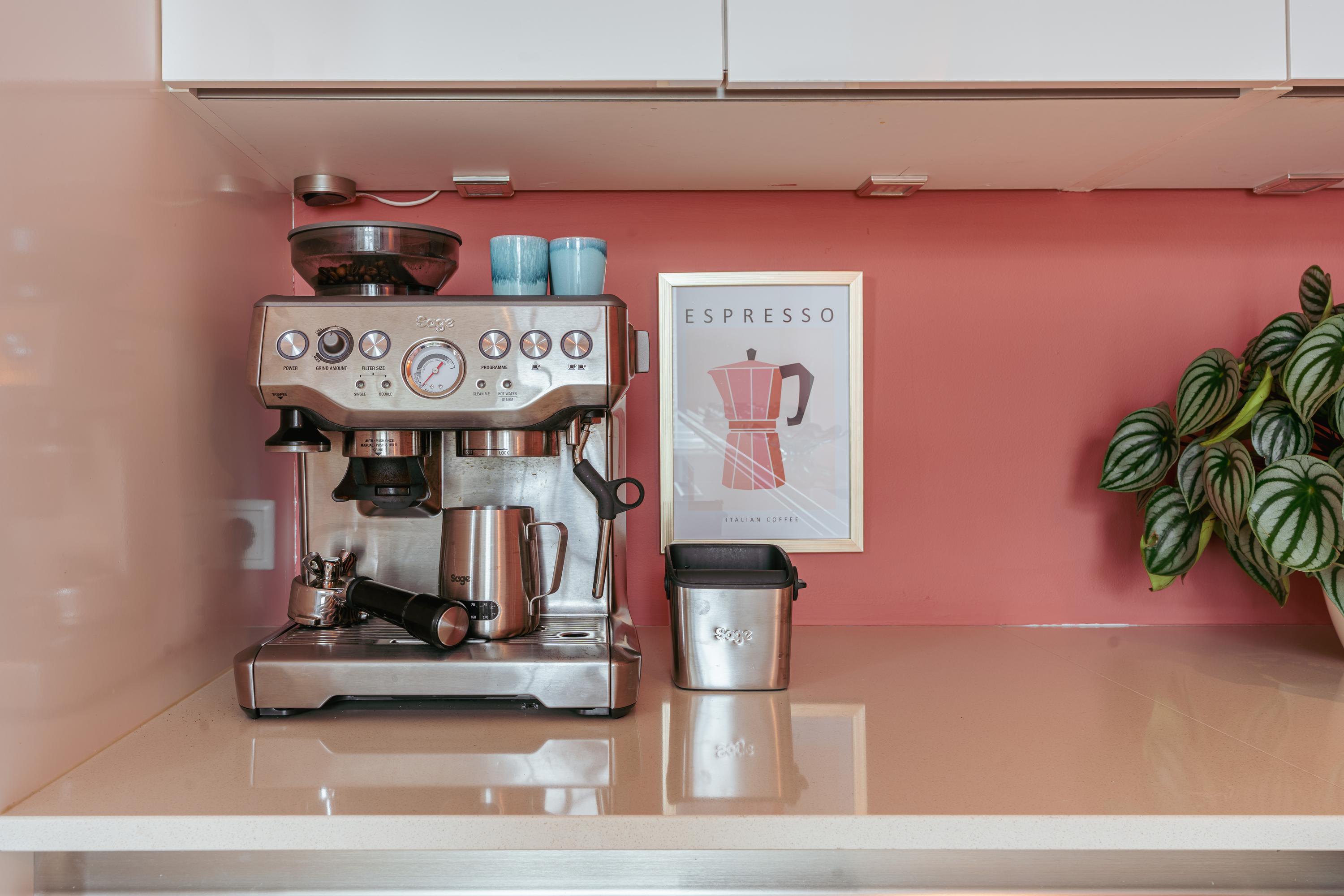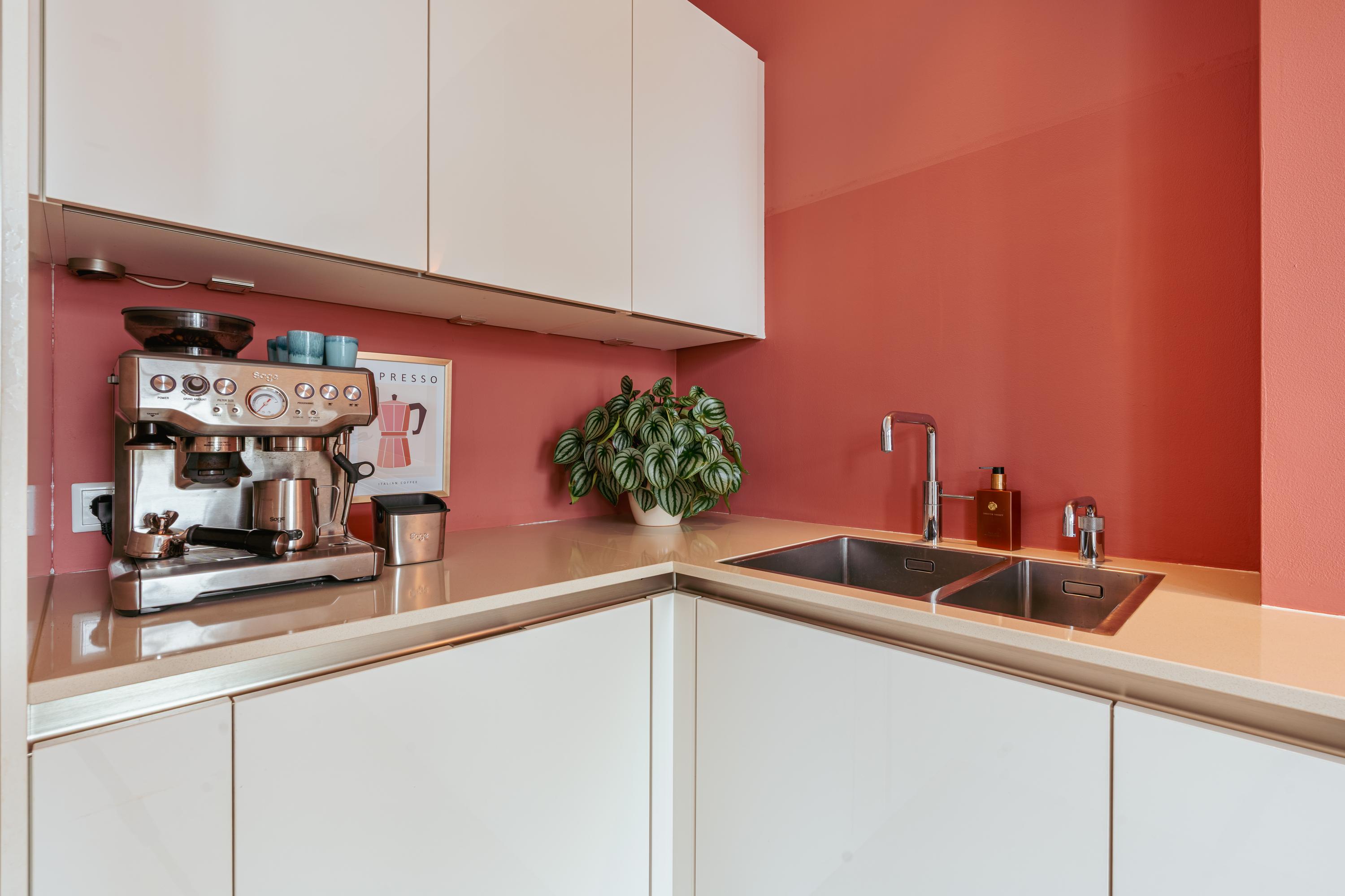 Original wooden en-suite doors connect the living room to the dining area at the rear, where another balcony lets you enjoy the morning sun as early as 7:30 a.m. The adjoining modern kitchen features a fresh design with white cabinets and a large worktop. Fully equipped with high-end appliances including a Quooker, combi-oven, dishwasher, five-burner gas hob, fridge-freezer, and double sink, it is an ideal space for cooking enthusiasts and those who love to host.