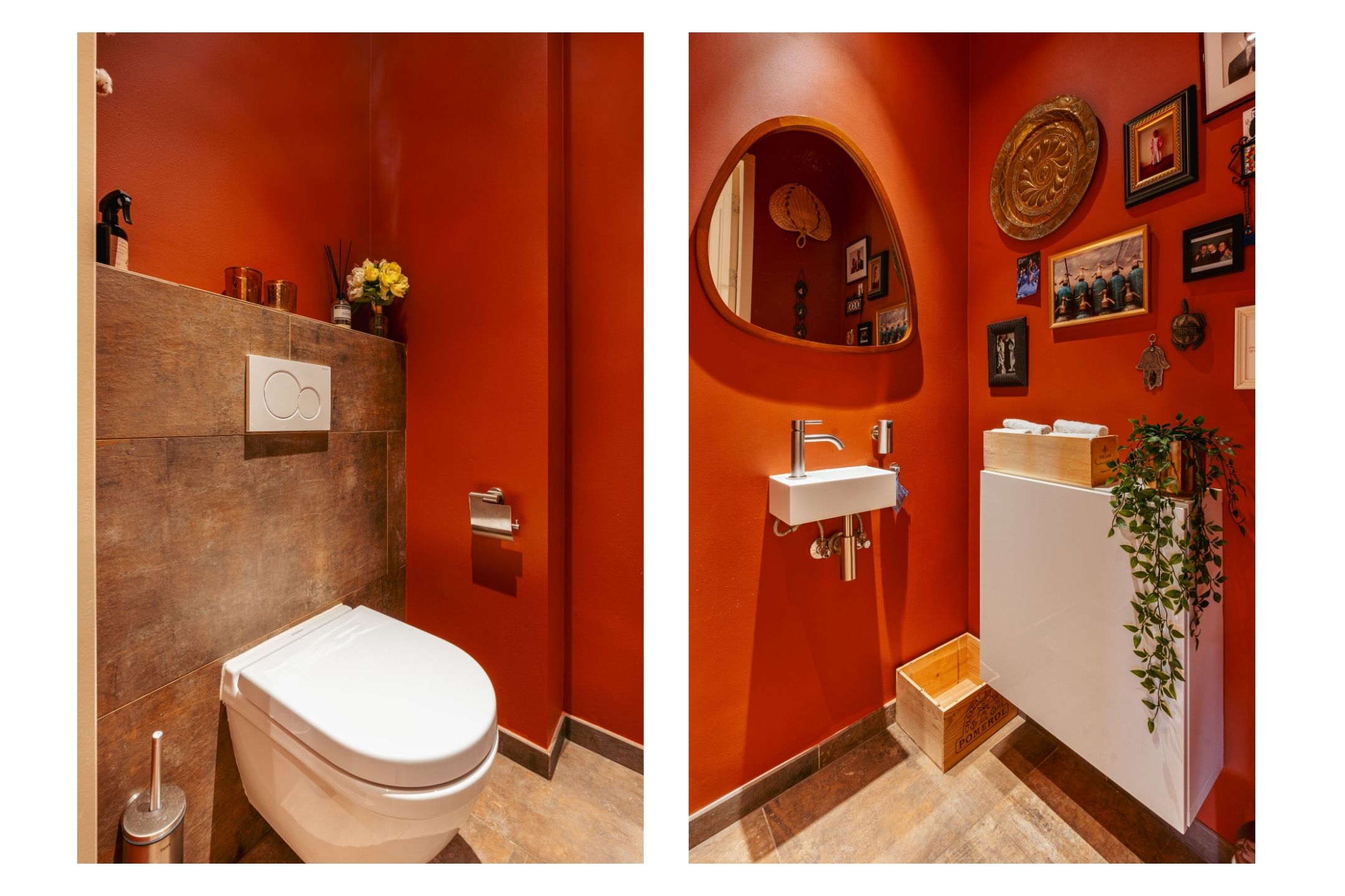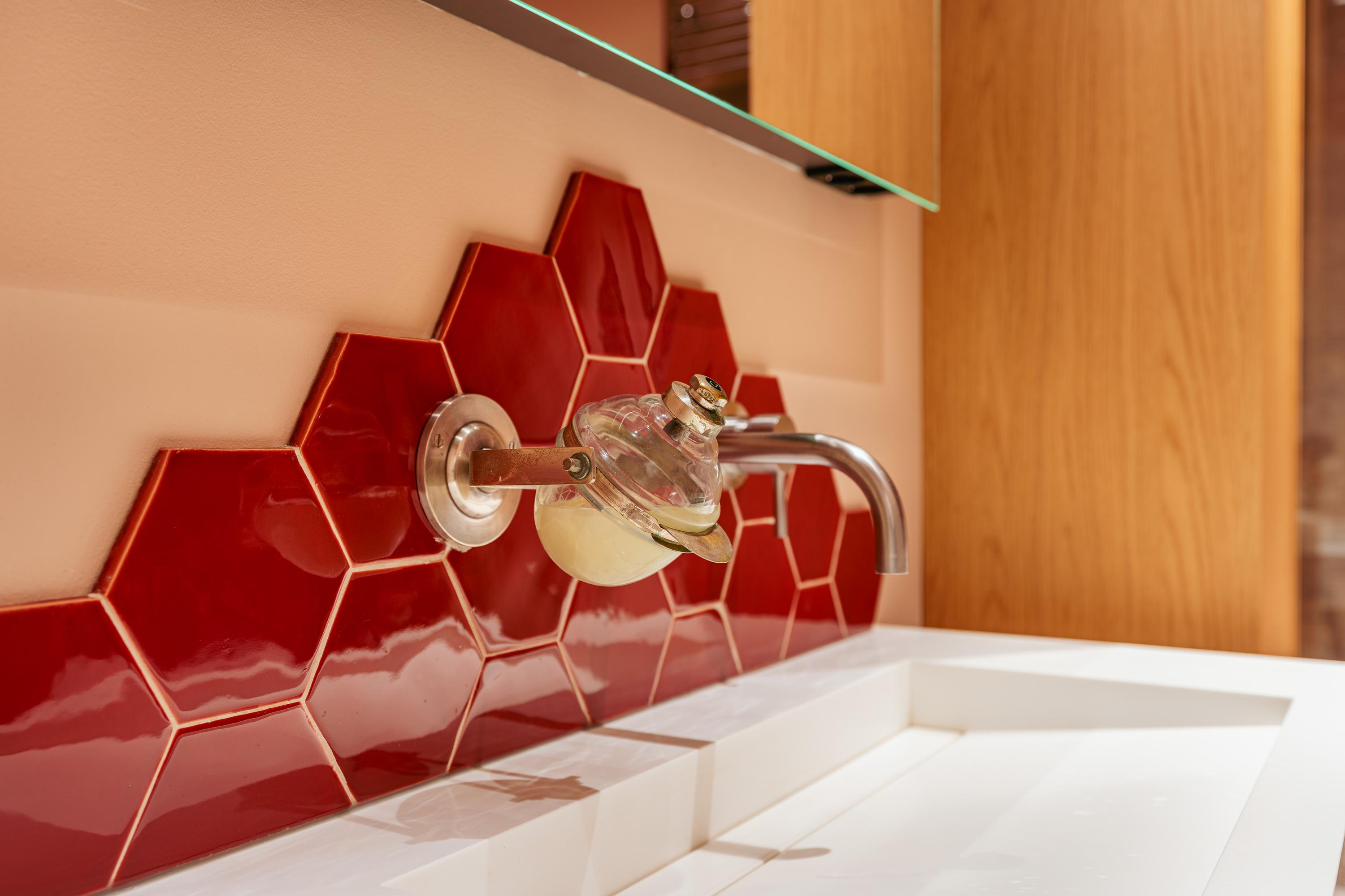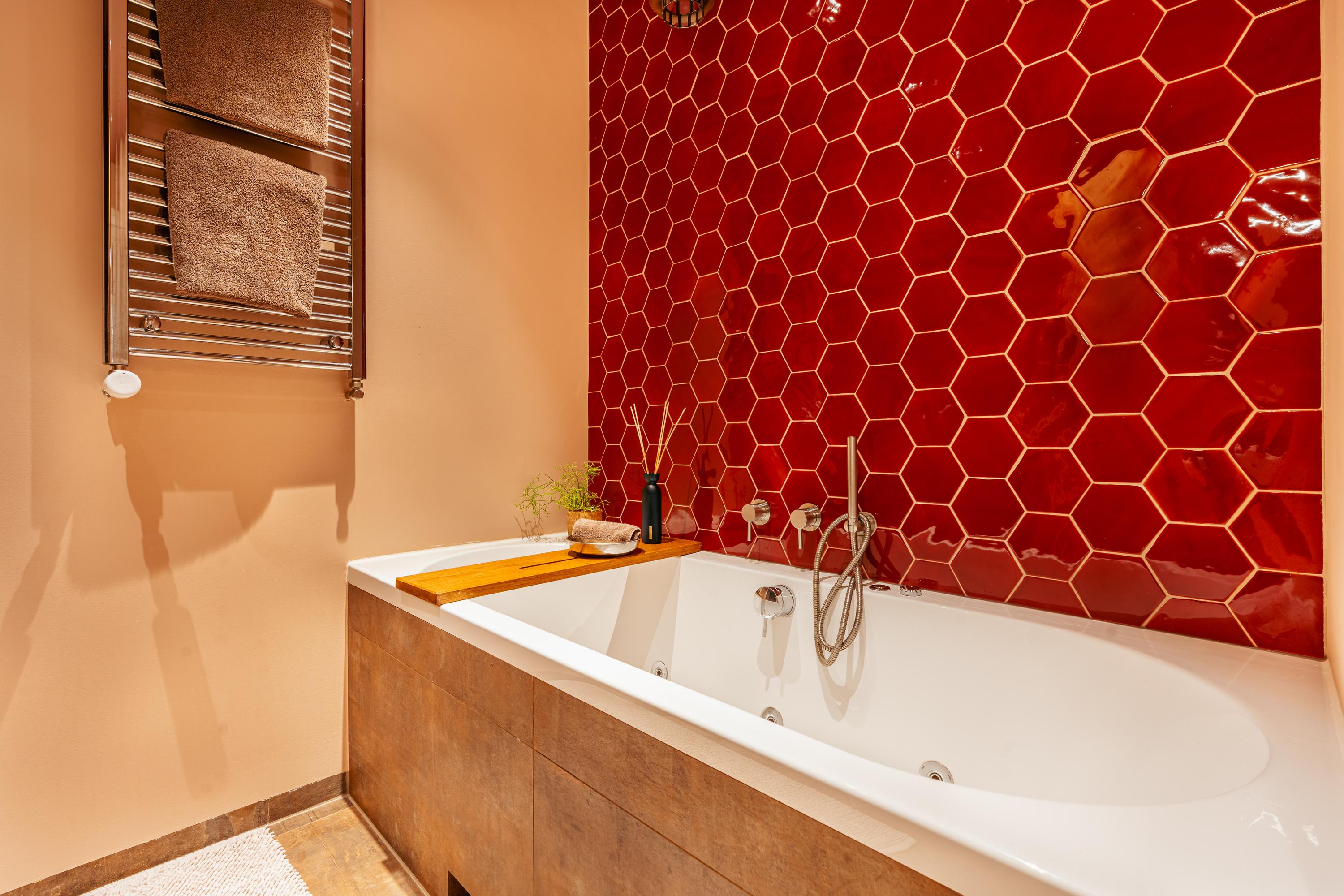 The bathroom is stylishly designed in warm brown shades with a striking red hexagon tile accent. It features a whirlpool bathtub, a separate walk-in rain shower, a vanity unit with ample storage drawers, a wall cabinet, a designer radiator, and underfloor heating. A wonderful place to unwind.