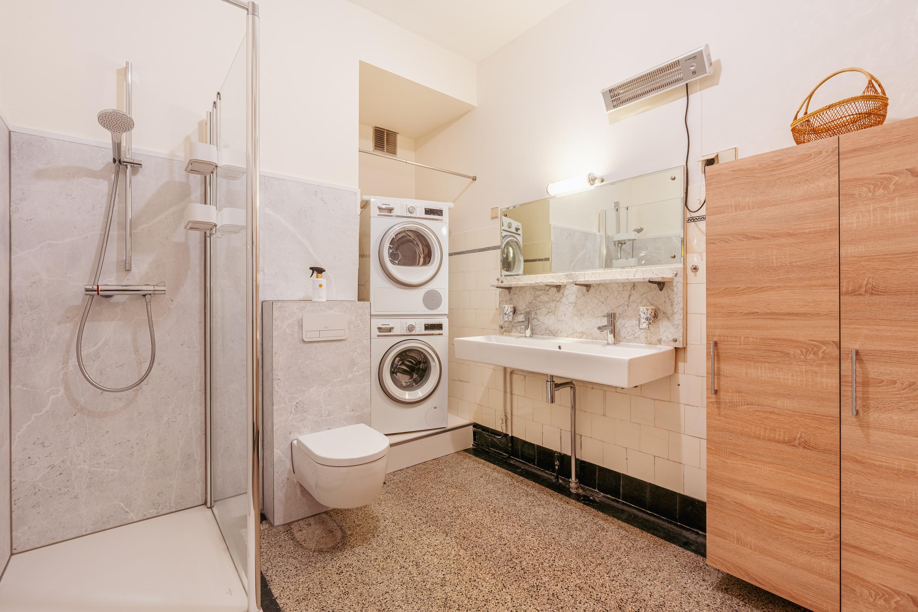 The bathroom is centrally positioned within the apartment and is neatly finished and practically arranged, featuring a walk-in shower, double washbasin and toilet. Furthermore, there is space for a washing machine and dryer setup, ensuring maximum convenience.