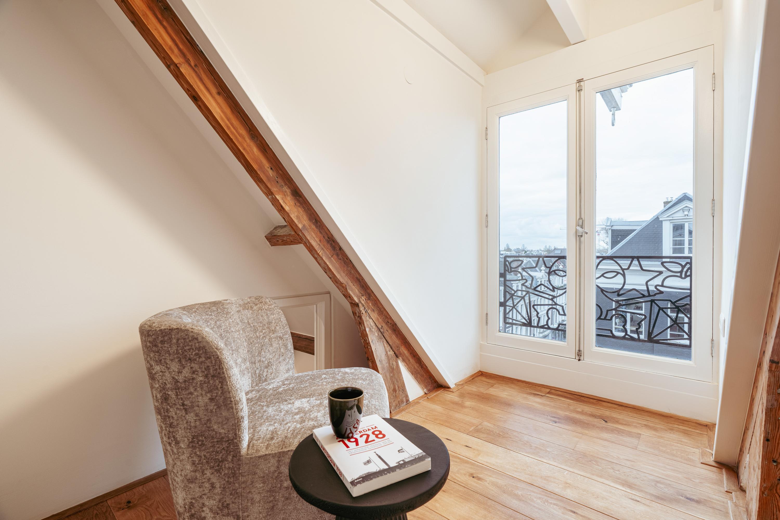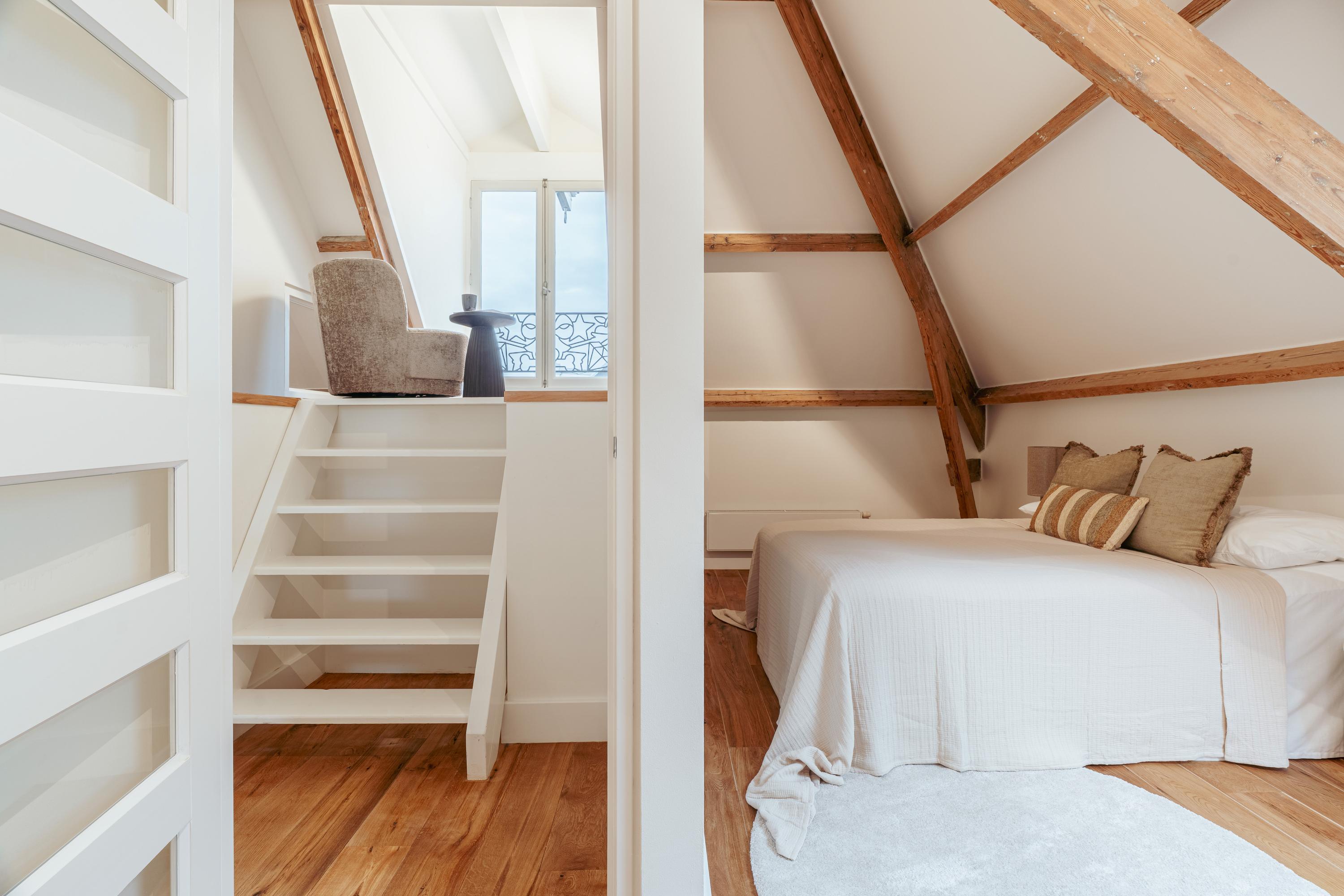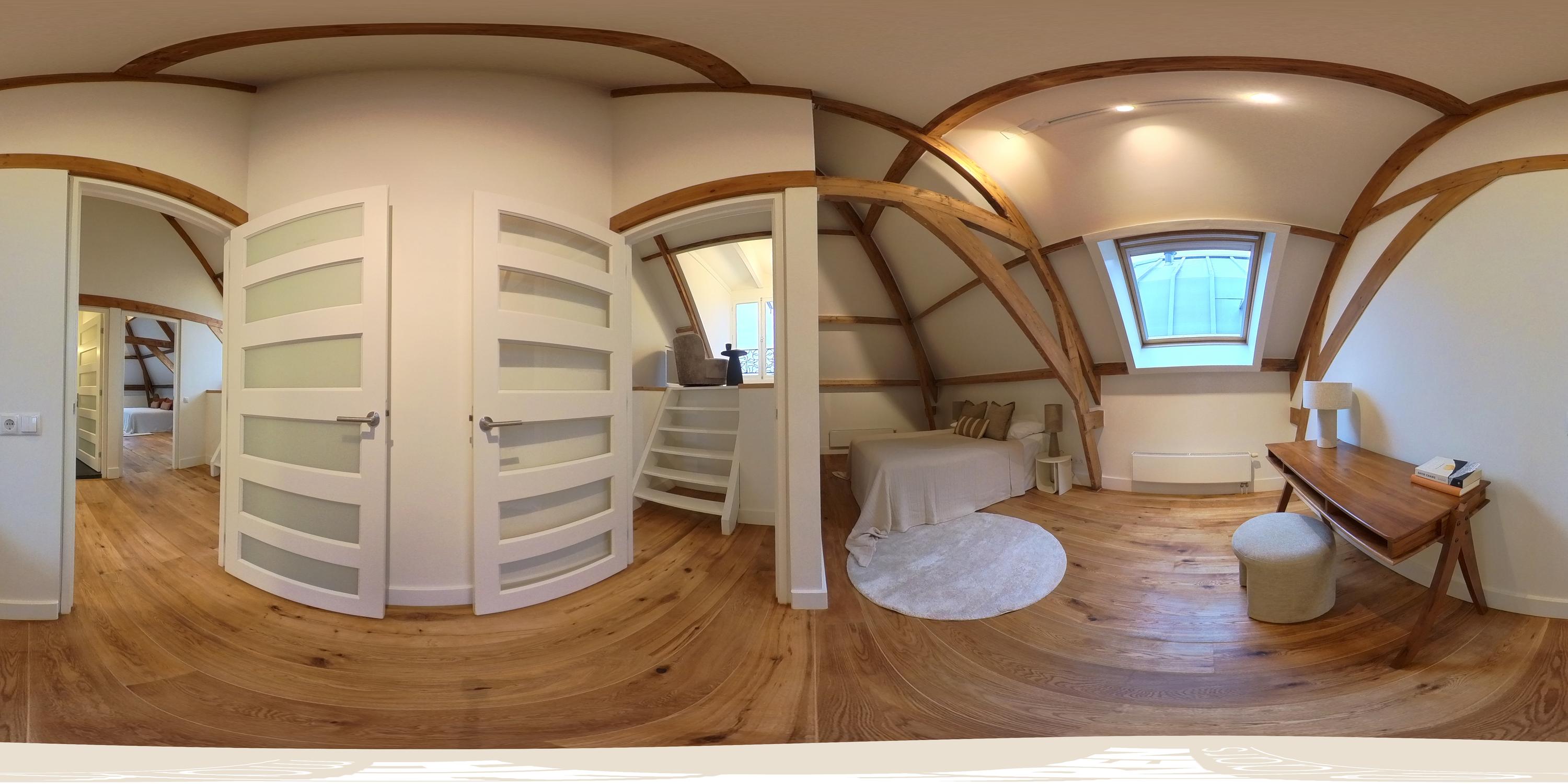 A special and playful feature is the two mezzanines between the rooms — inviting spots for reading or enjoying a cup of coffee. Under these mezzanines are integrated storage cupboards. A small portion of this floor has a ceiling height below 1.5 metres, fitting with the characteristic roof shape. Throughout all rooms, authentic beams remain visible, contributing to the charm of the home.