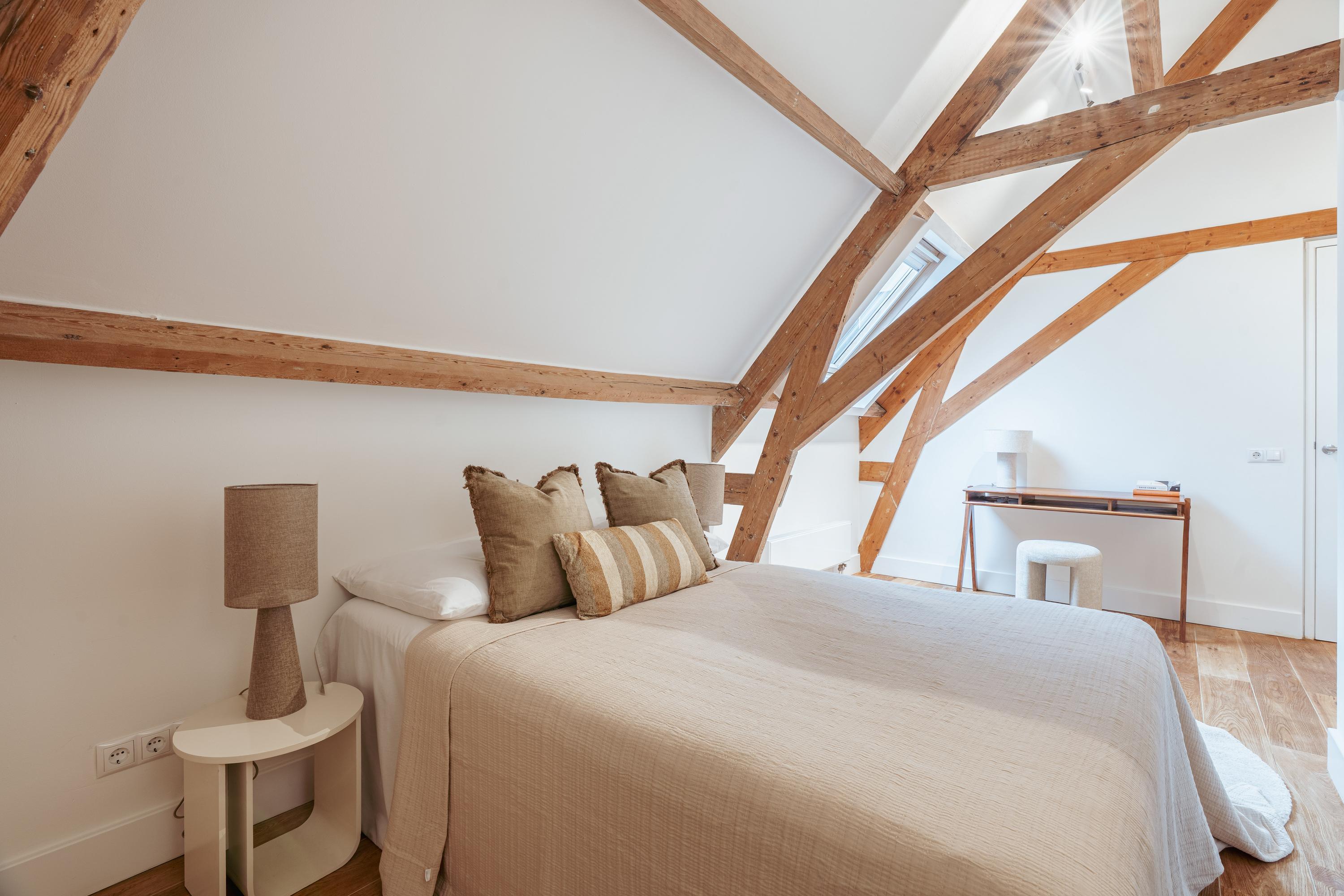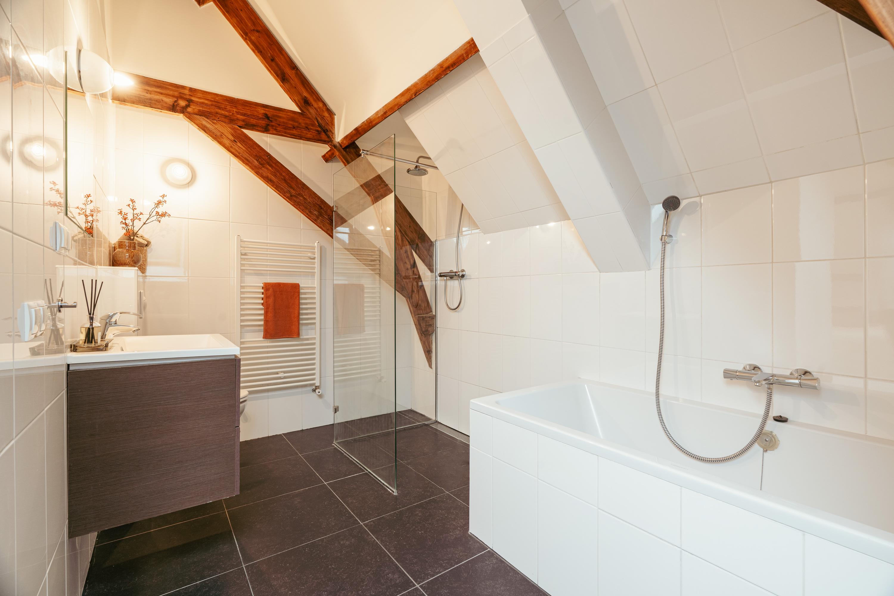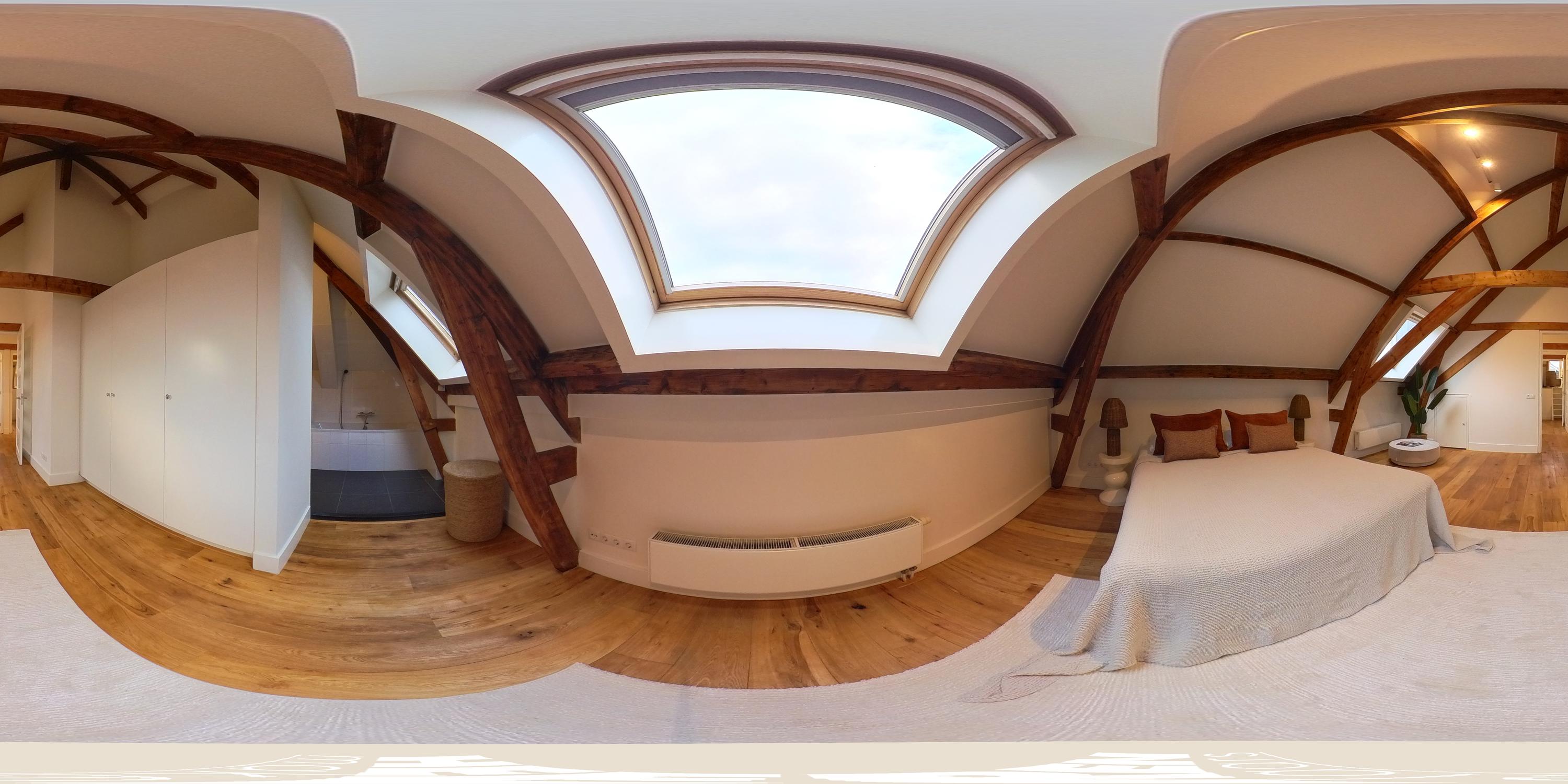 A special and playful feature is the two mezzanines between the rooms — inviting spots for reading or enjoying a cup of coffee. Under these mezzanines are integrated storage cupboards. A small portion of this floor has a ceiling height below 1.5 metres, fitting with the characteristic roof shape. Throughout all rooms, authentic beams remain visible, contributing to the charm of the home.