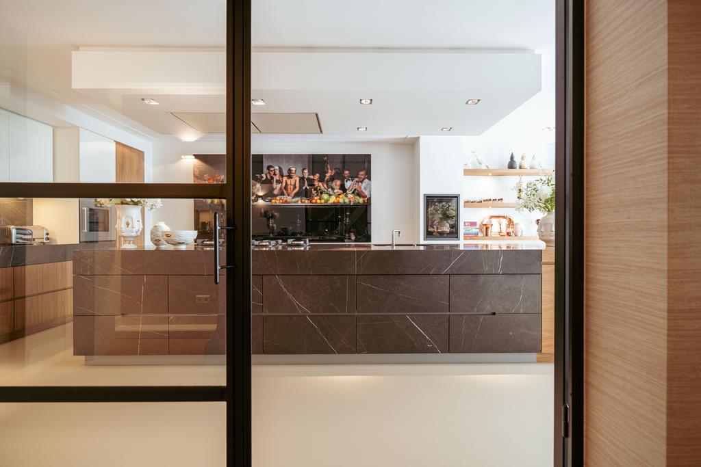 To the front is a bedroom with an en-suite bathroom featuring a washbasin and walk-in shower—currently used as a home gym, but easily repurposed. At the rear is the stunning open-plan kitchen, the centerpiece of this level. Outfitted with Gaggenau appliances, including a fridge, freezer, Quooker, five-burner gas stove integrated into the counter, oven, steam oven, dishwasher, and wine fridge, the kitchen combines luxury and functionality. A solid natural stone countertop with a wooden breakfast bar provides a warm, refined look.