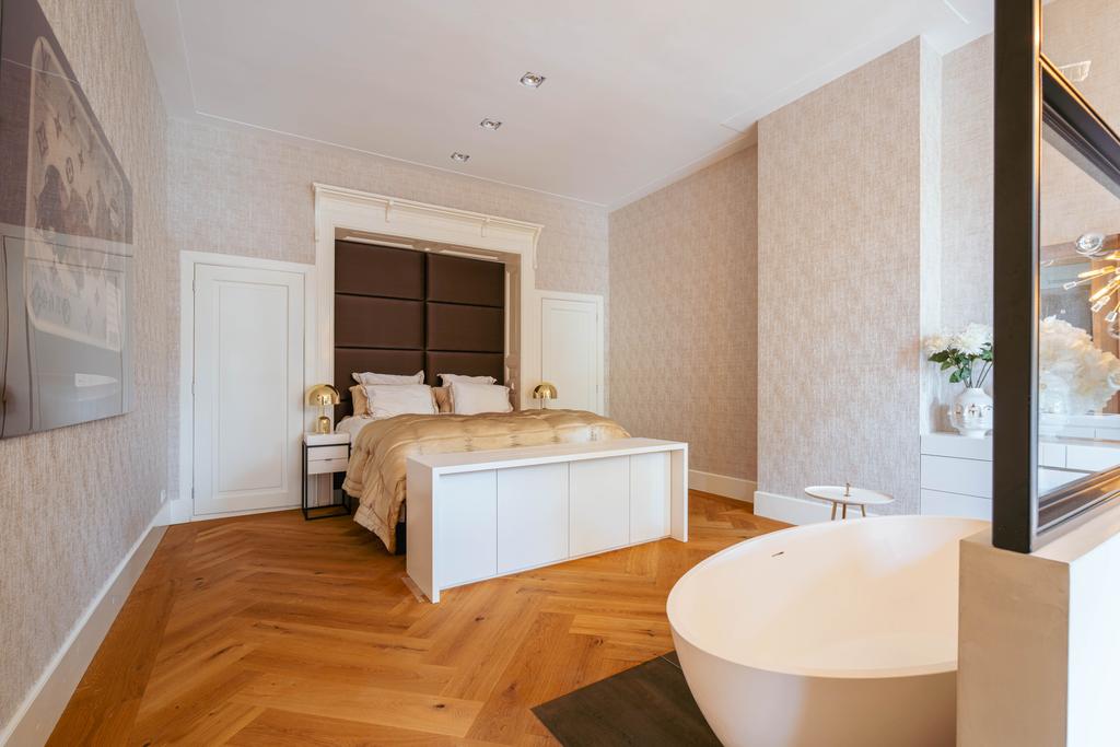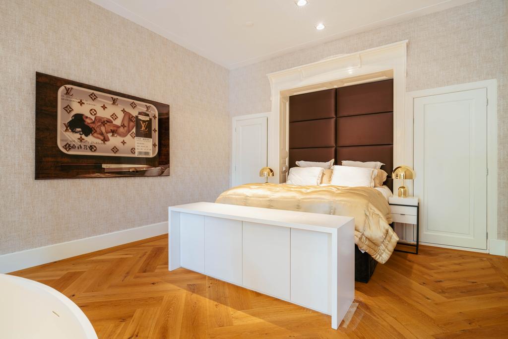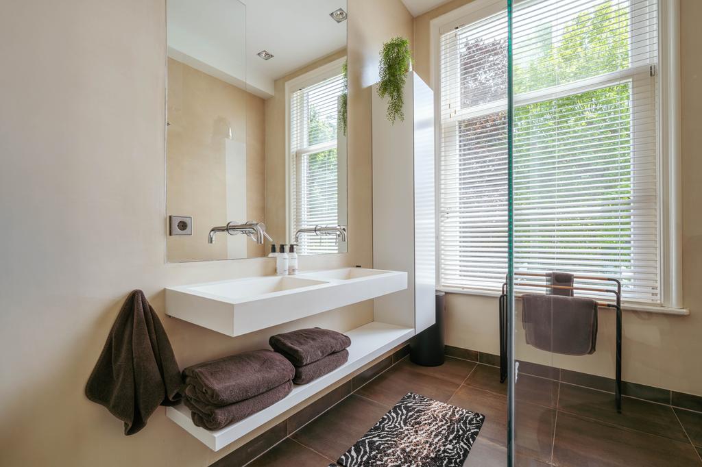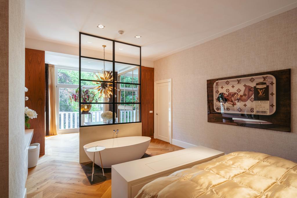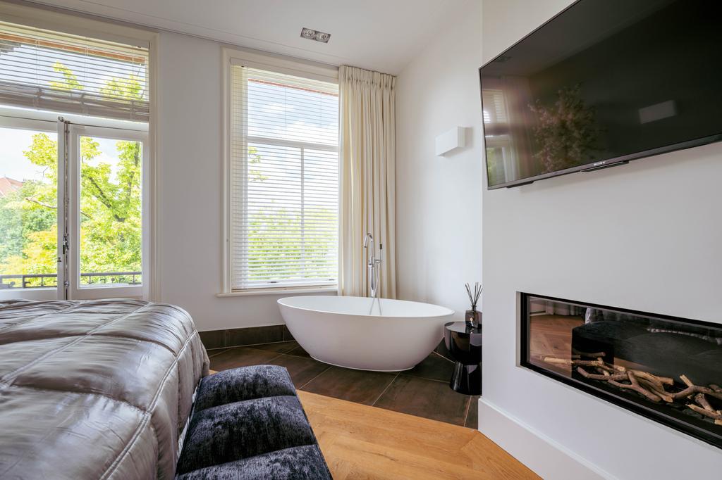 Also at the rear is a modern bathroom with a double vanity, spacious walk-in shower, and toilet. At the front of the home is a second large bedroom, with a gas fireplace, a freestanding bathtub, and French doors opening onto a balcony with breathtaking views over Vondelpark.