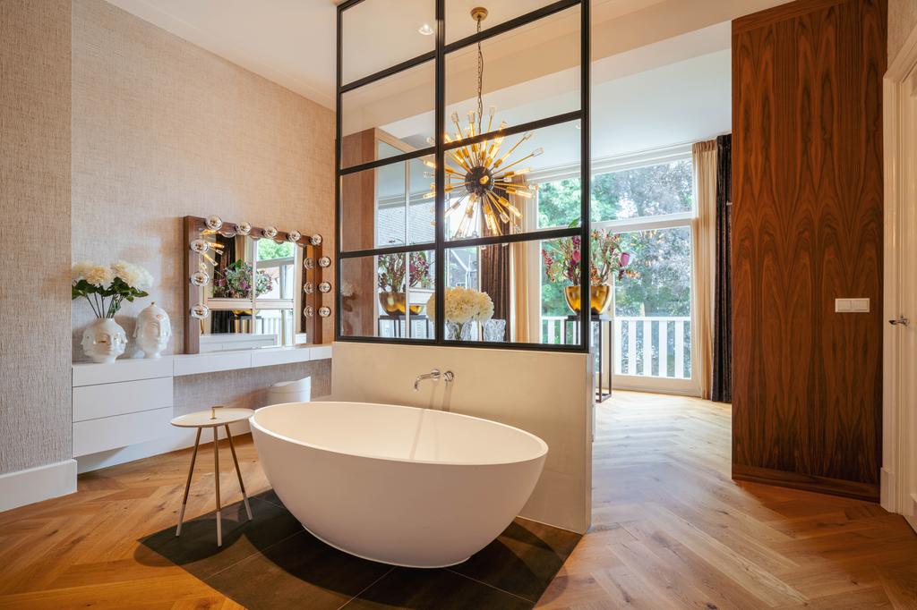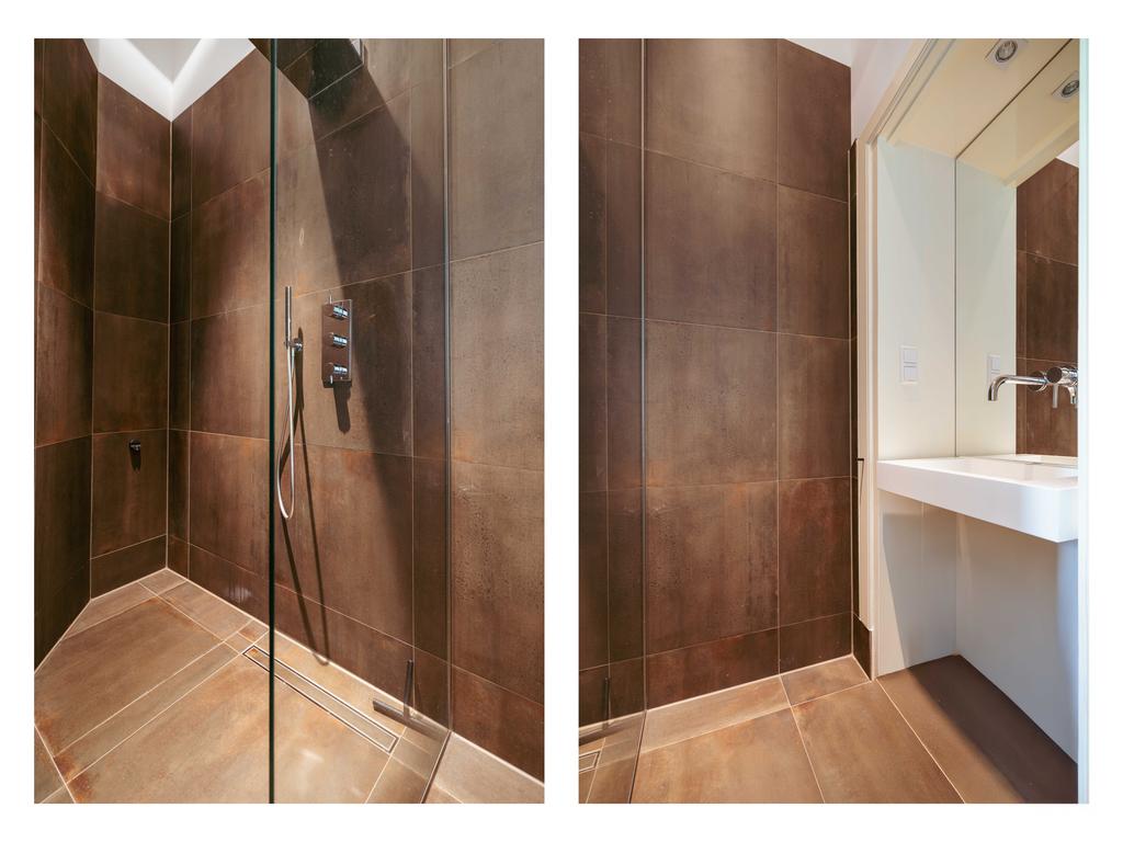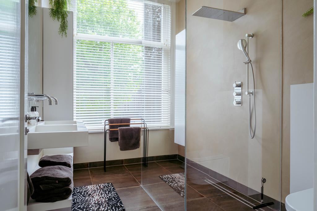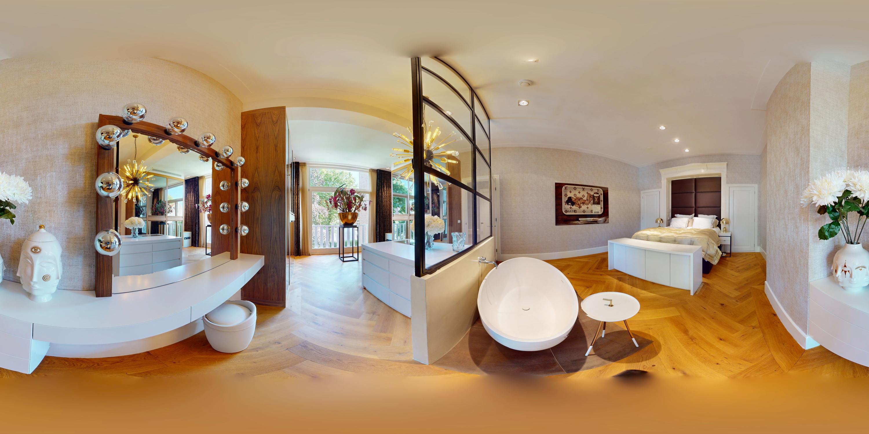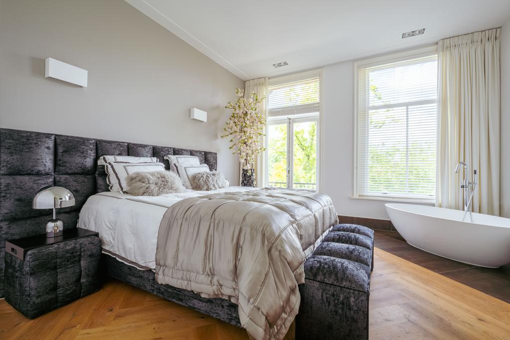 Also at the rear is a modern bathroom with a double vanity, spacious walk-in shower, and toilet. At the front of the home is a second large bedroom, with a gas fireplace, a freestanding bathtub, and French doors opening onto a balcony with breathtaking views over Vondelpark.