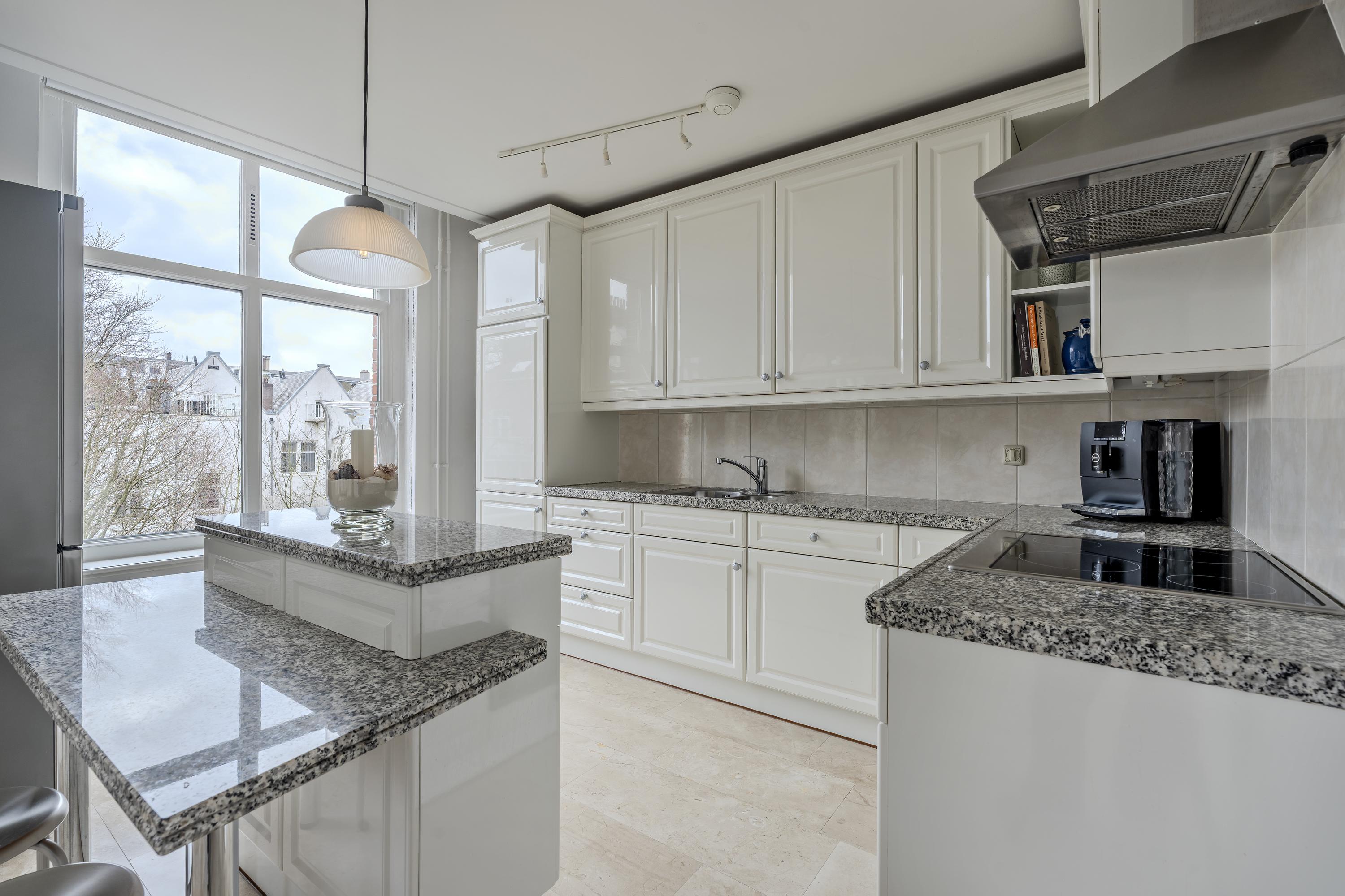 Apartment Amsterdam Vossiusstraat offers a rare confluence of space, privacy, and enduring craftsmanship along one of Amsterdam's most revered addresses. This 130 m² duplex resides in a monumental building directly adjacent to Vondelpark, enveloping you in verdant views and the cultural pulse of Oud-Zuid. From the expansive living room with fireplace and wide French balconies, the lushness of the Vondelpark and the curve of the Singelgracht become part of daily rhythm. The dining area, with an open kitchen and island, flows onto a south-east facing balcony of approximately 4 m², where morning light reveals glimpses of the Rijksmuseum and the energy of P.C. Hooftstraat below.