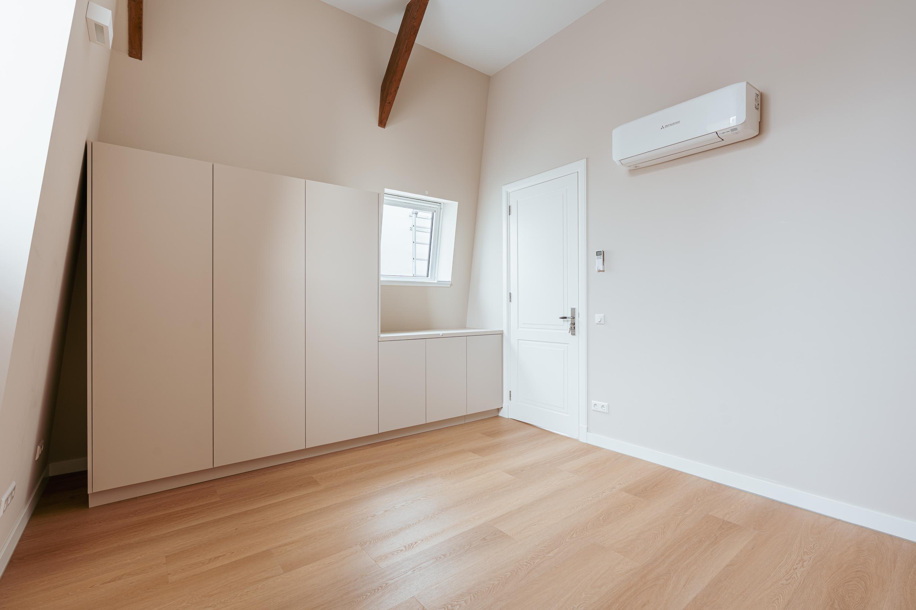 A fixed staircase leads to the top floor, where the landing again offers a separate toilet. On either side are two spacious bedrooms, both equipped with air conditioning. The exposed wooden beams add charm and character to the rooms, enhanced by the impressive ceiling height of 3.70 metres. From one of the bedrooms, there is access to the attic loft with additional storage space of approximately 12 m².
