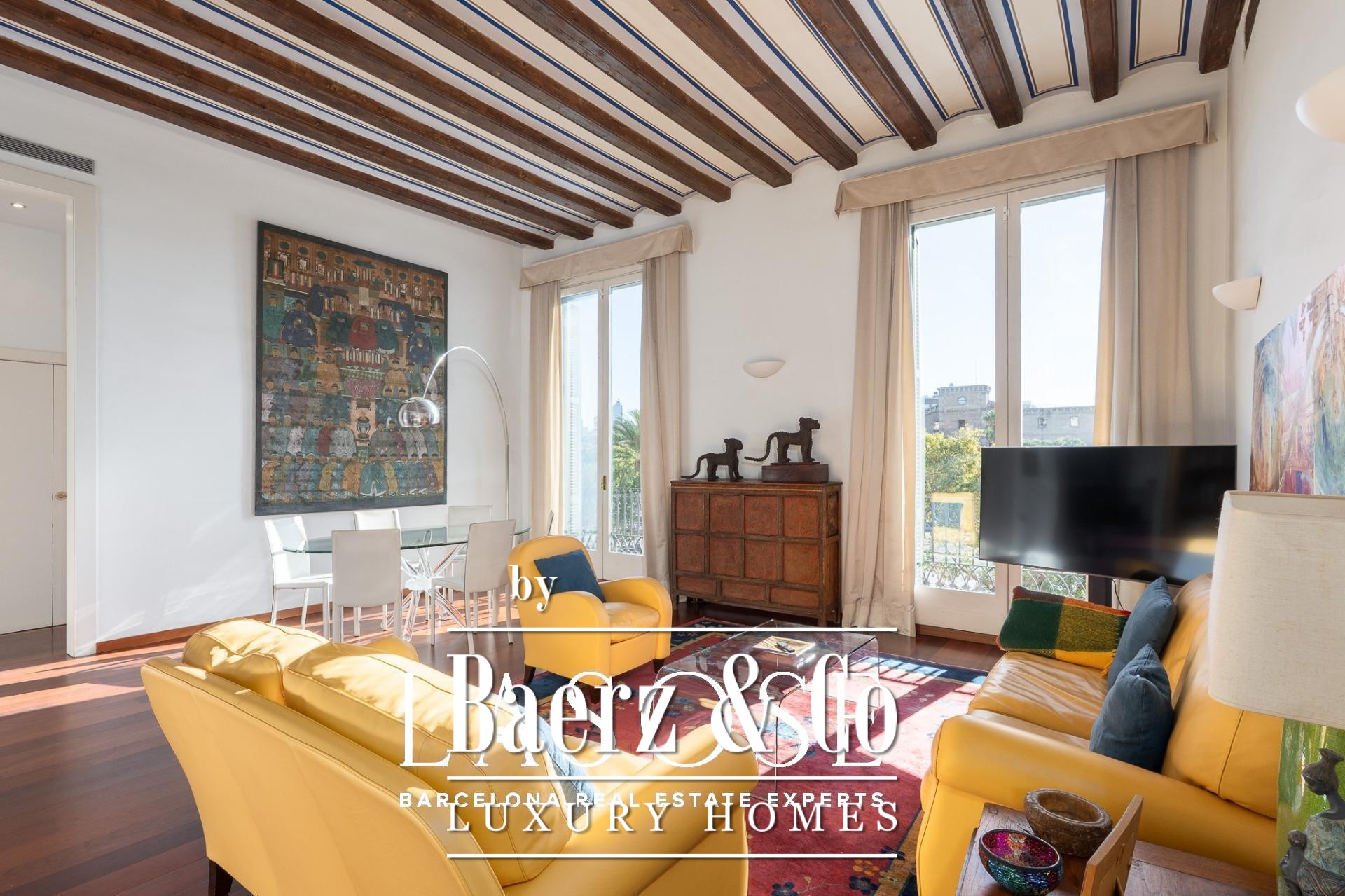 Apartment Barcelona sets its stage within a historic building overlooking the city’s marina. This apartment, spanning 122 m², occupies a distinguished address on Carrer Llauder and presents a rare interplay of heritage and contemporary living. Step inside to a volume defined by 3.8-meter ceilings, exposed wooden beams, and Catalan vaulted ceilings with hand-painted details. Wrought-iron balconies frame the open sea and the greenery of Las Ramblas de Mar, filling each room with Mediterranean light.