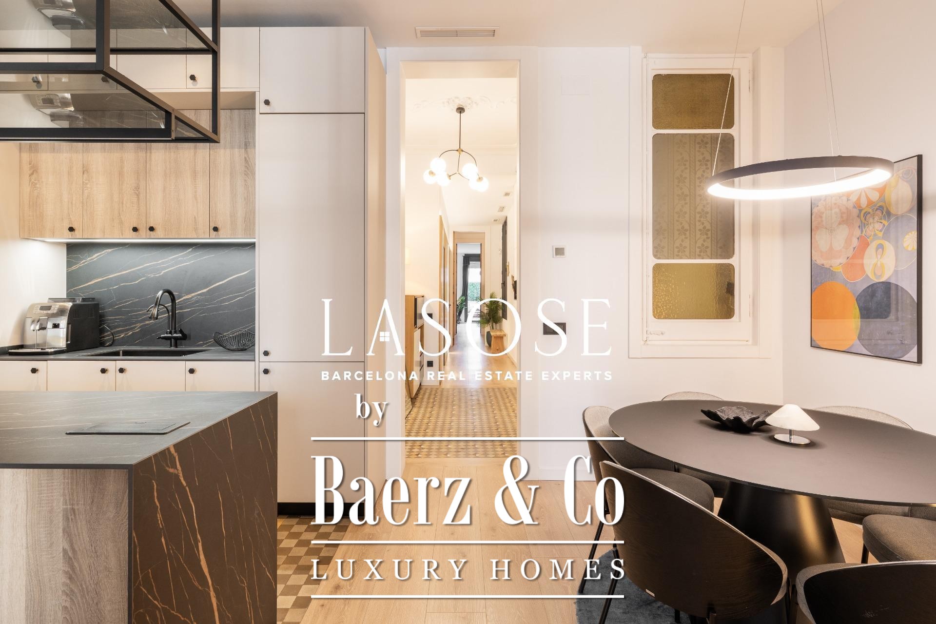 Apartment Barcelona Eixample is quietly positioned on the Principal floor of a protected Modernist building near Passeig de Sant Joan. Completed just two years ago, the most recent renovation blends contemporary luxury with the building’s original charm, highlighting Nolla mosaic hydraulic floors, high ceilings adorned with decorative moldings, and refined architectural details throughout.