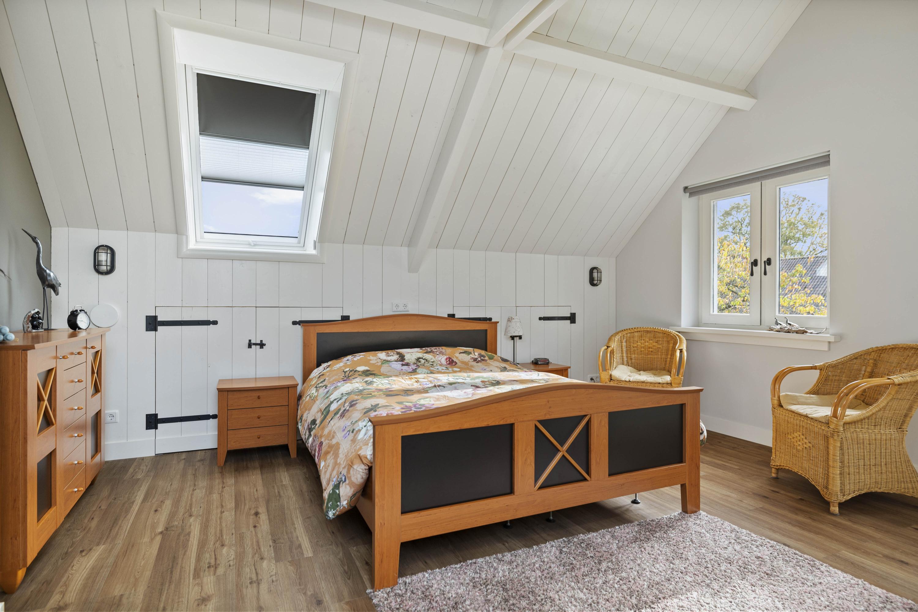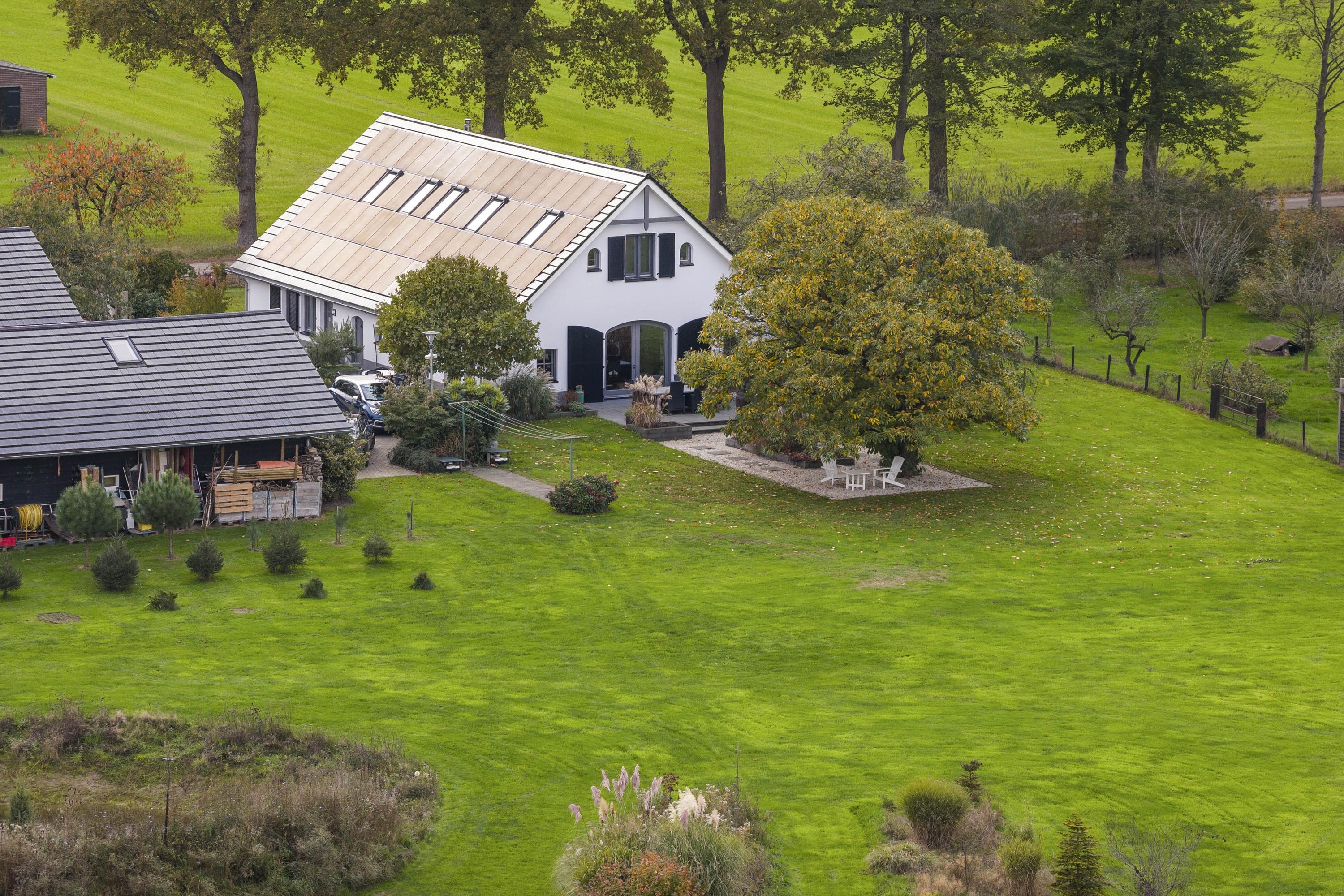 This magnificent farmhouse took on its current form in 2016, when the farm, which was built in 1924, was completely renovated. The emphasis was on sustainability: the exterior was fully insulated with polystyrene blocks, the house was fitted with new HR+++ glass all around, a water-water heat pump was installed (which exchanges and extracts heat at a depth of 75 metres), the interior floor was fitted with a robust cast floor – ideal in combination with underfloor heating – and a total of 110 (no, this is not a typo) solar panels were installed on the roofs. Under the bonnet, this house is all state-of-the-art technical ingenuity. Even the colour palette – the exterior is whitewashed with grey woodwork and beaded edging – contributes to the energy-efficient character of the house, because while the white facades reflect sunlight, the grey absorbs heat. Not only does this house have zero energy consumption, it also generates a considerable amount of energy! A home battery is therefore an excellent addition here.