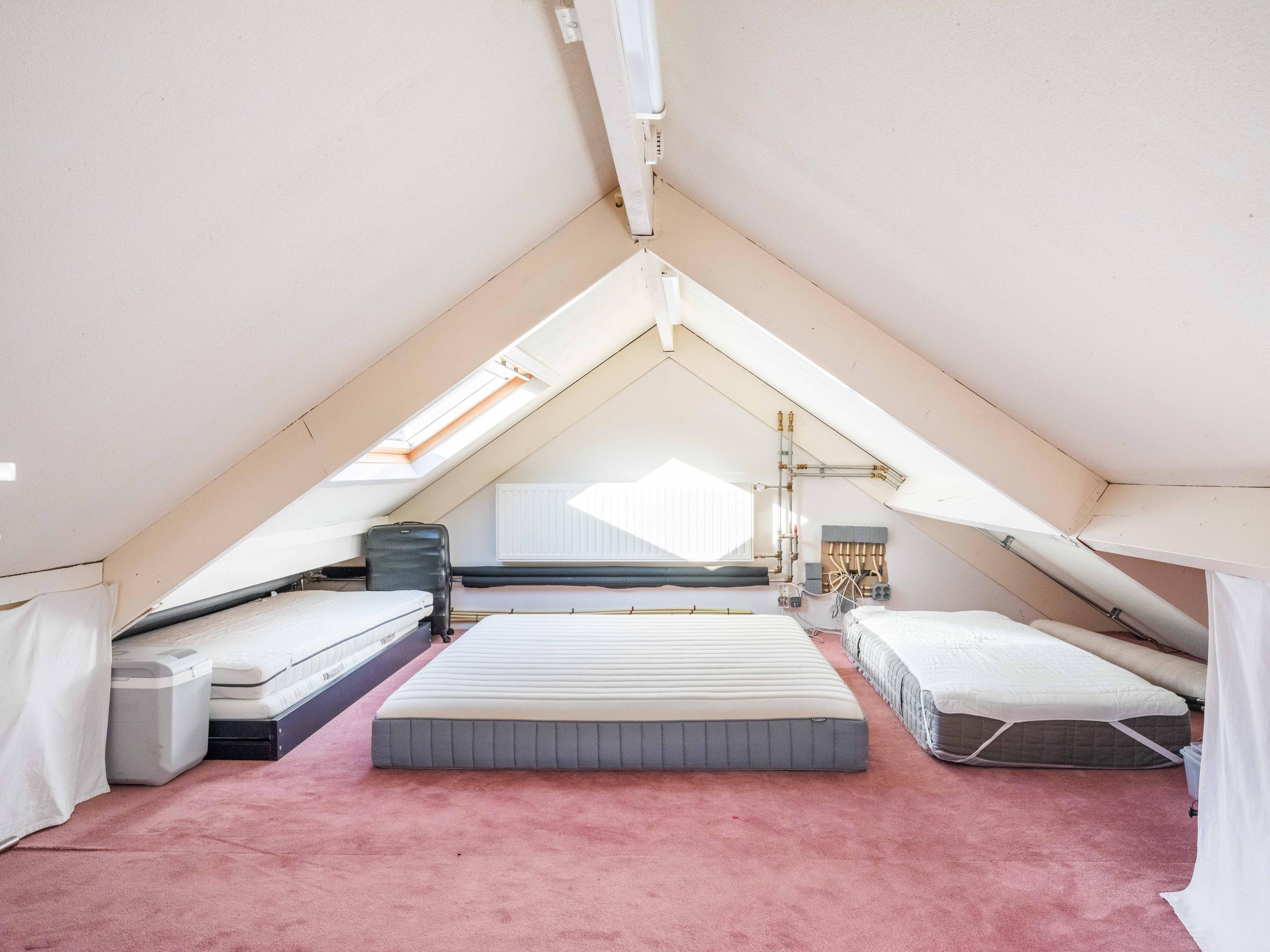 A fixed staircase on the landing leads to the attic floor which is divided into a bedroom area and storage room.