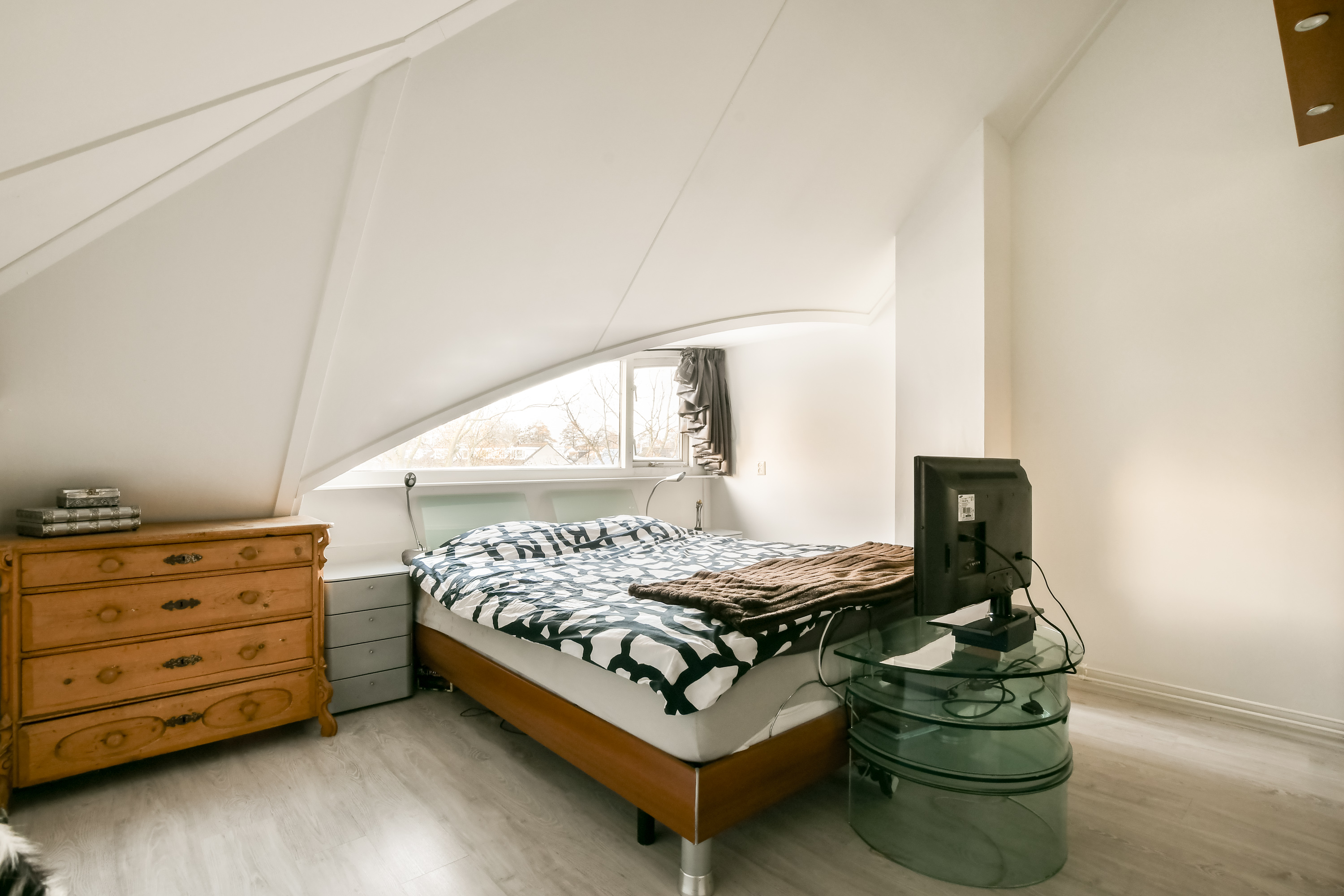 De ruime vierde slaapkamer aan de voorzijde beschikt over vaste kasten, een dakkapel en een laminaatvloer.