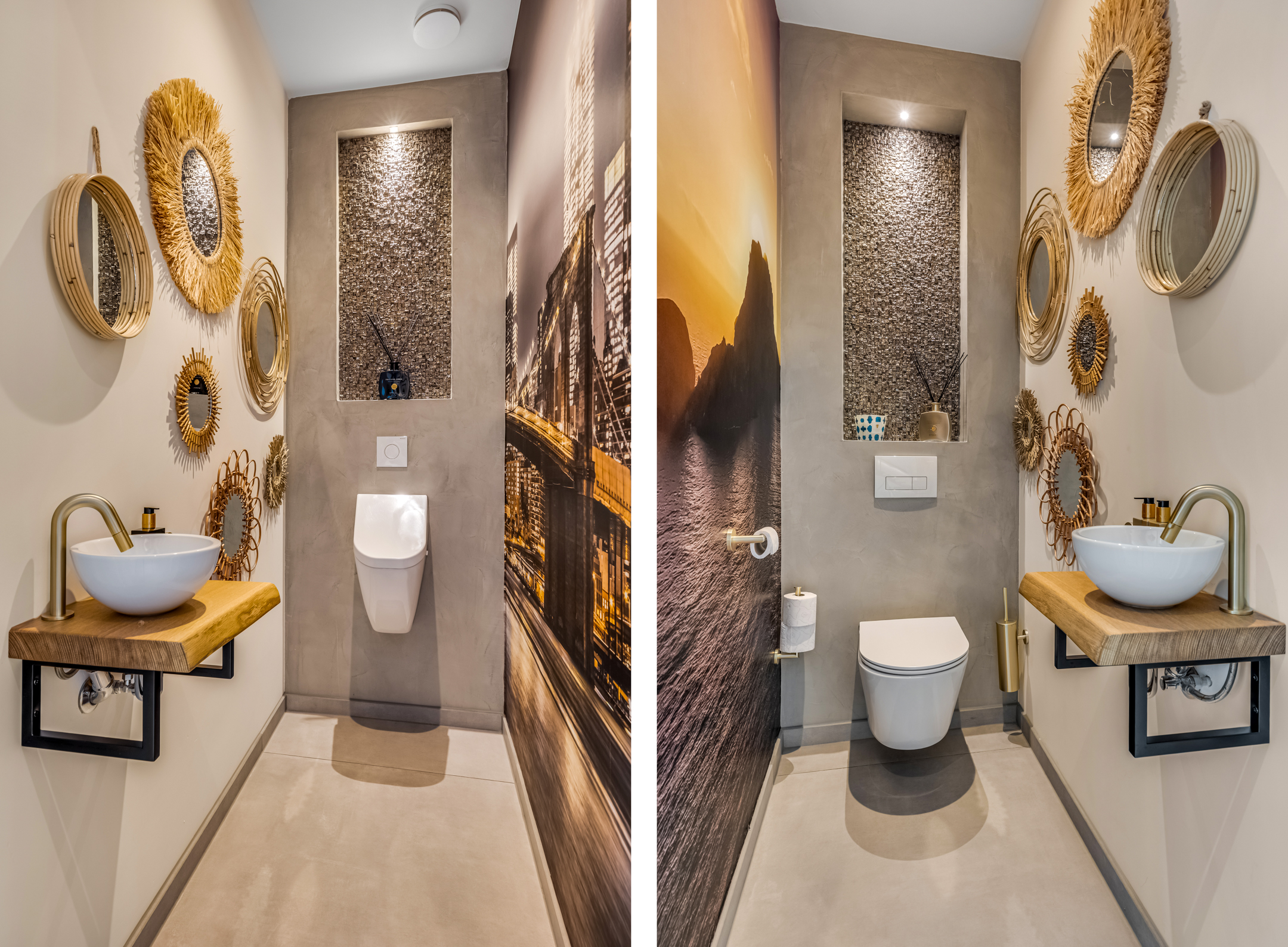 Approx. 8.5 m², with tiled flooring, plastered walls (beton ciré), plastered ceiling, walk-in shower, and a vanity unit with two sinks.