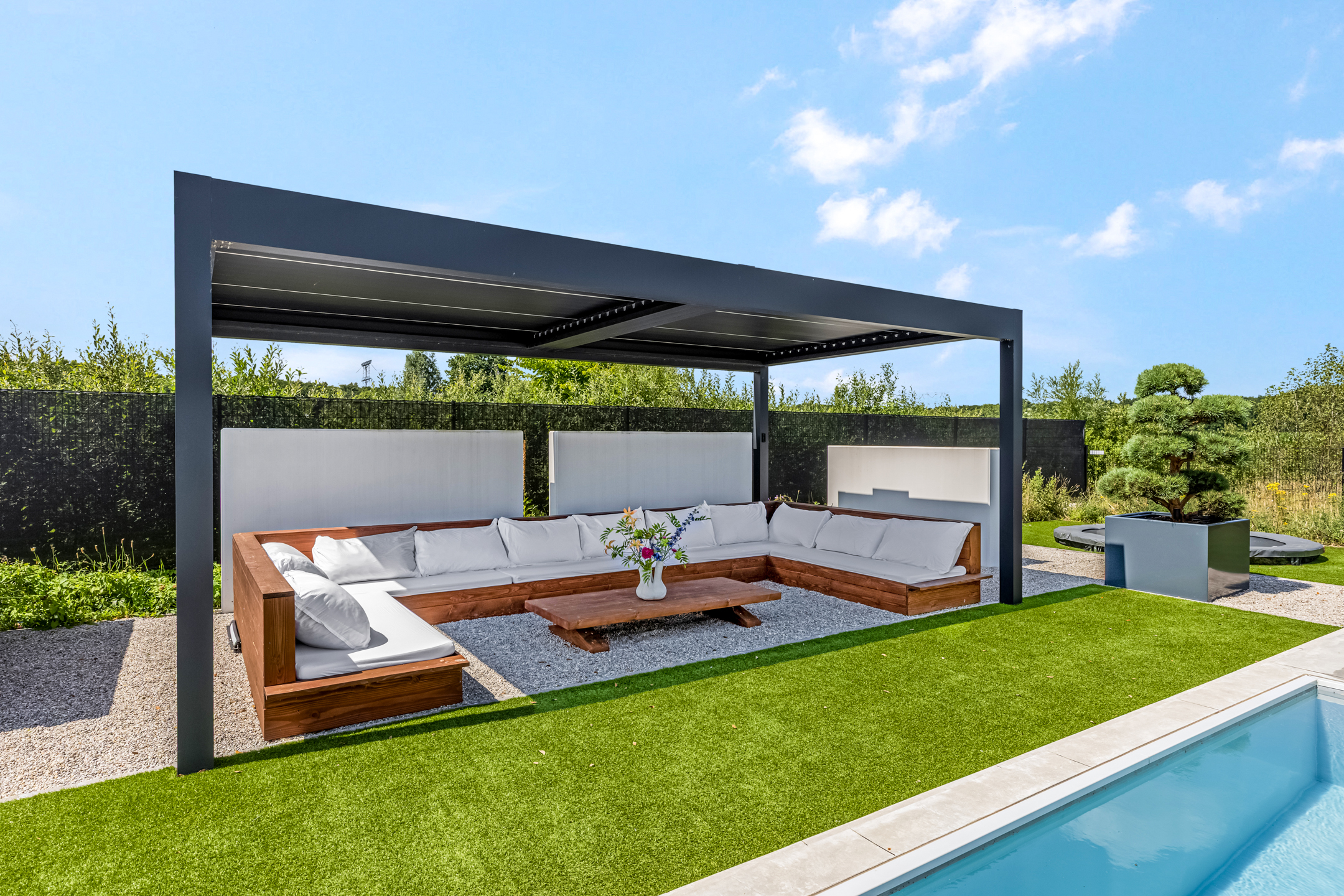Approx. 26 m², with lighting, automatic louvered roof, and custom hardwood lounge bench.