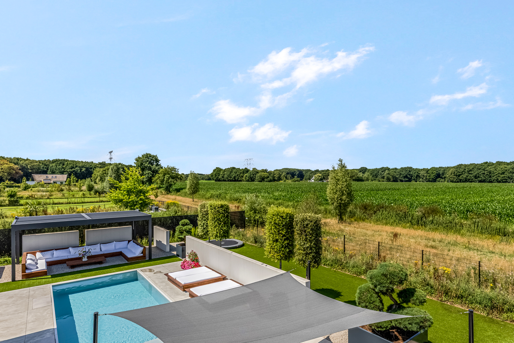 Outside, enjoyment reaches its peak: a heated swimming pool, multiple covered terraces, and a luxury veranda turn outdoor living into a true experience. Everything breathes peace, comfort, and exclusivity. You’ll enjoy maximum privacy, with open views over expansive agricultural fields to the side and the green paddocks behind. This unique combination of space and nature enhances the feeling of freedom.