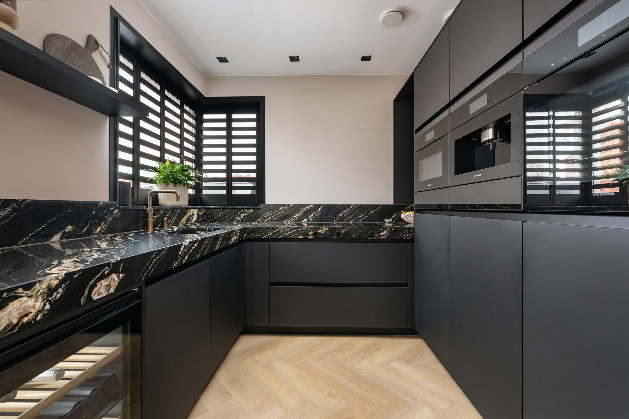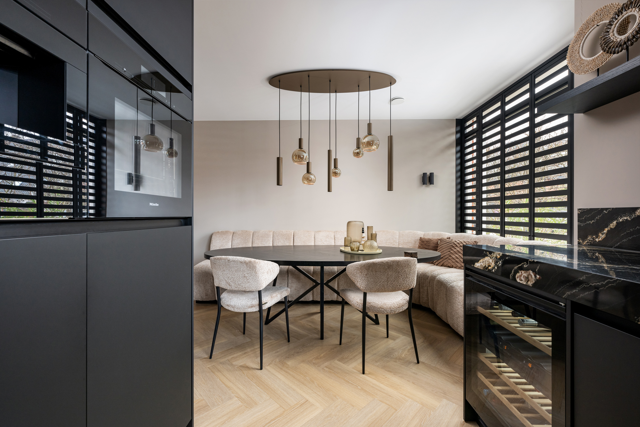 At the front of the house you will find the luxurious open-plan kitchen – a real eye-catcher – finished with an exclusive quartzite marble countertop. The kitchen is equipped with high-end built-in appliances including an induction cooktop with integrated Bora extraction system, two ovens, warming drawers, a built-in coffee machine, refrigerator, wine climate cabinet, dishwasher and a Quooker tap.