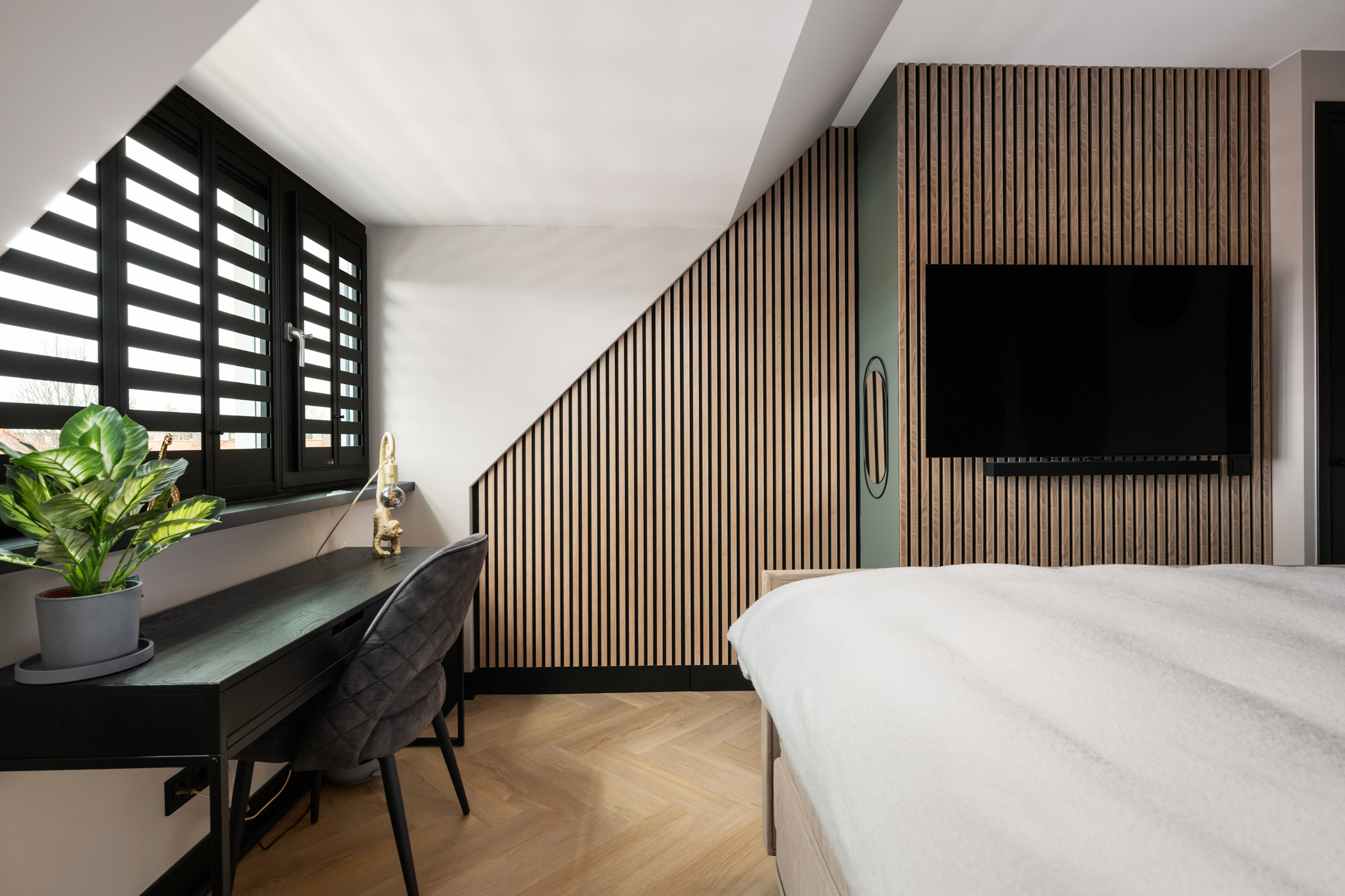 At the front you will find the third bedroom, equipped with air conditioning and built-in wardrobes hidden behind a stylish slatted wall.