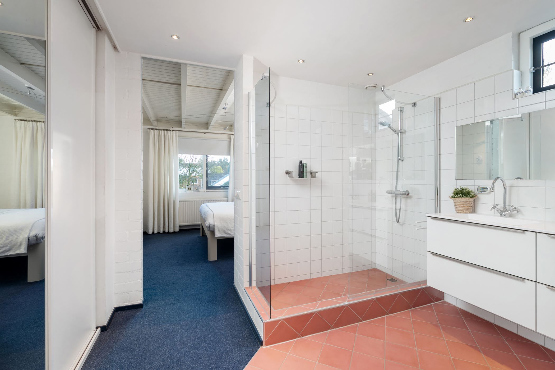 On the landing, there is a separate toilet and a second bathroom with shower, washbasin, shelf, and mirror.